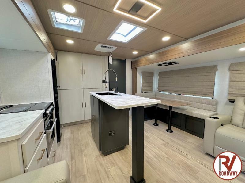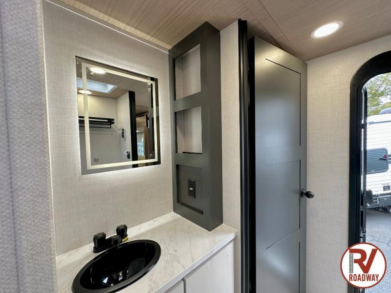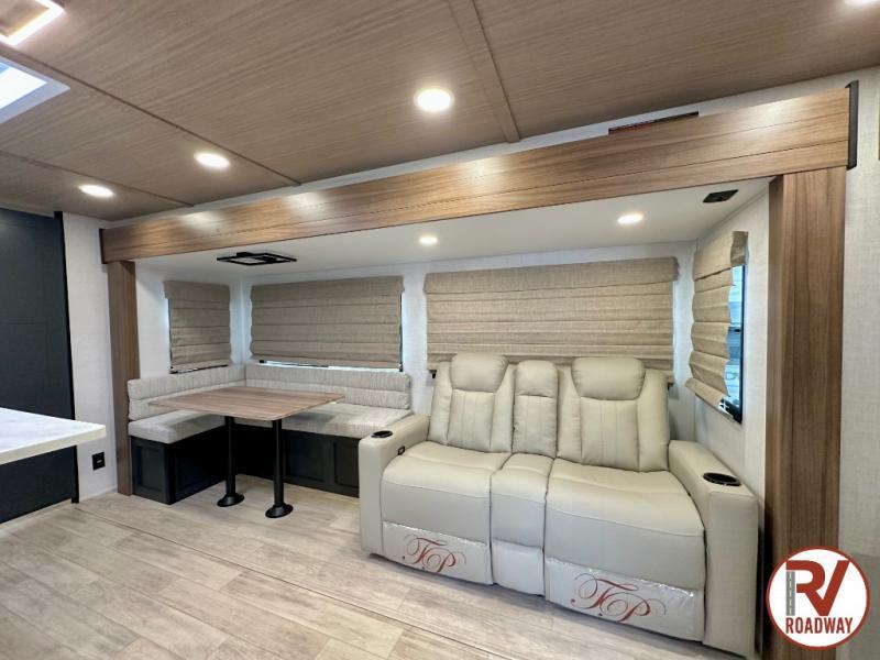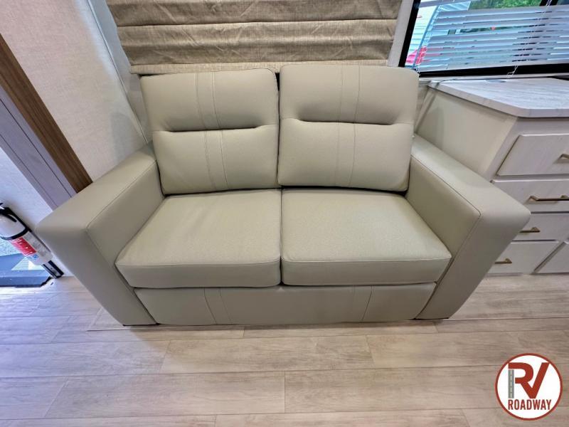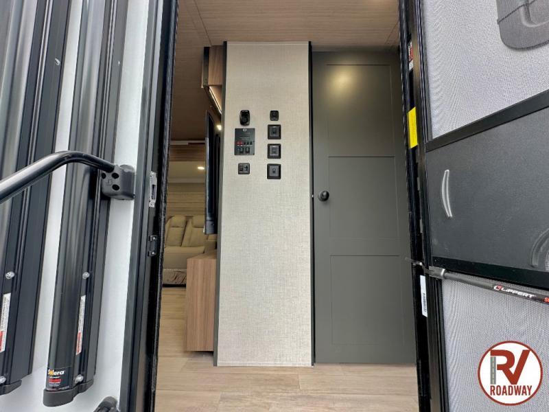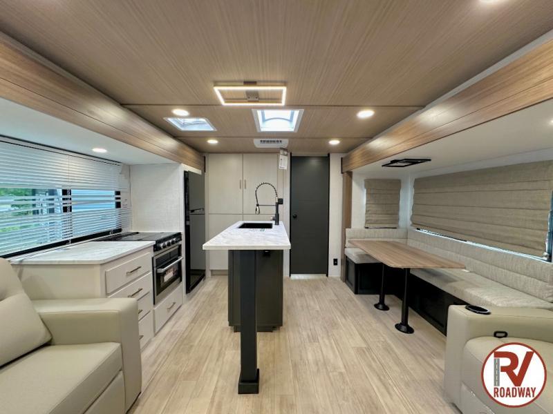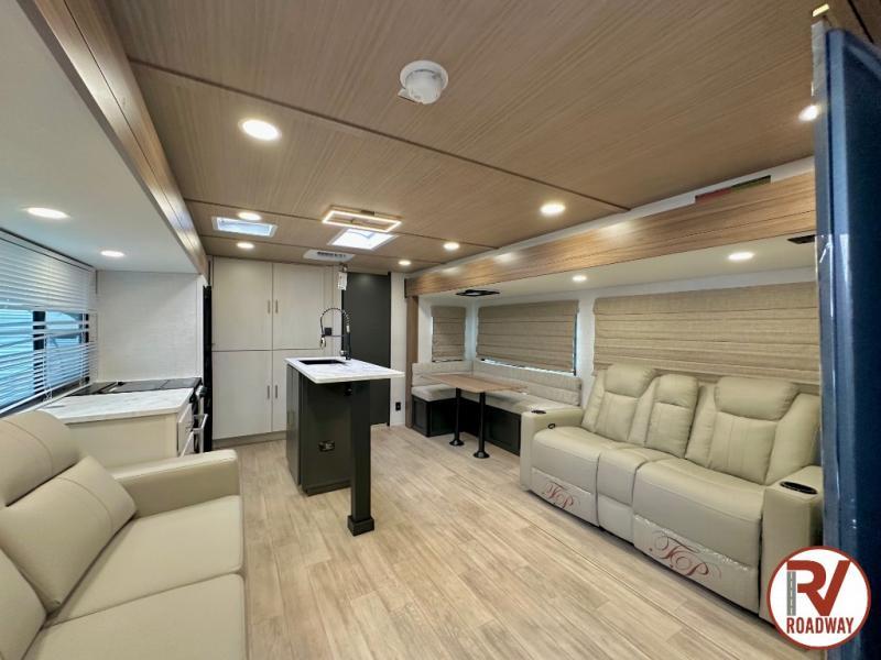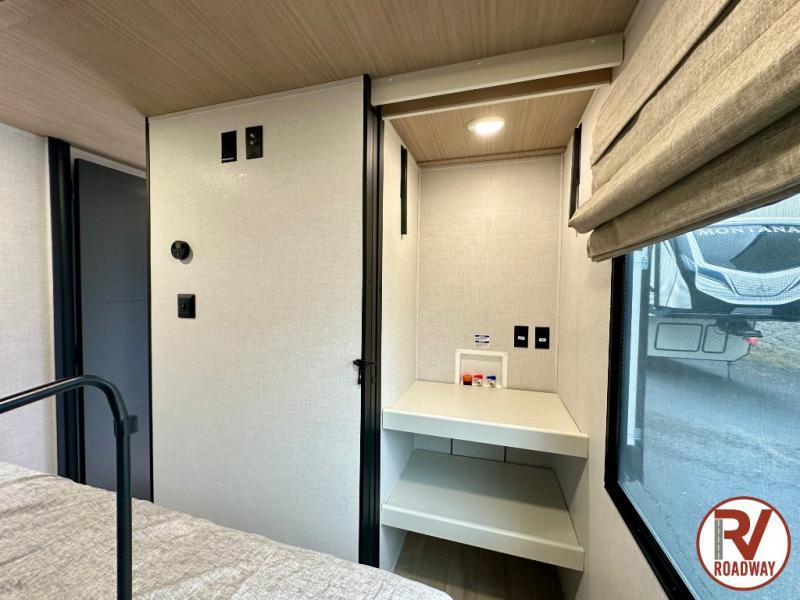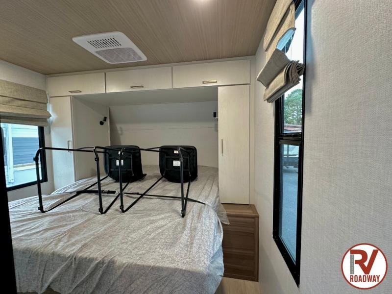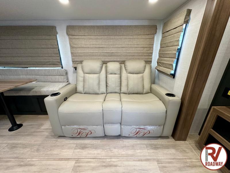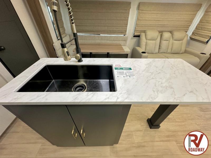 Whether you enjoy spending time outdoors or indoors, there is something for everyone in this travel trailer. The large pass-through storage can store your fishing poles, and the 20' electric awning with LED lights will create an outdoor living space. There is even an outdoor refrigerator with an outside storage cabinet and 32" TV! You will love all the interior space thanks to the dual opposing slides in the main living area, which will give the chef space to work around the kitchen island. Your crew can visit on the tri-fold sofa, theater seating and 5-person dinette while the fireplace is going, but you'll probably find the kids spending most of their time in the private bunkhouse! What more could you want in a travel trailer?!