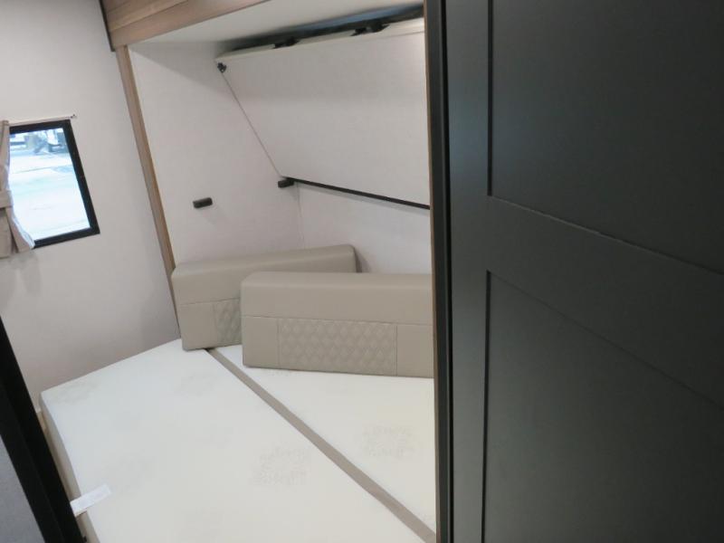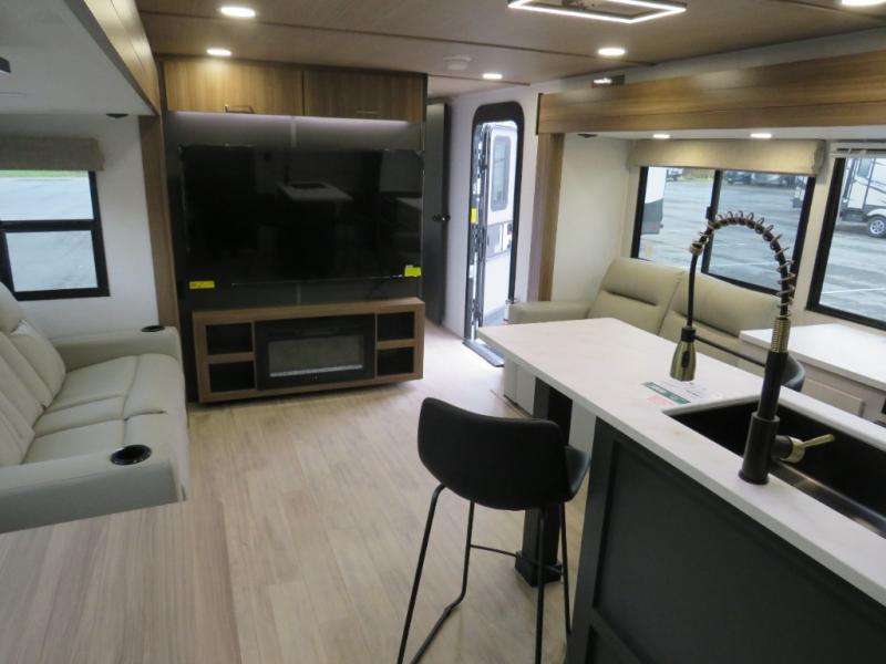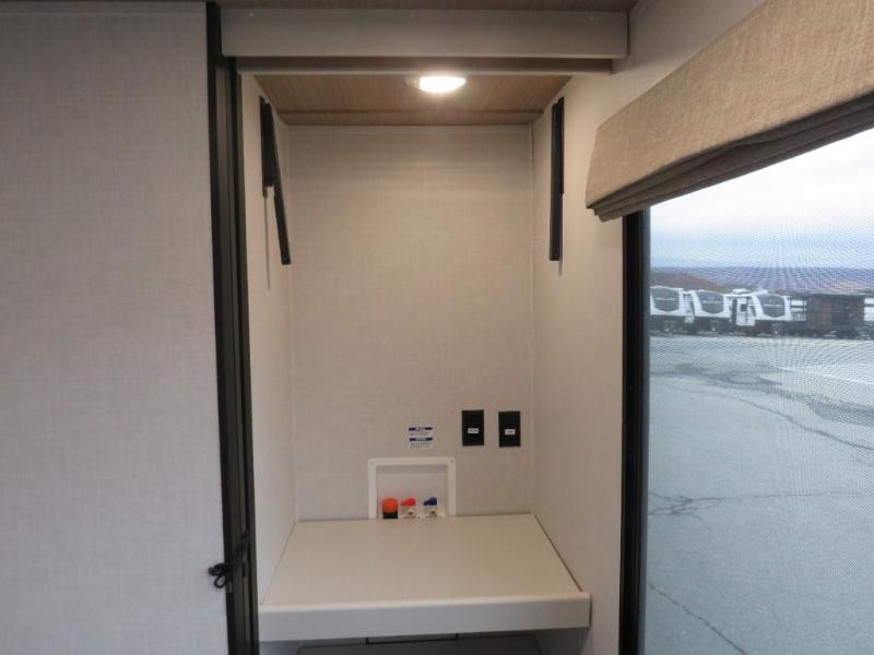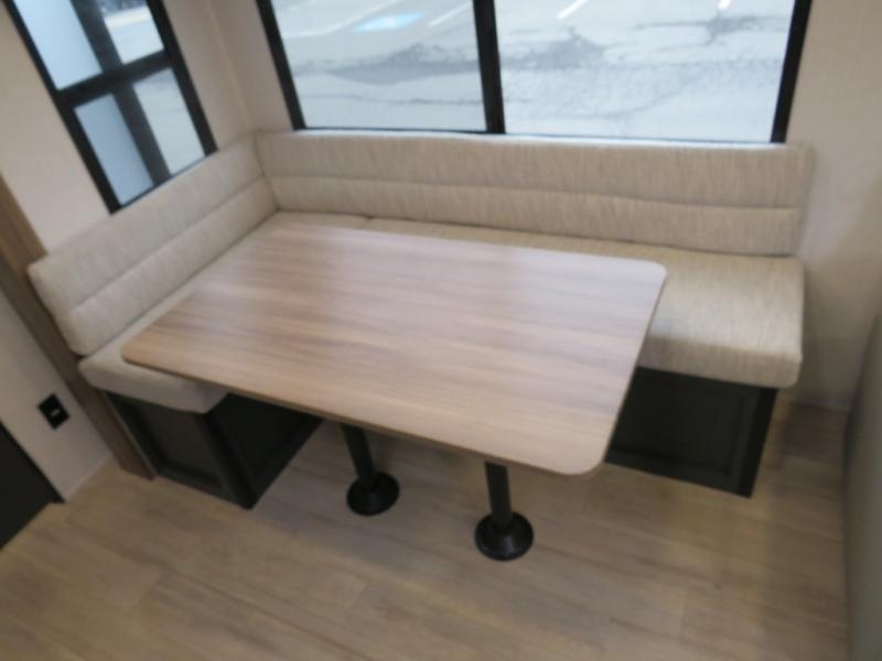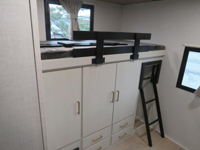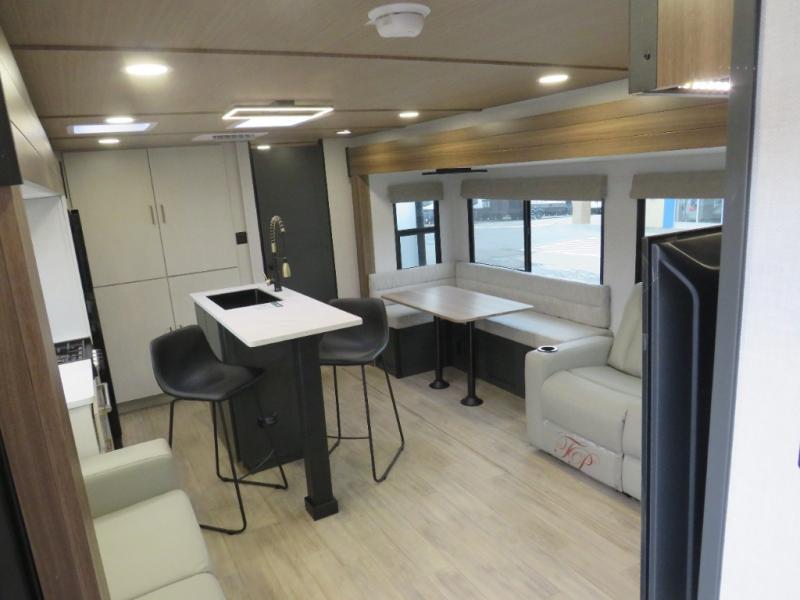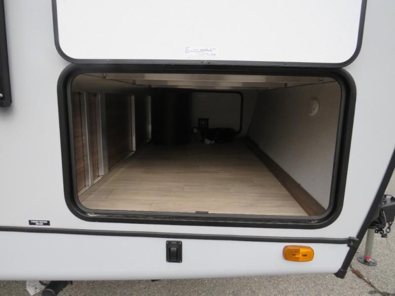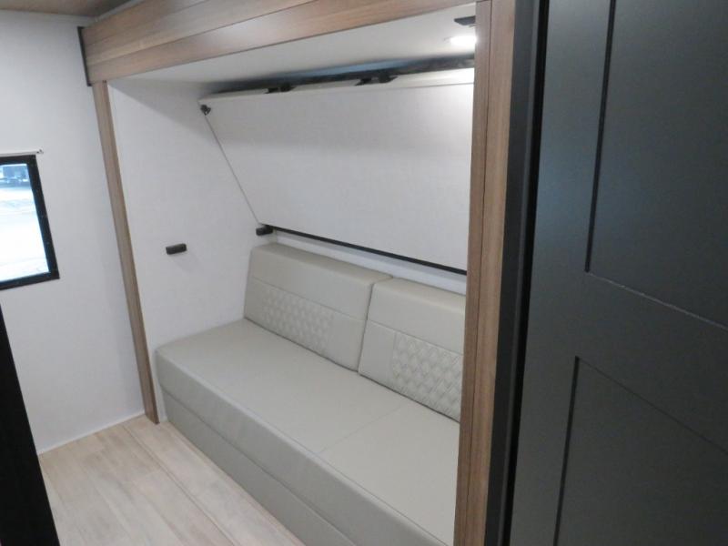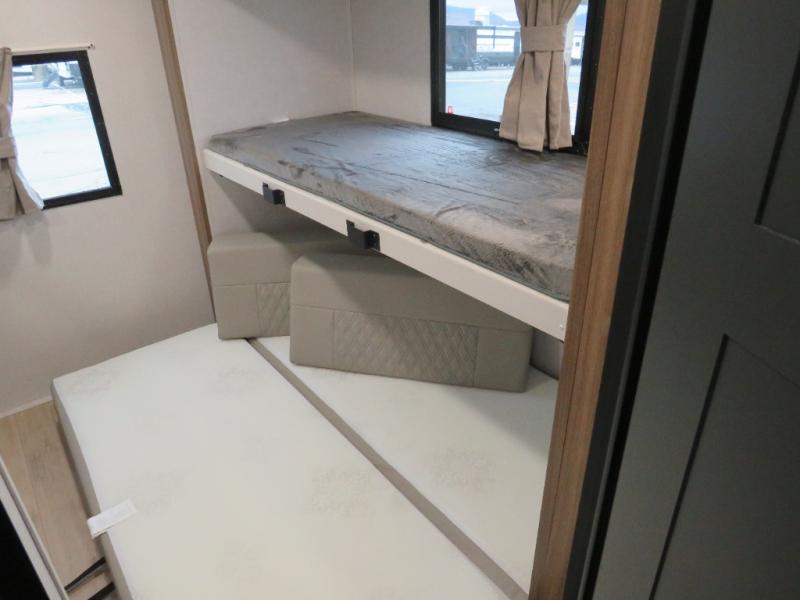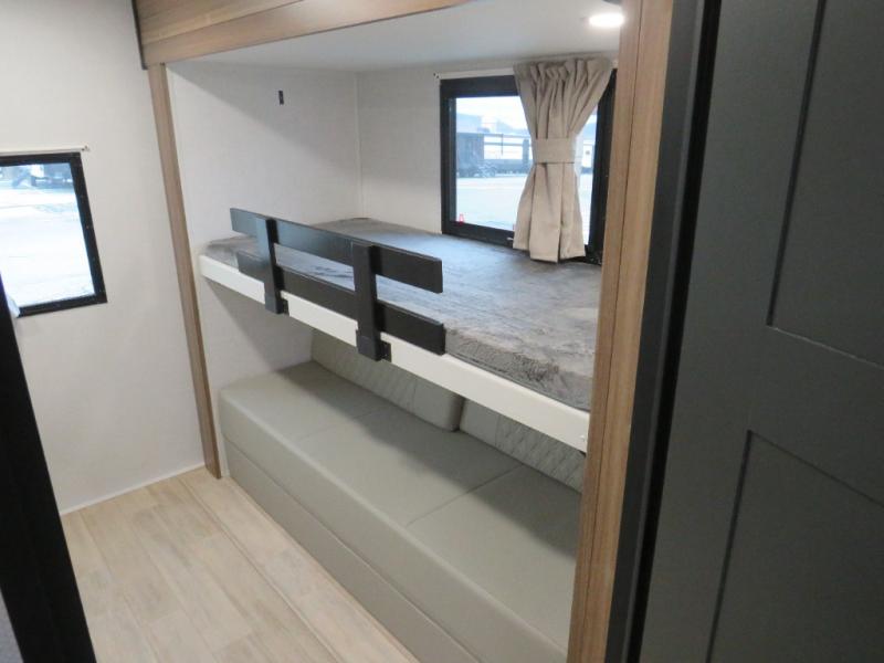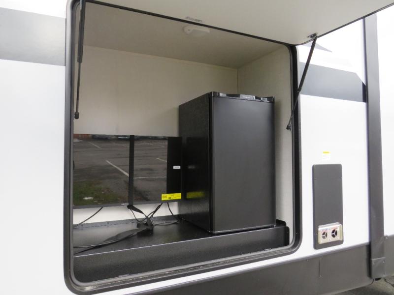 Whether you enjoy spending time outdoors or indoors, there is something for everyone in this travel trailer. The large pass-through storage can store your fishing poles, and the 20' electric awning with LED lights will create an outdoor living space. There is even an outdoor refrigerator with an outside storage cabinet and 32" TV! You will love all the interior space thanks to the dual opposing slides in the main living area, which will give the chef space to work around the kitchen island. Your crew can visit on the tri-fold sofa, theater seating and 5-person dinette while the fireplace is going, but you'll probably find the kids spending most of their time in the private bunkhouse! What more could you want in a travel trailer?!