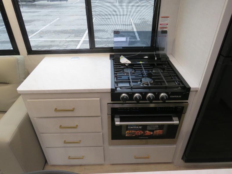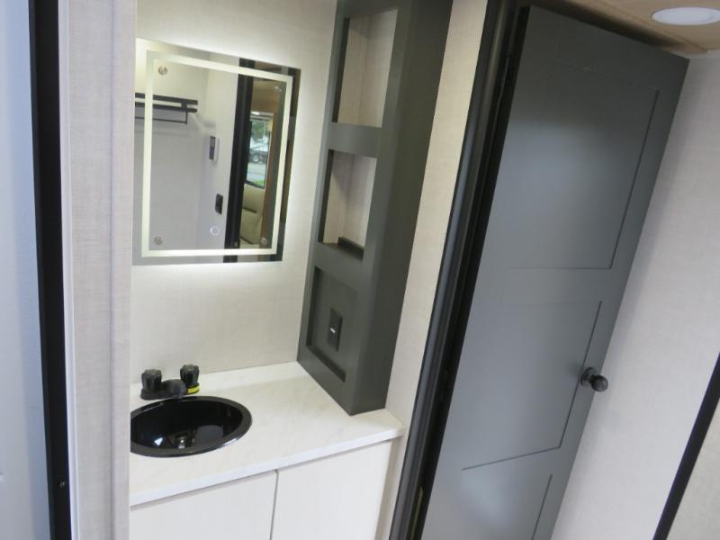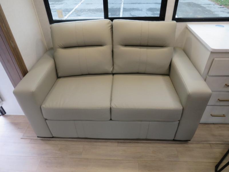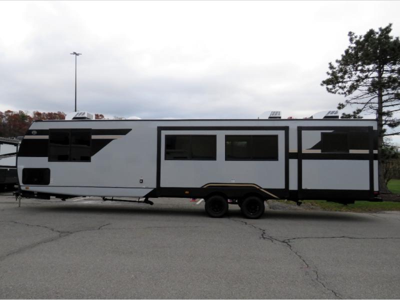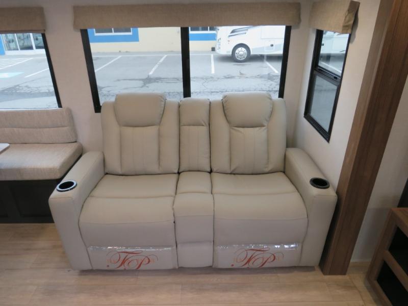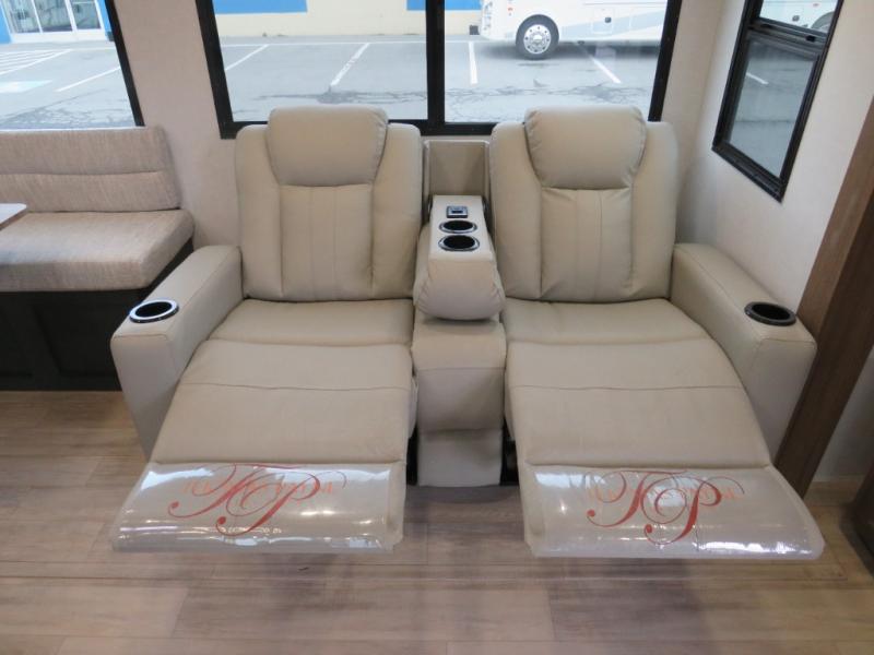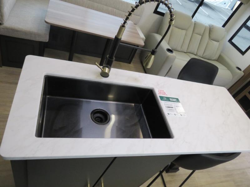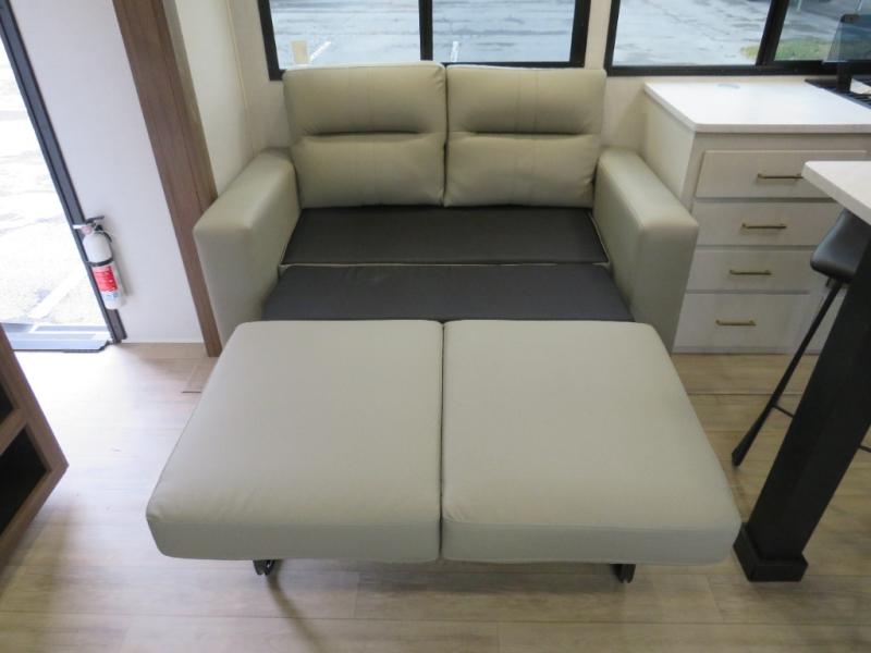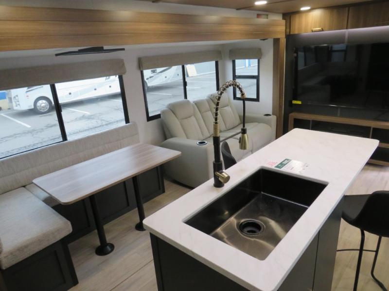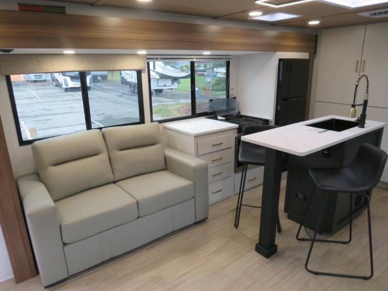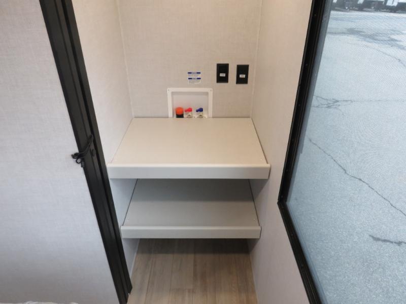 Whether you enjoy spending time outdoors or indoors, there is something for everyone in this travel trailer. The large pass-through storage can store your fishing poles, and the 20' electric awning with LED lights will create an outdoor living space. There is even an outdoor refrigerator with an outside storage cabinet and 32" TV! You will love all the interior space thanks to the dual opposing slides in the main living area, which will give the chef space to work around the kitchen island. Your crew can visit on the tri-fold sofa, theater seating and 5-person dinette while the fireplace is going, but you'll probably find the kids spending most of their time in the private bunkhouse! What more could you want in a travel trailer?!