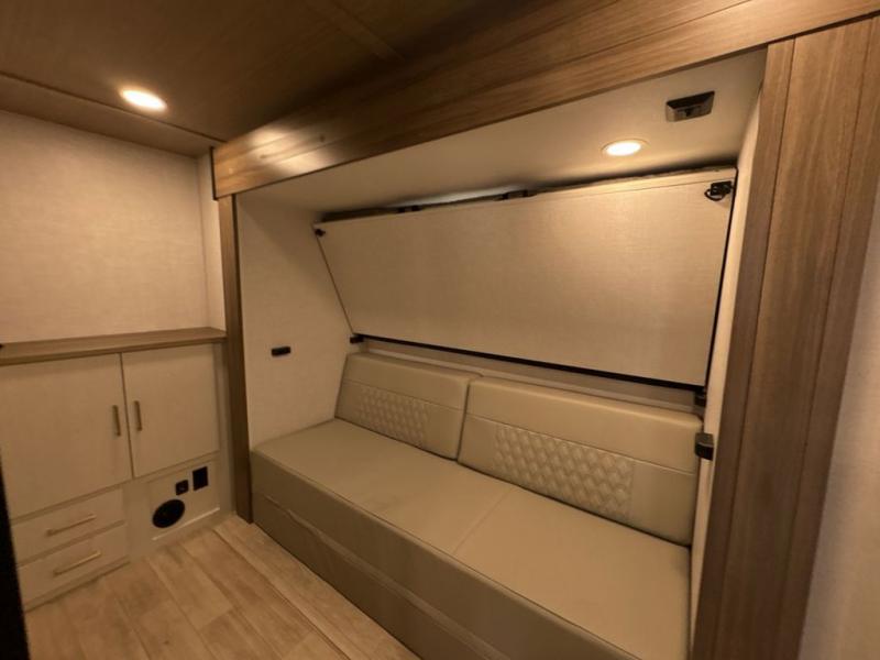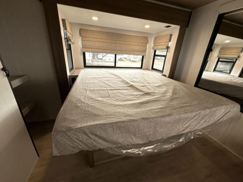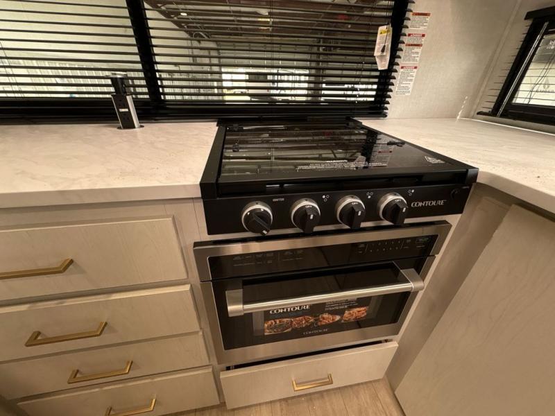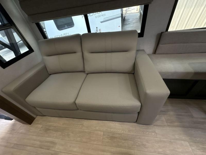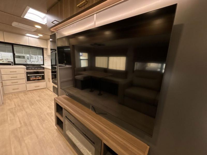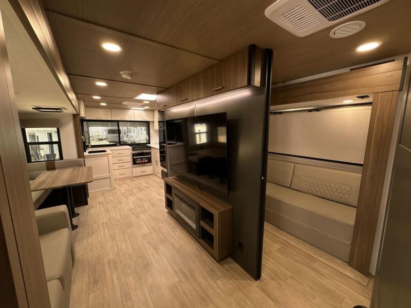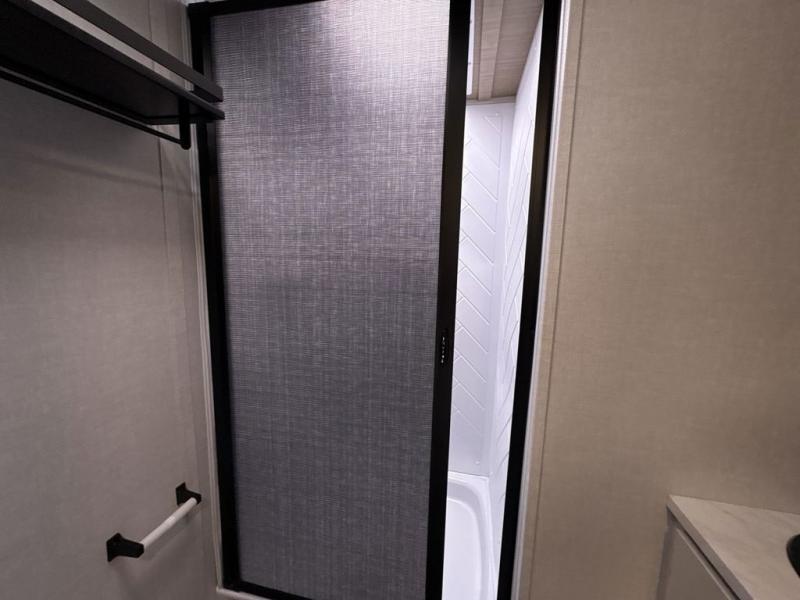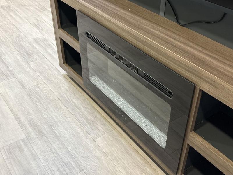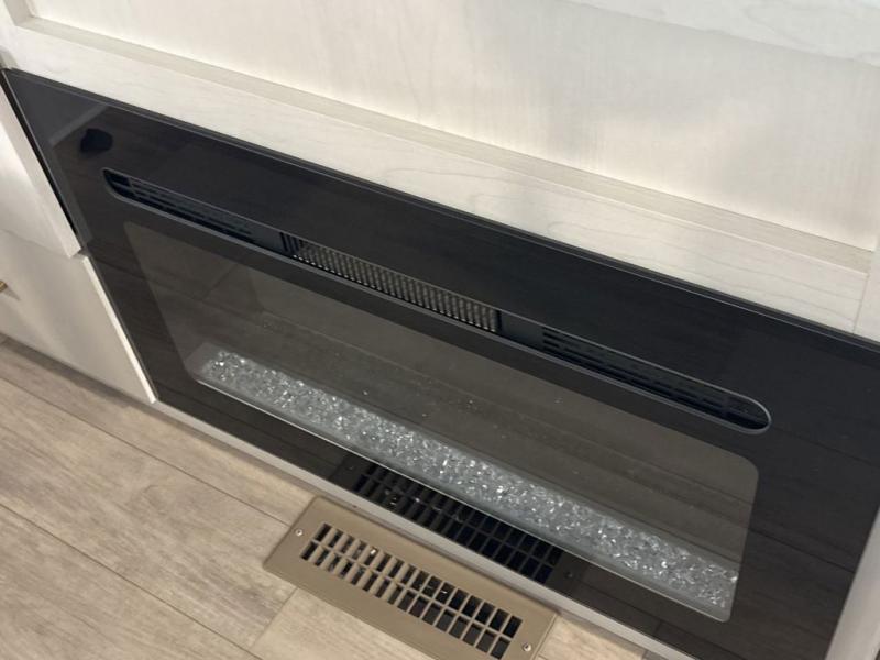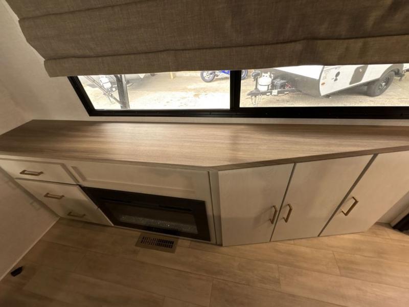 There is so much space in this Vibe travel trailer! Two bedrooms mean you can always find a quiet spot. The bunkroom has a versa queen bed plus a 30" x 74" bunk, with a wardrobe and shelves. The sliding door saves floor space in your living room. Up front you will find a main bedroom with a king bed in a slide for even more room, plus a full-width walk-in closet for maximum storage. Don't overlook the underbed storage and dresser too! The common area features an L-shaped 5-person dinette and a tri-fold sofa, cozily arranged around the entertainment center with TV and fireplace. And to top it all off, the rear kitchen provides a great space for the cook - out of the way but with everything you might need! A large pantry, sink, electric oven will be perfect for meal prep. A skylight lets you enjoy the weather while you cook.