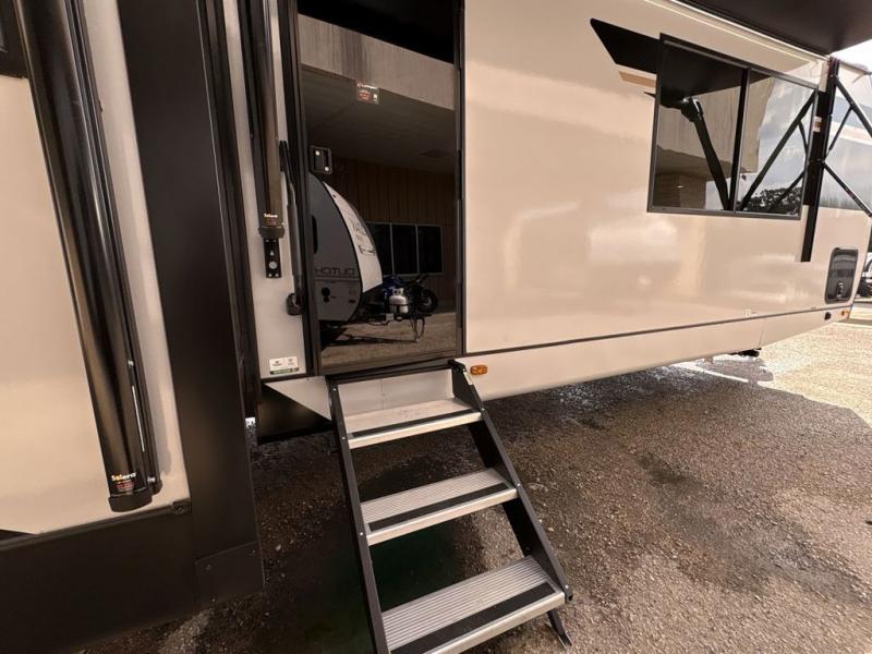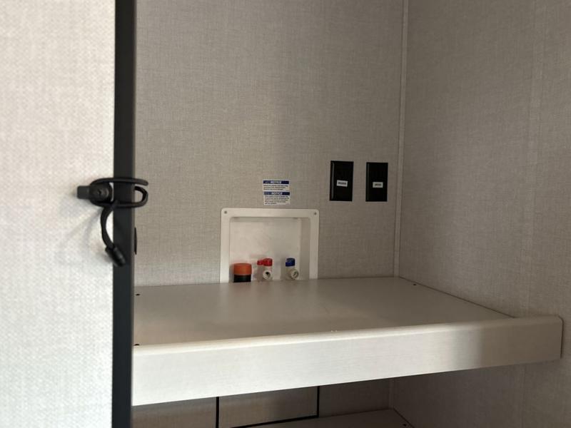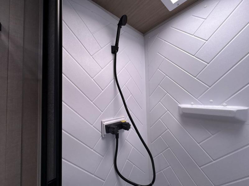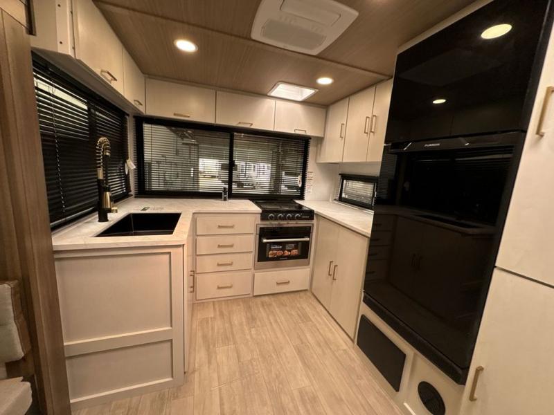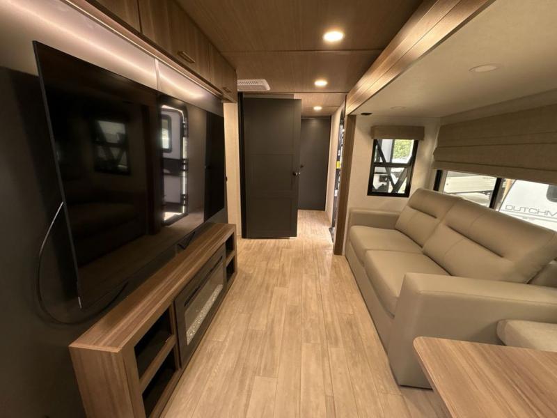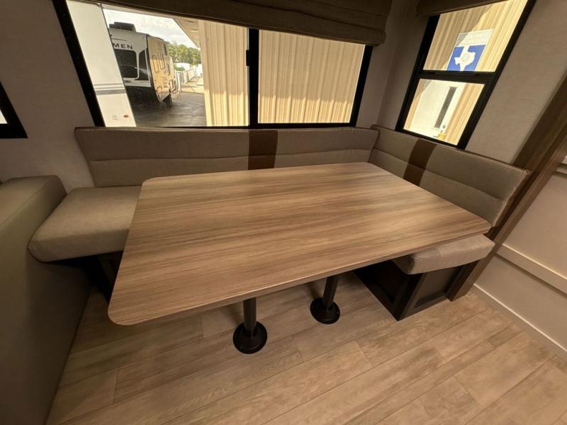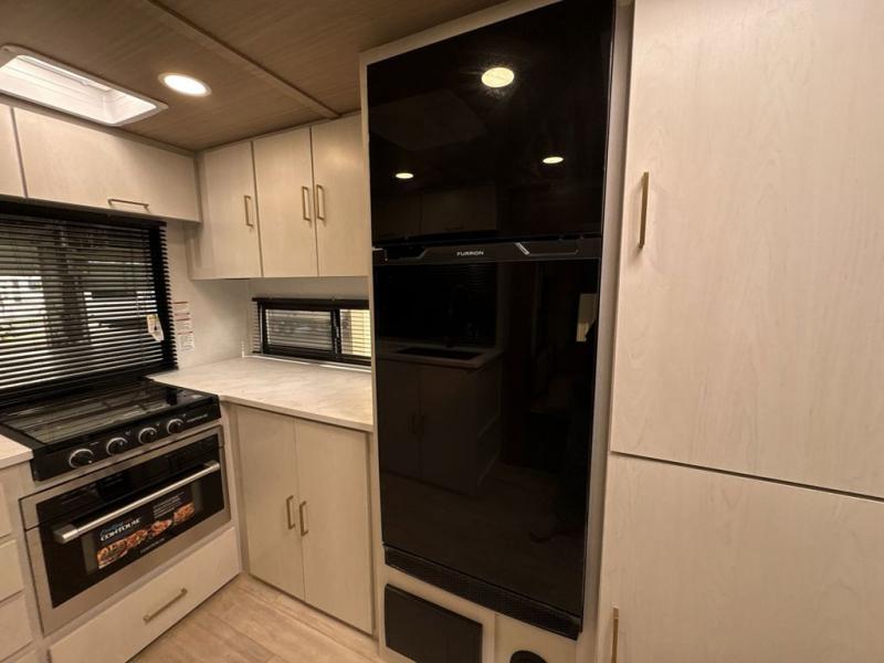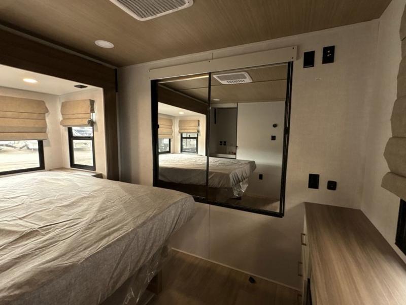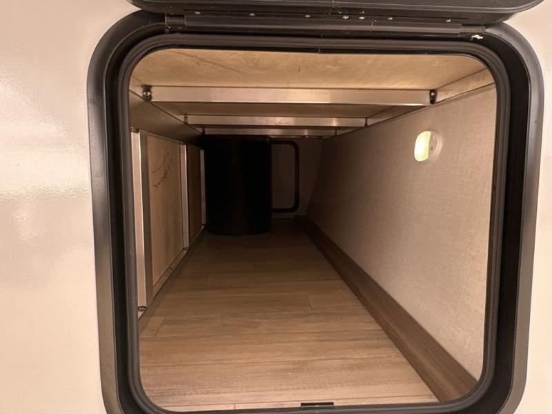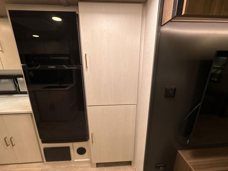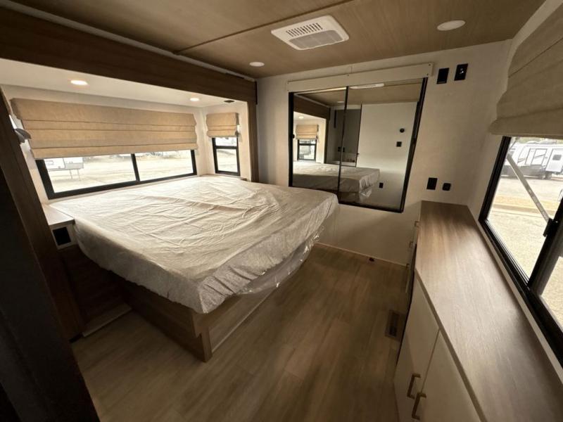 There is so much space in this Vibe travel trailer! Two bedrooms mean you can always find a quiet spot. The bunkroom has a versa queen bed plus a 30" x 74" bunk, with a wardrobe and shelves. The sliding door saves floor space in your living room. Up front you will find a main bedroom with a king bed in a slide for even more room, plus a full-width walk-in closet for maximum storage. Don't overlook the underbed storage and dresser too! The common area features an L-shaped 5-person dinette and a tri-fold sofa, cozily arranged around the entertainment center with TV and fireplace. And to top it all off, the rear kitchen provides a great space for the cook - out of the way but with everything you might need! A large pantry, sink, electric oven will be perfect for meal prep. A skylight lets you enjoy the weather while you cook.