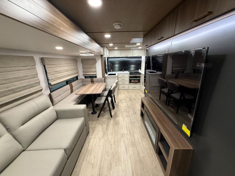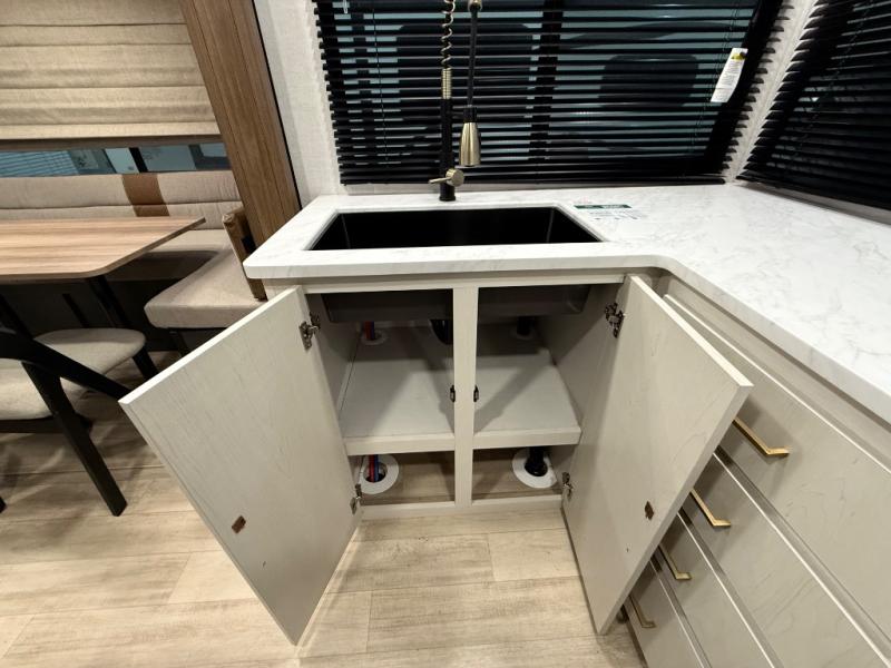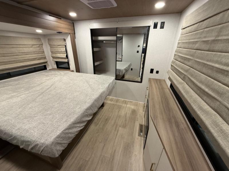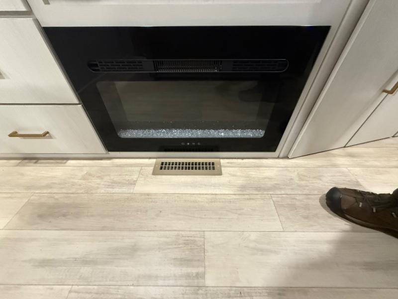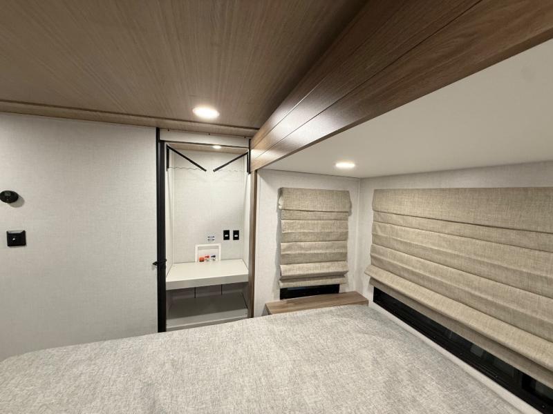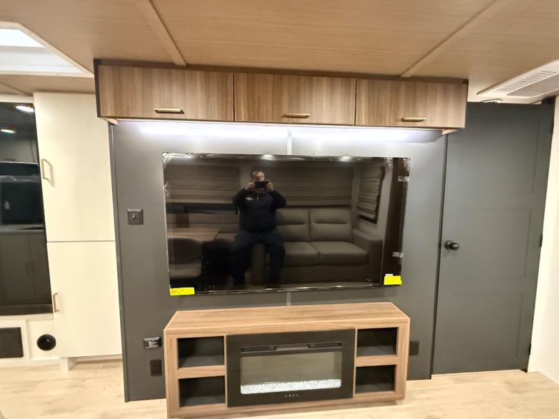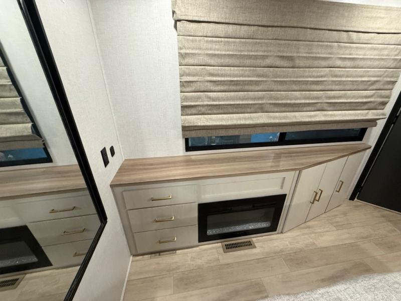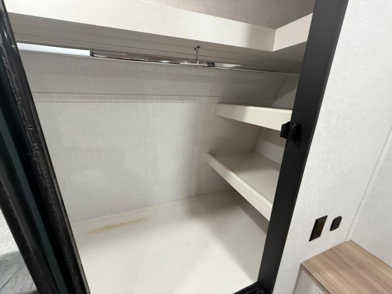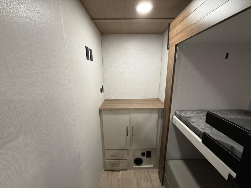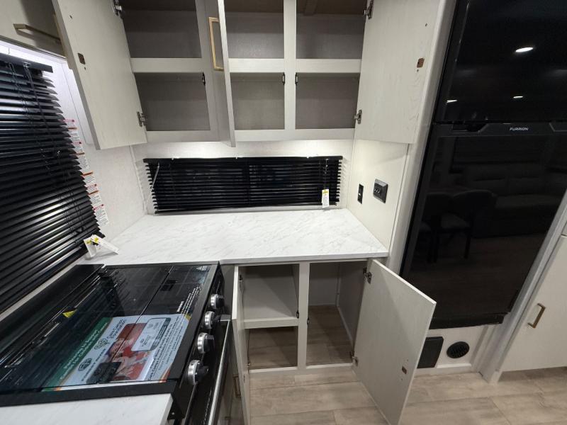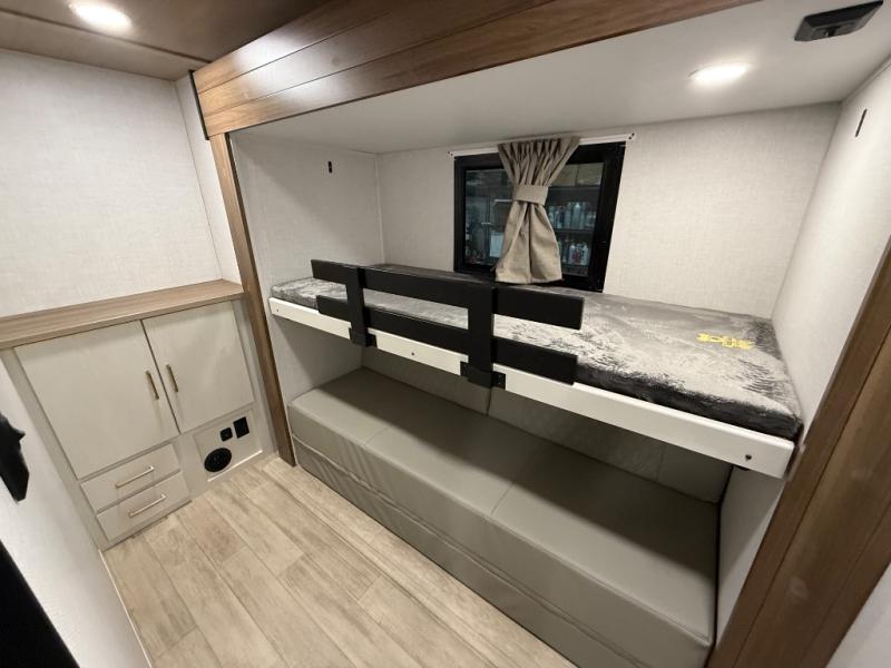 There is so much space in this Vibe travel trailer! Two bedrooms mean you can always find a quiet spot. The bunkroom has a versa queen bed plus a 30" x 74" bunk, with a wardrobe and shelves. The sliding door saves floor space in your living room. Up front you will find a main bedroom with a king bed in a slide for even more room, plus a full-width walk-in closet for maximum storage. Don't overlook the underbed storage and dresser too! The common area features an L-shaped 5-person dinette and a tri-fold sofa, cozily arranged around the entertainment center with TV and fireplace. And to top it all off, the rear kitchen provides a great space for the cook - out of the way but with everything you might need! A large pantry, sink, electric oven will be perfect for meal prep. A skylight lets you enjoy the weather while you cook.