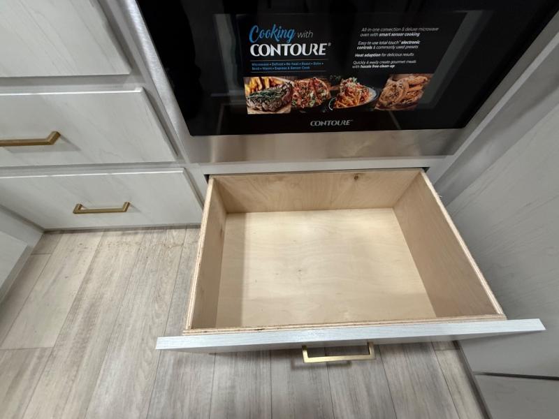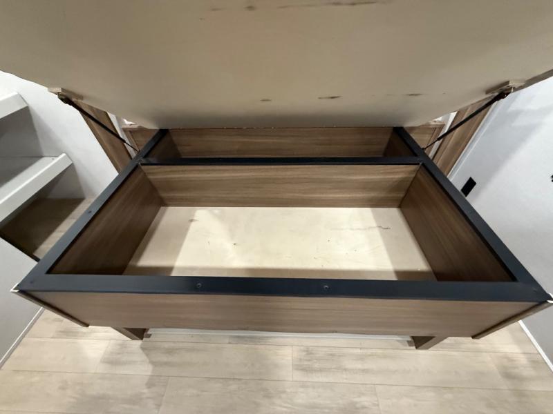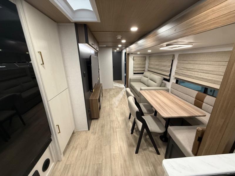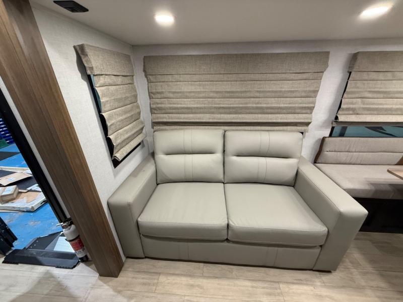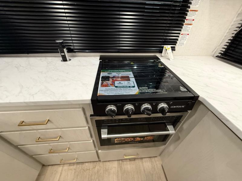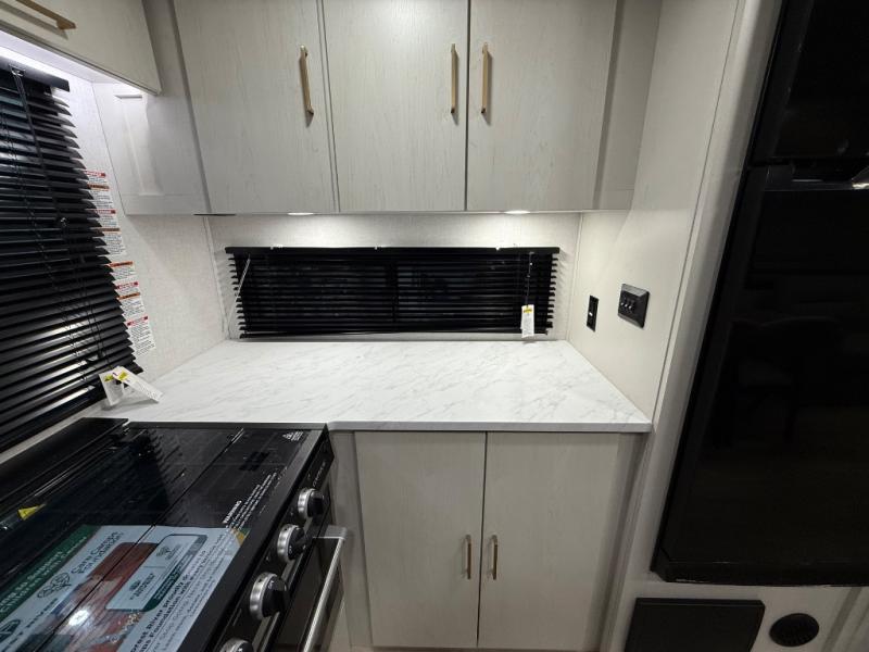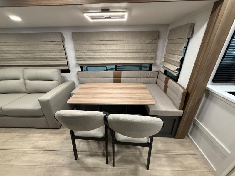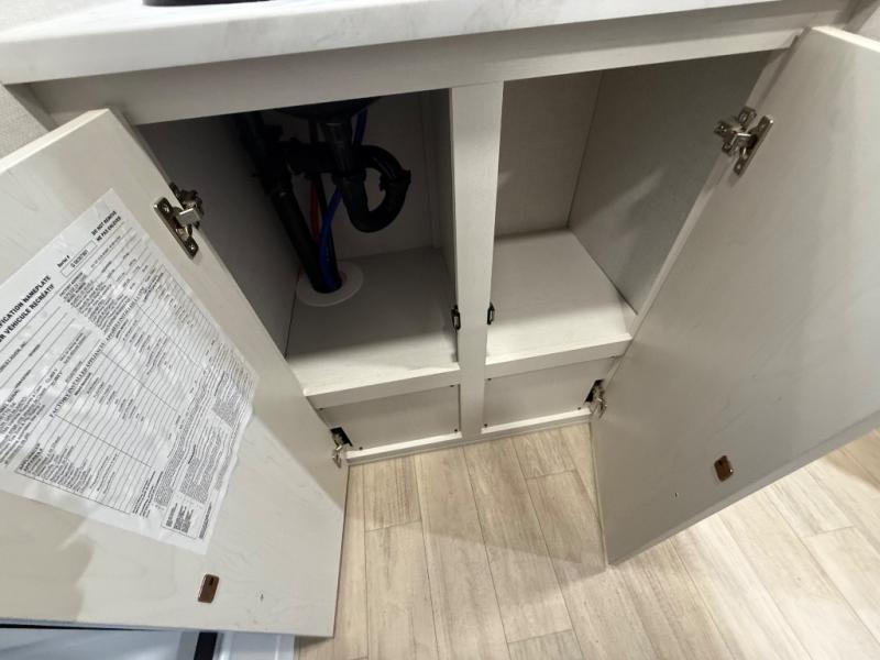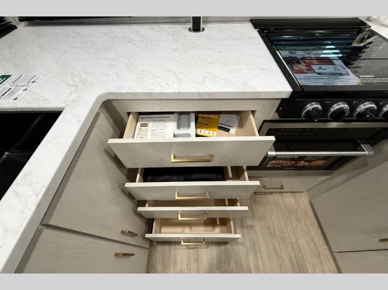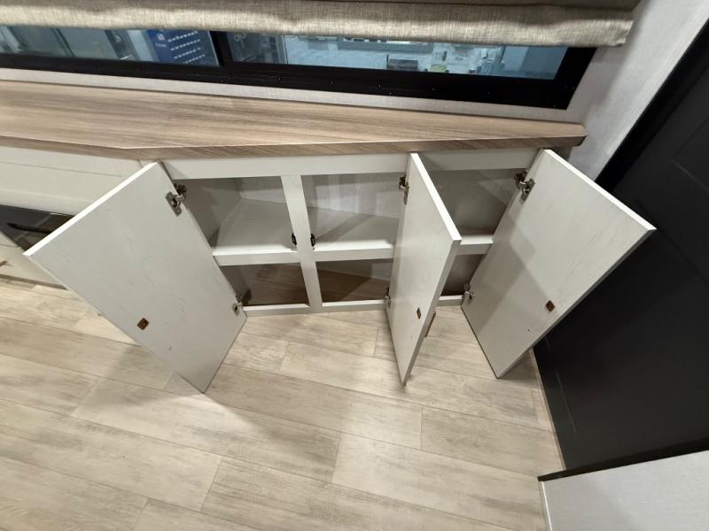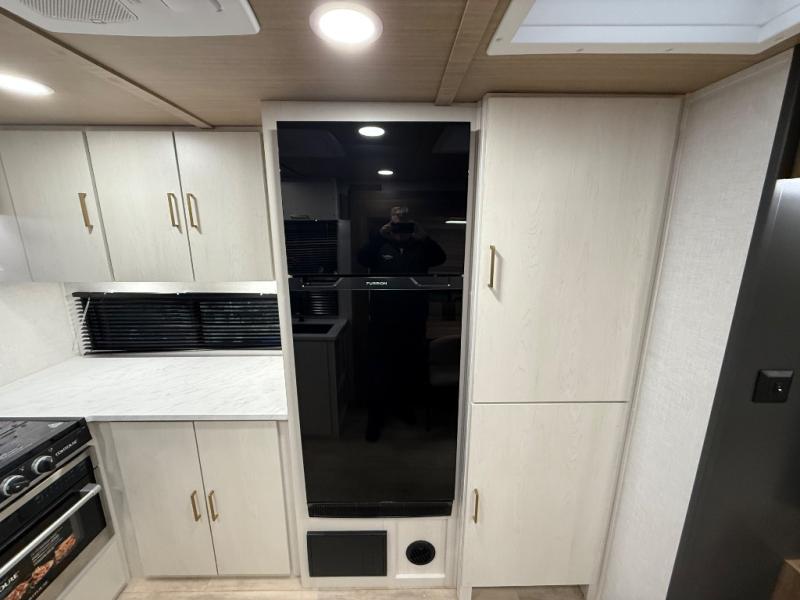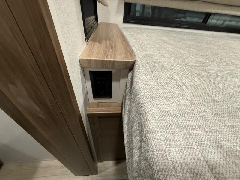 There is so much space in this Vibe travel trailer! Two bedrooms mean you can always find a quiet spot. The bunkroom has a versa queen bed plus a 30" x 74" bunk, with a wardrobe and shelves. The sliding door saves floor space in your living room. Up front you will find a main bedroom with a king bed in a slide for even more room, plus a full-width walk-in closet for maximum storage. Don't overlook the underbed storage and dresser too! The common area features an L-shaped 5-person dinette and a tri-fold sofa, cozily arranged around the entertainment center with TV and fireplace. And to top it all off, the rear kitchen provides a great space for the cook - out of the way but with everything you might need! A large pantry, sink, electric oven will be perfect for meal prep. A skylight lets you enjoy the weather while you cook.