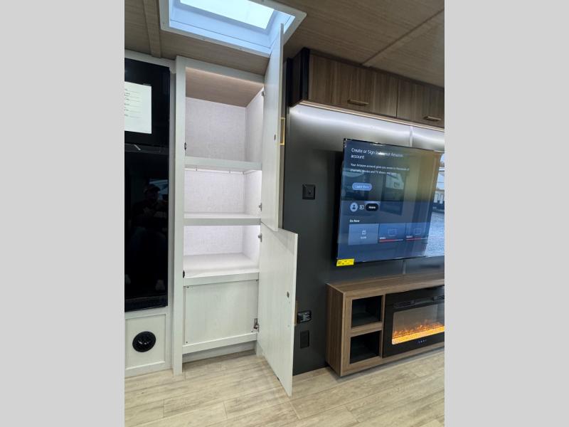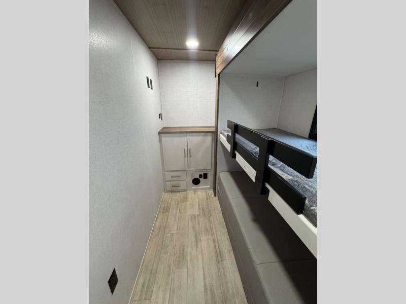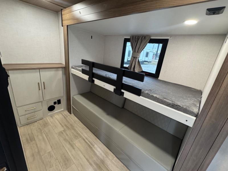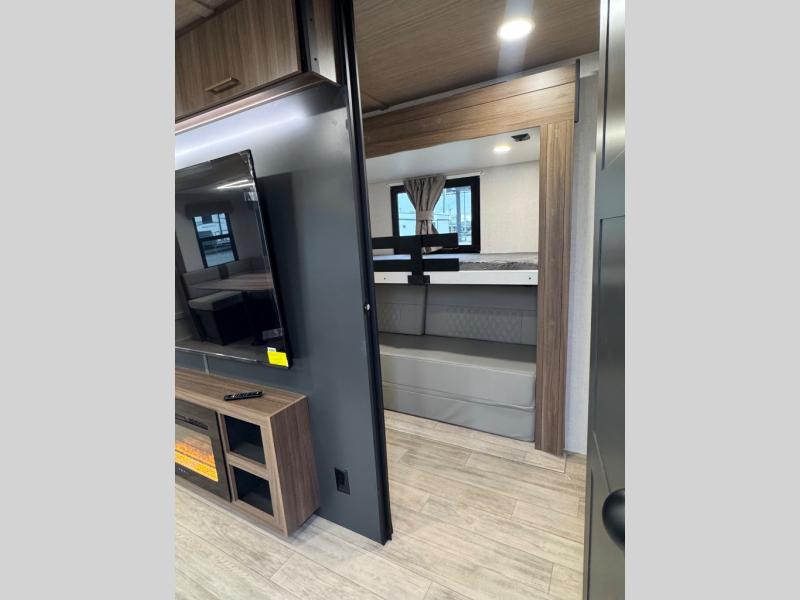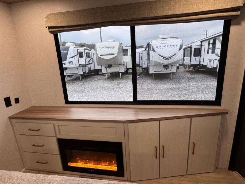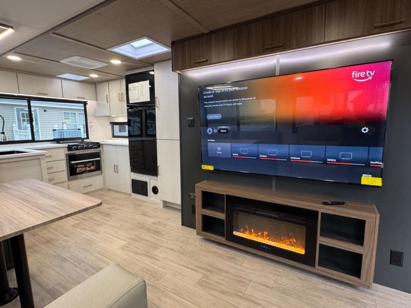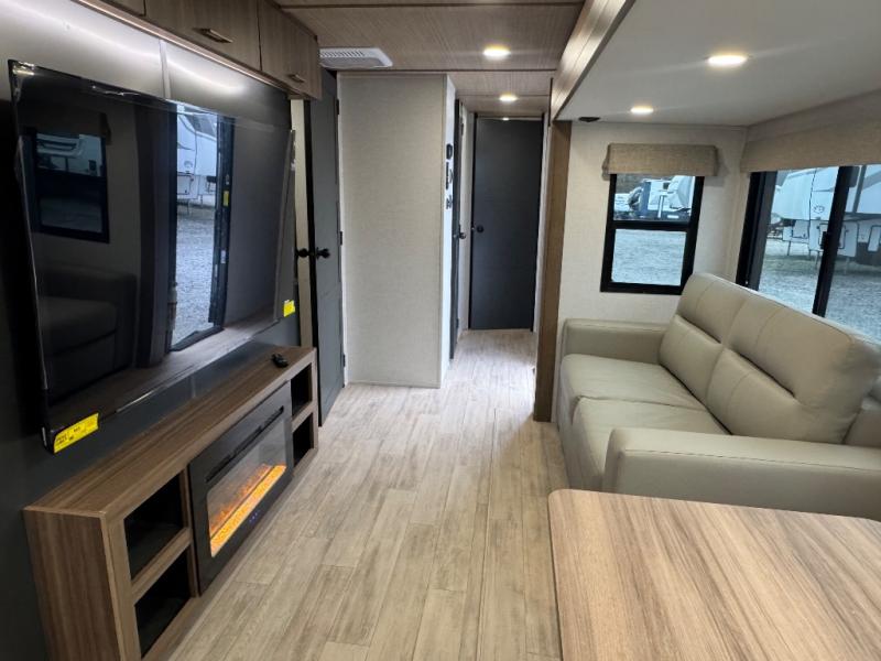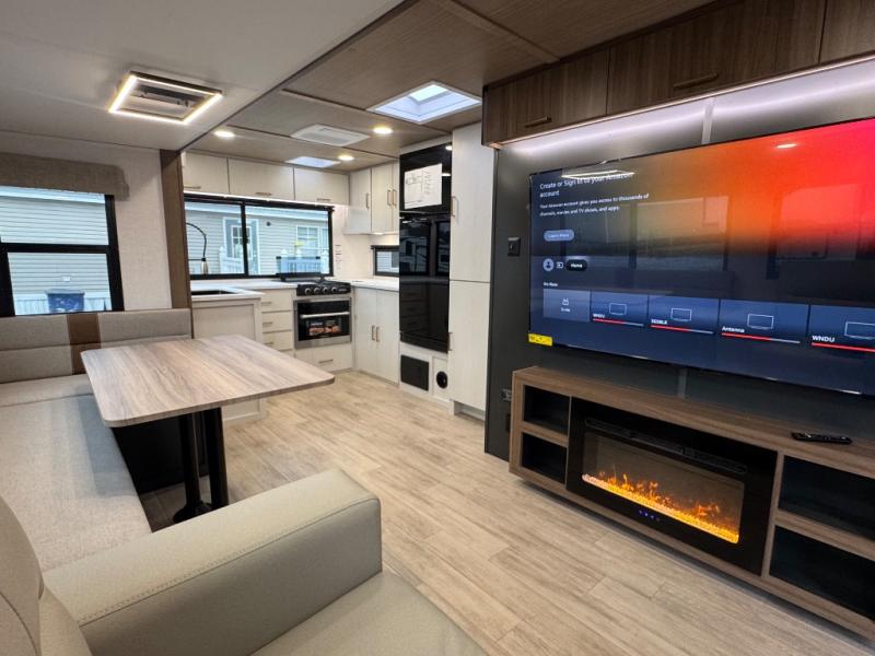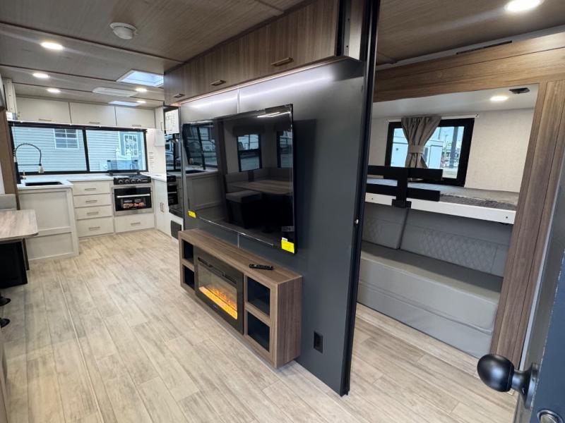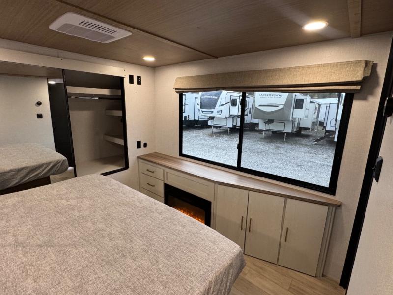 There is so much space in this Vibe travel trailer! Two bedrooms mean you can always find a quiet spot. The bunkroom has a versa queen bed plus a 30" x 74" bunk, with a wardrobe and shelves. The sliding door saves floor space in your living room. Up front you will find a main bedroom with a king bed in a slide for even more room, plus a full-width walk-in closet for maximum storage. Don't overlook the underbed storage and dresser too! The common area features an L-shaped 5-person dinette and a tri-fold sofa, cozily arranged around the entertainment center with TV and fireplace. And to top it all off, the rear kitchen provides a great space for the cook - out of the way but with everything you might need! A large pantry, sink, electric oven will be perfect for meal prep. A skylight lets you enjoy the weather while you cook.