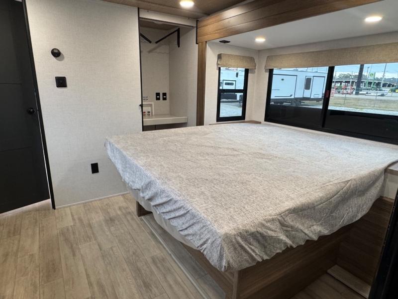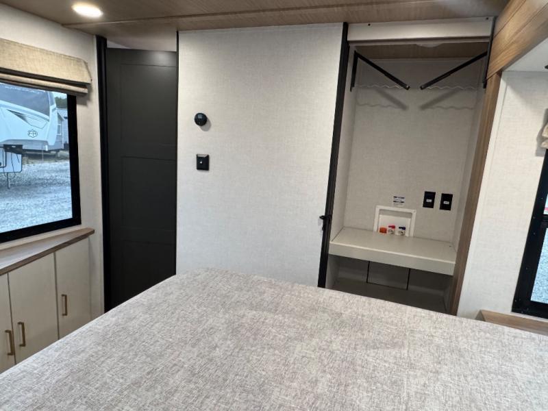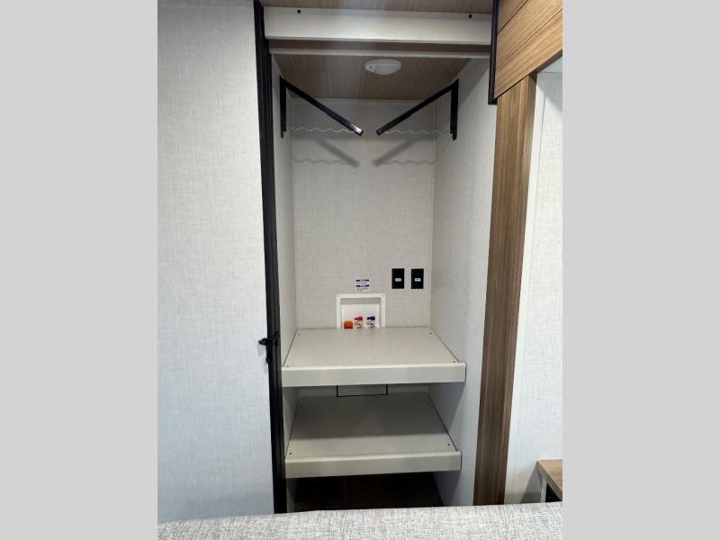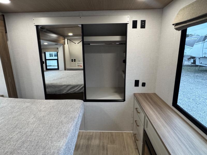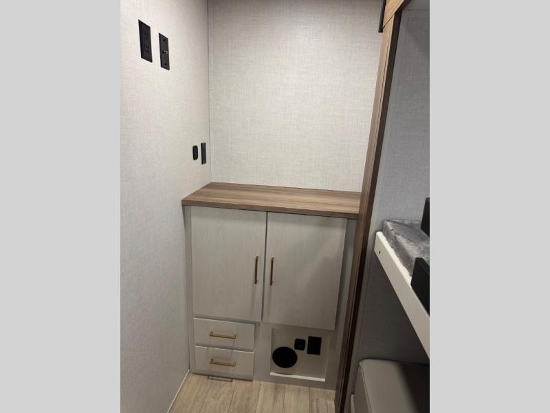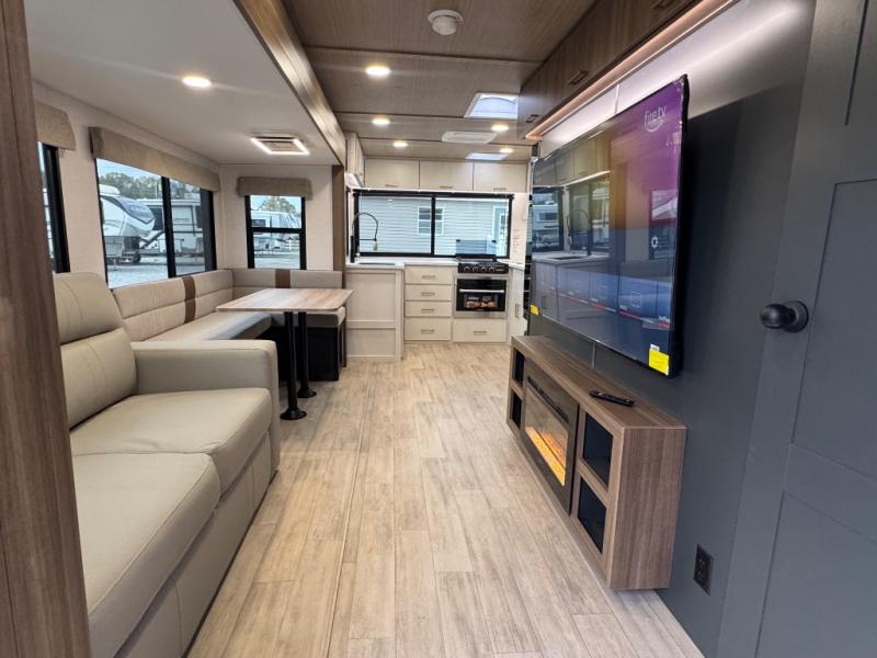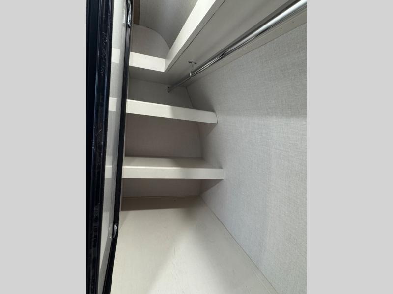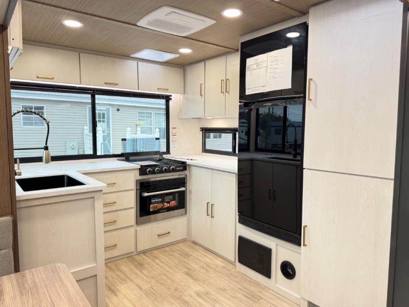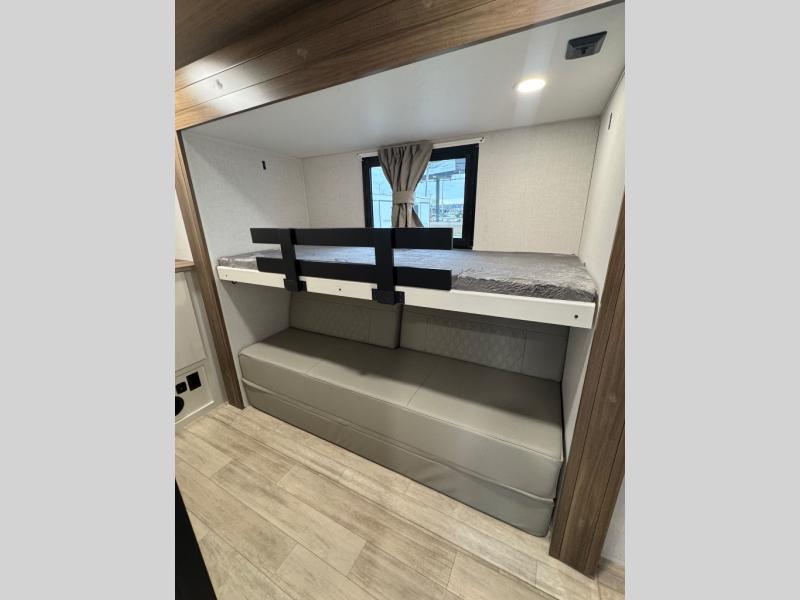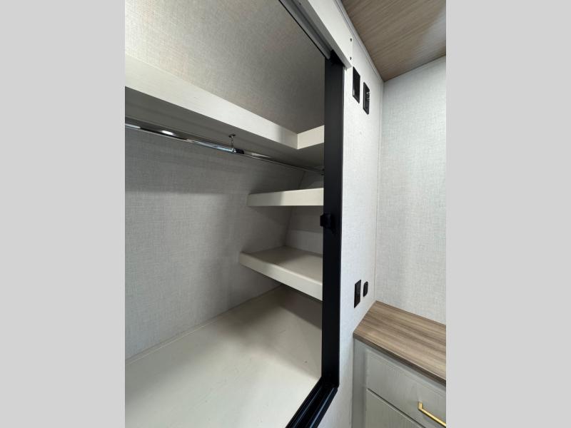 There is so much space in this Vibe travel trailer! Two bedrooms mean you can always find a quiet spot. The bunkroom has a versa queen bed plus a 30" x 74" bunk, with a wardrobe and shelves. The sliding door saves floor space in your living room. Up front you will find a main bedroom with a king bed in a slide for even more room, plus a full-width walk-in closet for maximum storage. Don't overlook the underbed storage and dresser too! The common area features an L-shaped 5-person dinette and a tri-fold sofa, cozily arranged around the entertainment center with TV and fireplace. And to top it all off, the rear kitchen provides a great space for the cook - out of the way but with everything you might need! A large pantry, sink, electric oven will be perfect for meal prep. A skylight lets you enjoy the weather while you cook.