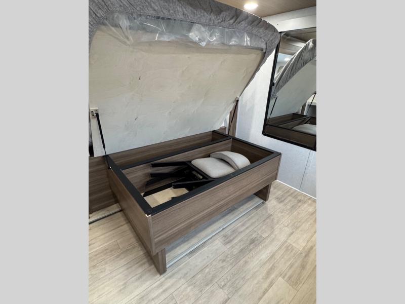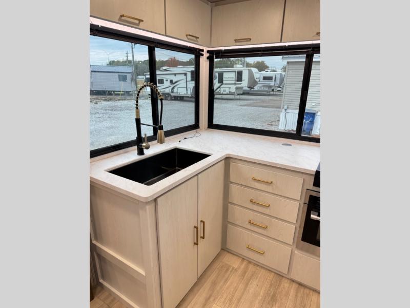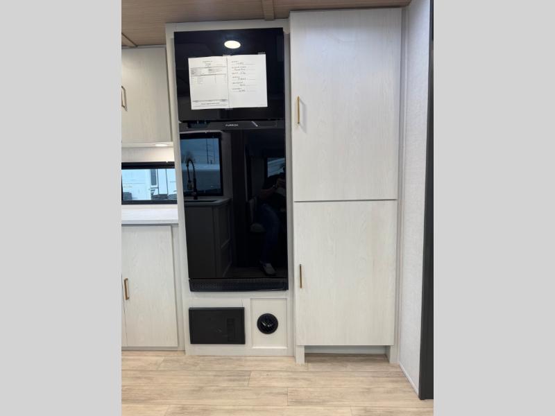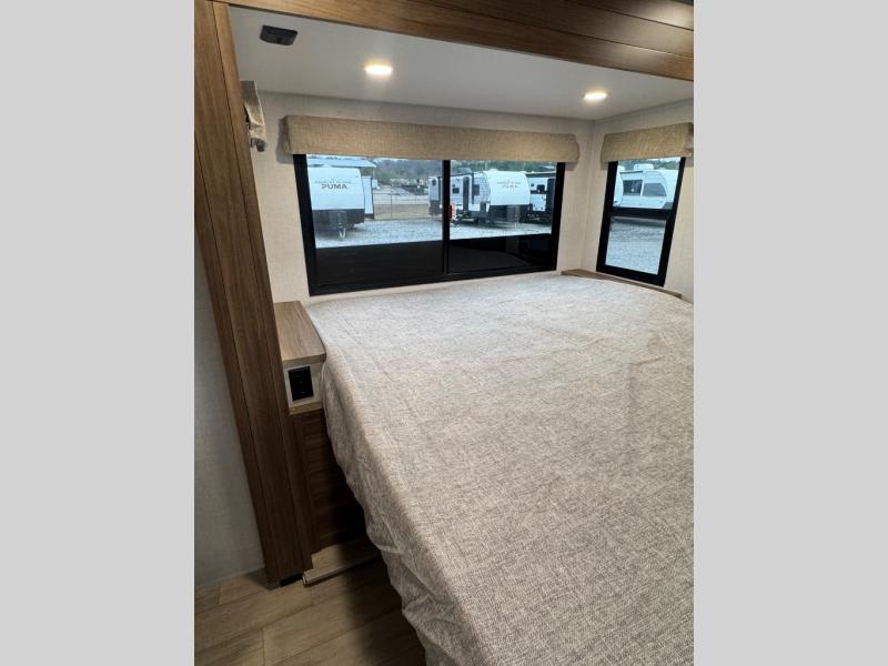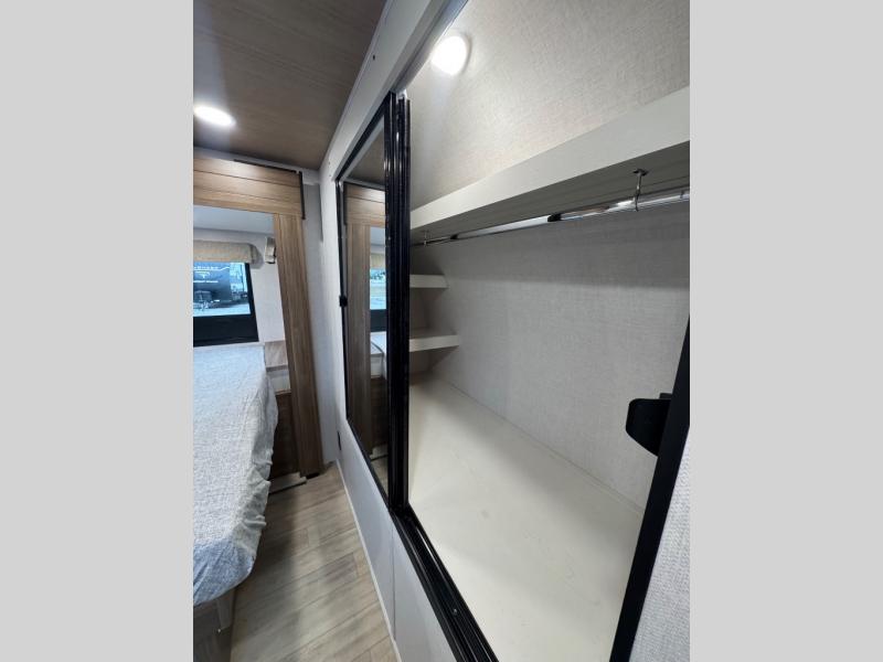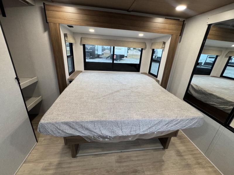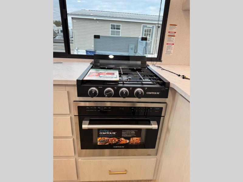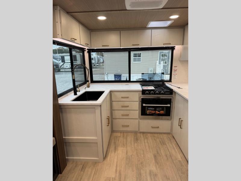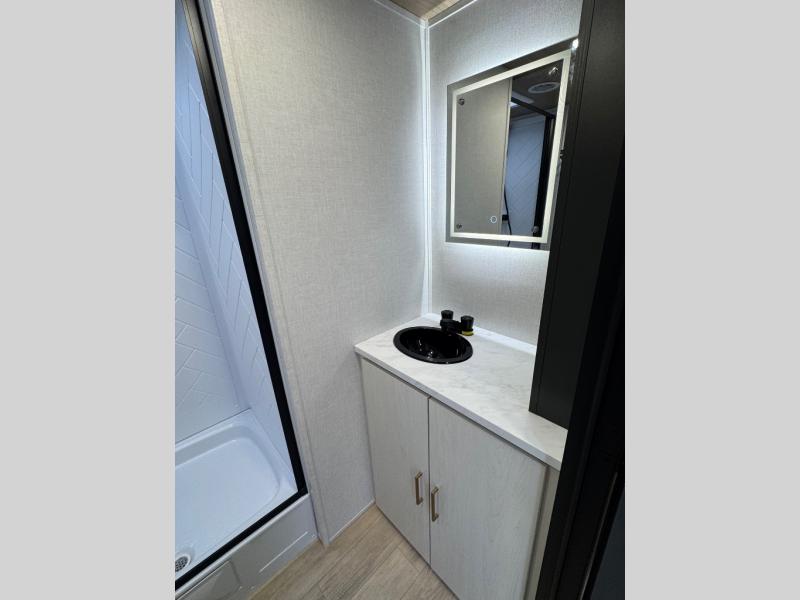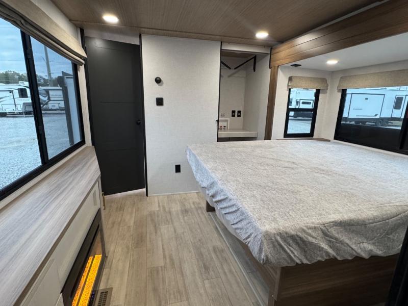 There is so much space in this Vibe travel trailer! Two bedrooms mean you can always find a quiet spot. The bunkroom has a versa queen bed plus a 30" x 74" bunk, with a wardrobe and shelves. The sliding door saves floor space in your living room. Up front you will find a main bedroom with a king bed in a slide for even more room, plus a full-width walk-in closet for maximum storage. Don't overlook the underbed storage and dresser too! The common area features an L-shaped 5-person dinette and a tri-fold sofa, cozily arranged around the entertainment center with TV and fireplace. And to top it all off, the rear kitchen provides a great space for the cook - out of the way but with everything you might need! A large pantry, sink, electric oven will be perfect for meal prep. A skylight lets you enjoy the weather while you cook.
