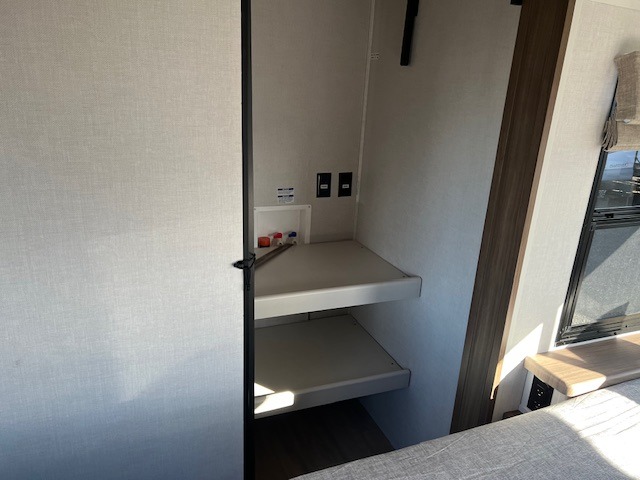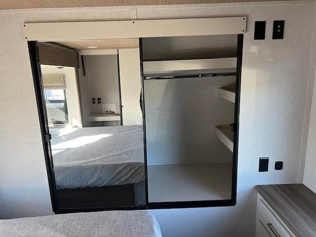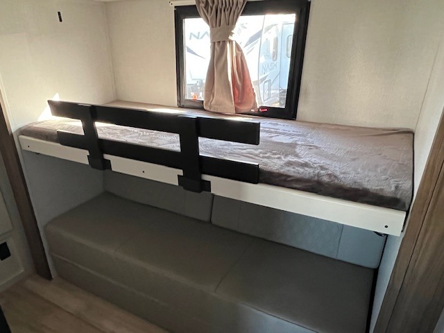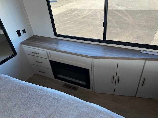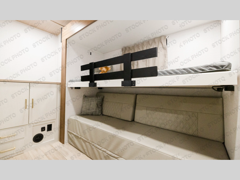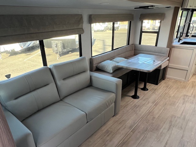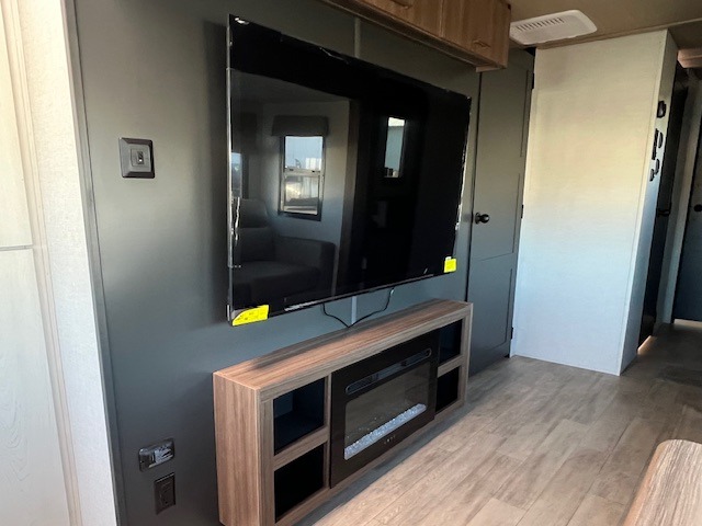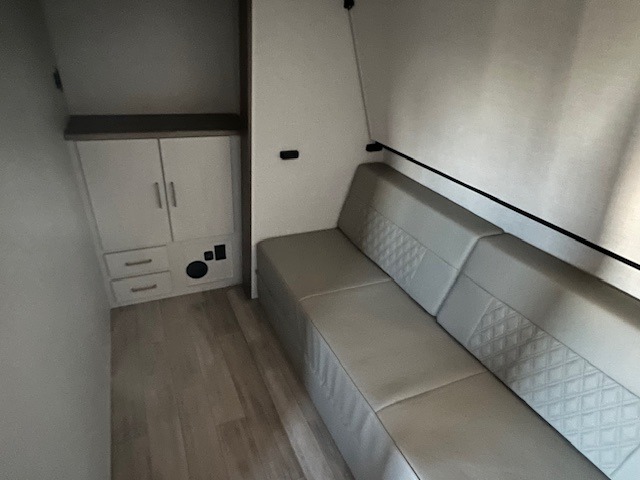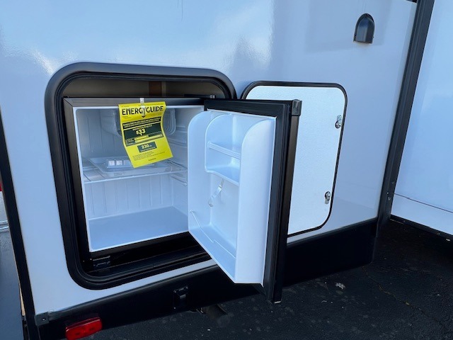 There is so much space in this Vibe travel trailer! Two bedrooms mean you can always find a quiet spot. The bunkroom has a versa bed with a bunk above, plus storage space for clothes and shoes. Up front you will find a main bedroom with a king bed in a slide for even more room, plus a full-width walk-in closet for maximum storage. Don't overlook generous storage and bedroom fireplace too! The common area features an L-shaped 5-person dinette and sofa, allowing you to dine and relax each day. And to top it all off, the rear kitchen provides a great space for the cook with everything they might need! A large pantry, sink, 3-In-1 convection oven, and 10.7 cu. ft. 12V refrigerator!