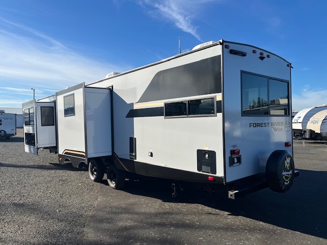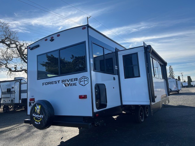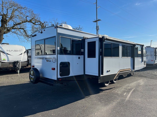 With any Vibe travel trailer by Forest River, you will enjoy comfort at every turn! There is a Norco huck-bolted steel frame, an enclosed underbelly with 12V heating pads, and a PVC roof membrane for added durability. You will also find a universal docking station outside, along with slam latch doors, and the largest square windows in its class. Inside, you'll find a 6' 8" ceiling height, an oversized residential-style sink, no carpet for easier cleaning, plus premium residential-style furniture for all around comfort. Each model is also prepped for a back-up camera, an On-The-Go ladder attachment, and solar power, allowing you to upgrade your travel trailer if you choose!