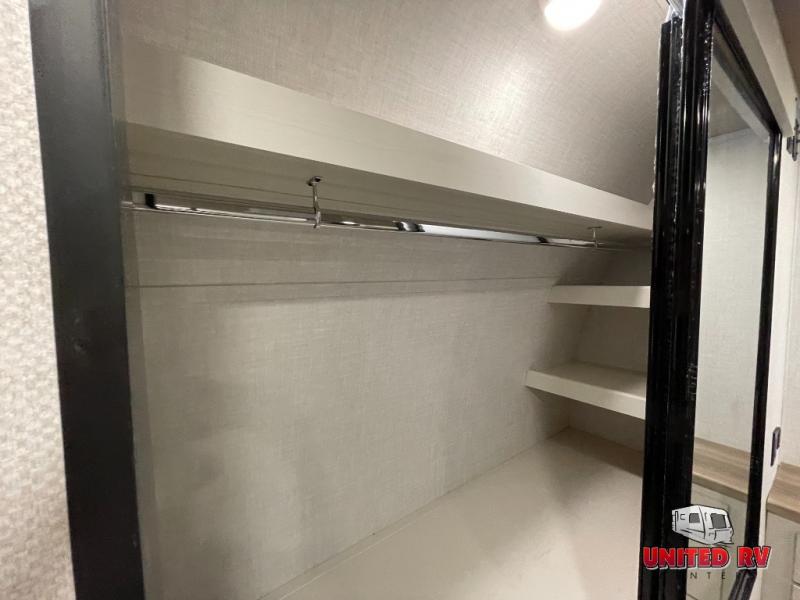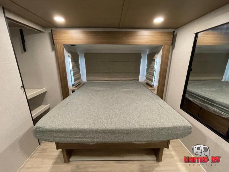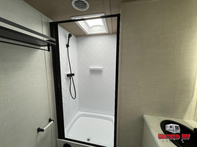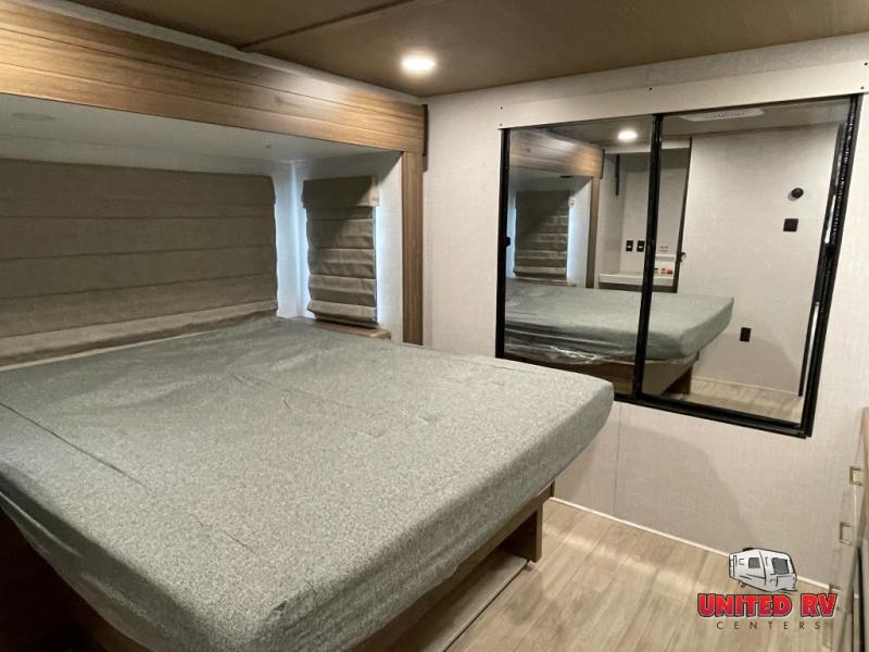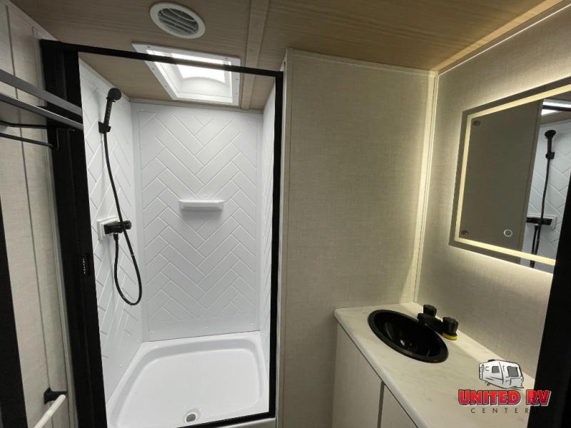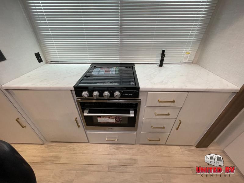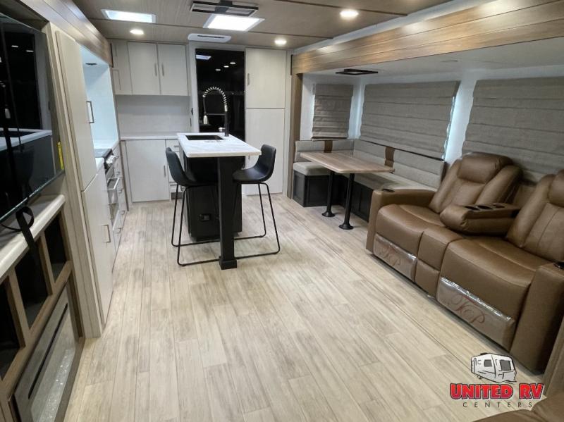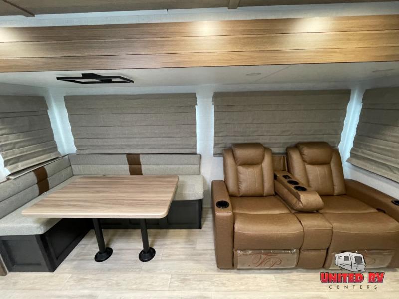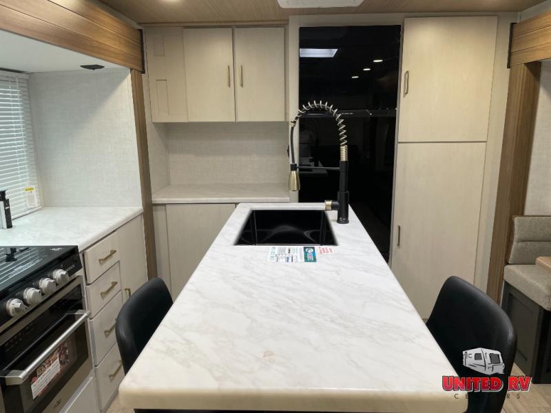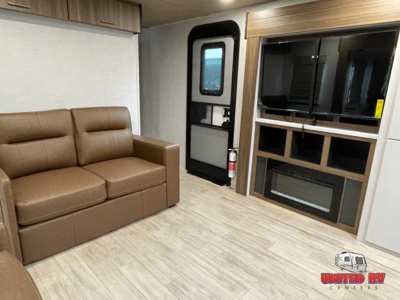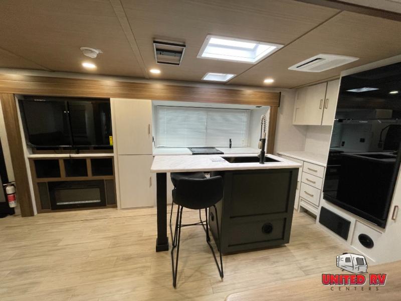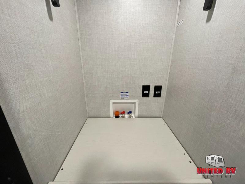 You won't believe all that this travel trailer has to offer! The rear kitchen includes a spacious pantry and a coffee bar/hutch for additional storage space. The kitchen island makes meal prepping easier, and the beverage cooler helps save space in your refrigerator for perishables. The kitchen skylight brings in natural lighting. Relax each night on either the tri-fold sofa or theater seating across from the entertainment center with a fireplace, or you can play some games at the 5-person dinette. As you enter the bathroom, you will notice the washer and dryer prep that will give you the ability to add these appliances. The front private bedroom has a custom king bed slide with nightstands on either side with power to charge your electronics while you recharge. The exterior not only has pass-through storage and a power awning, but also a 64" x 20" baggage door!