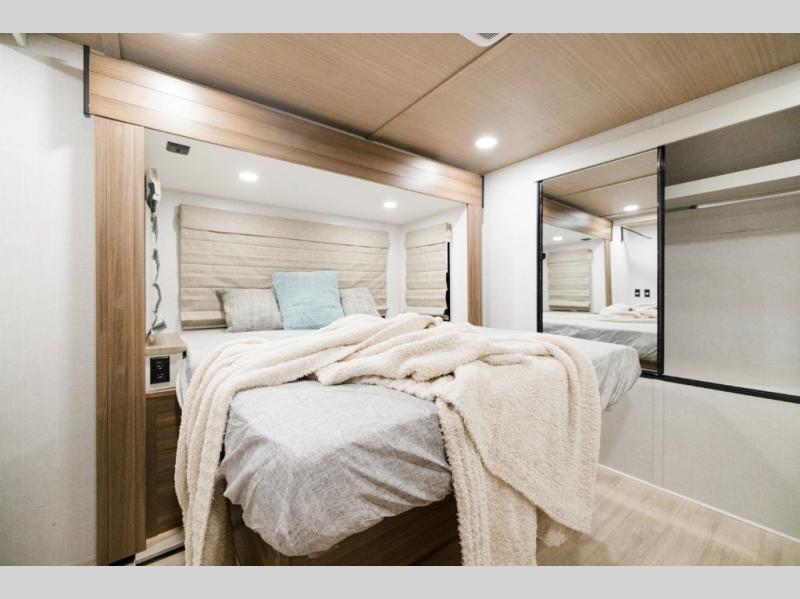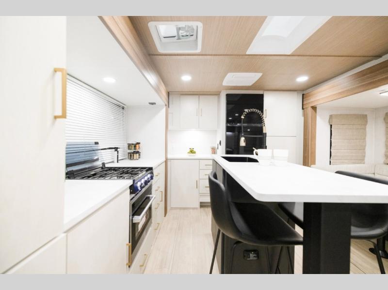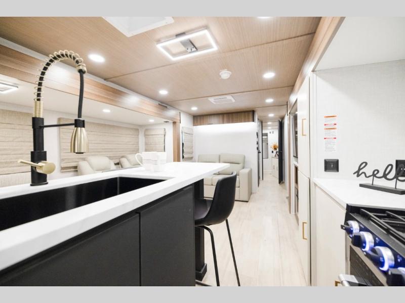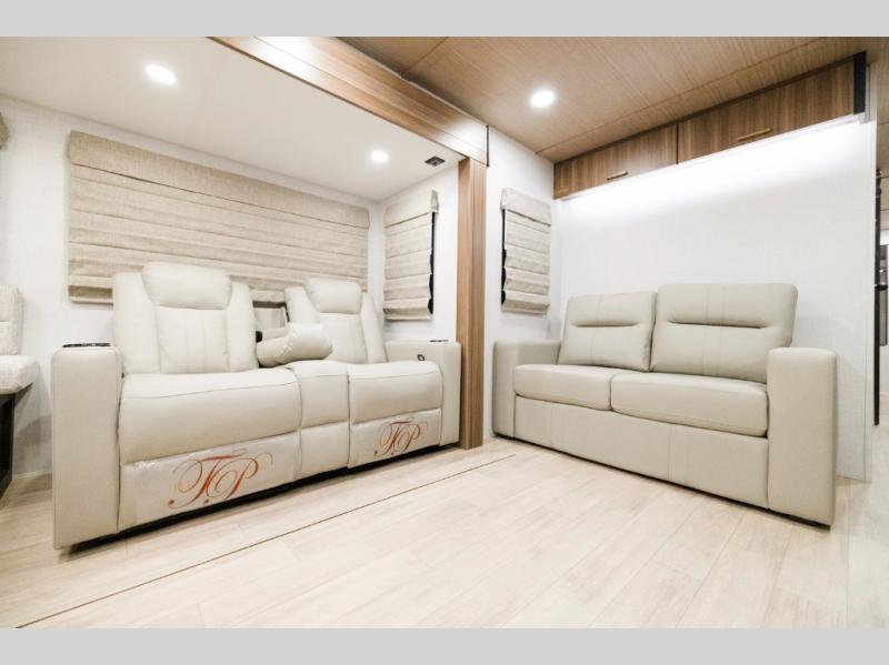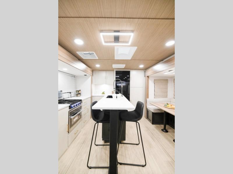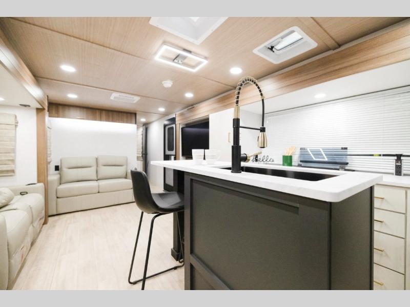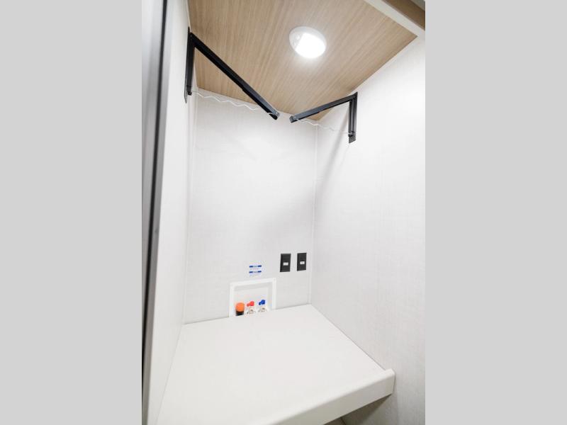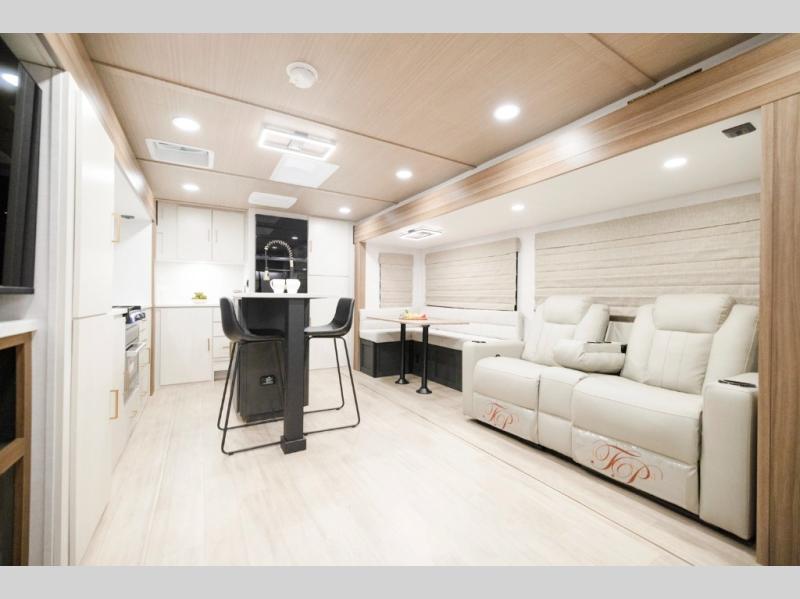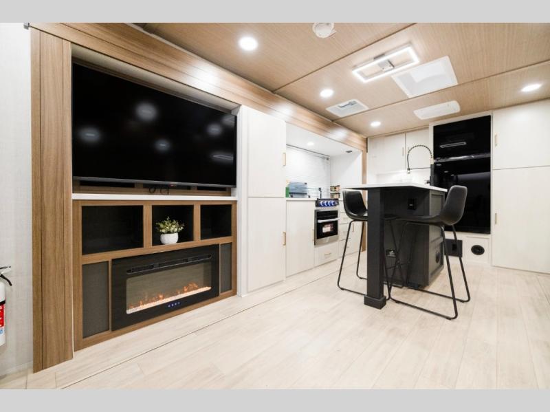 You won't believe all that this travel trailer has to offer! The rear kitchen includes a spacious pantry and a coffee bar/hutch for additional storage space. The kitchen island makes meal prepping easier, and the beverage cooler helps save space in your refrigerator for perishables. The kitchen skylight brings in natural lighting. Relax each night on either the tri-fold sofa or theater seating across from the entertainment center with a fireplace, or you can play some games at the 5-person dinette. As you enter the bathroom, you will notice the washer and dryer prep that will give you the ability to add these appliances. The front private bedroom has its own fireplace and a custom king bed slide with nightstands on either side with power to charge your electronics while you recharge. The exterior not only has pass-through storage and a power awning, but also a 64" x 20" baggage door!