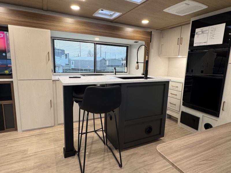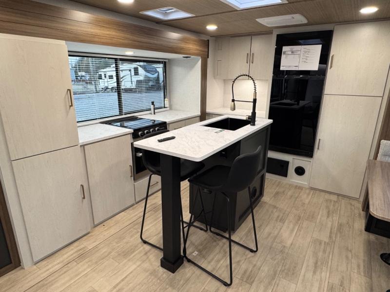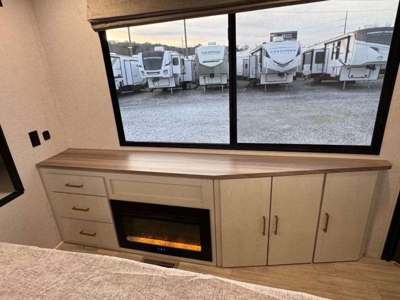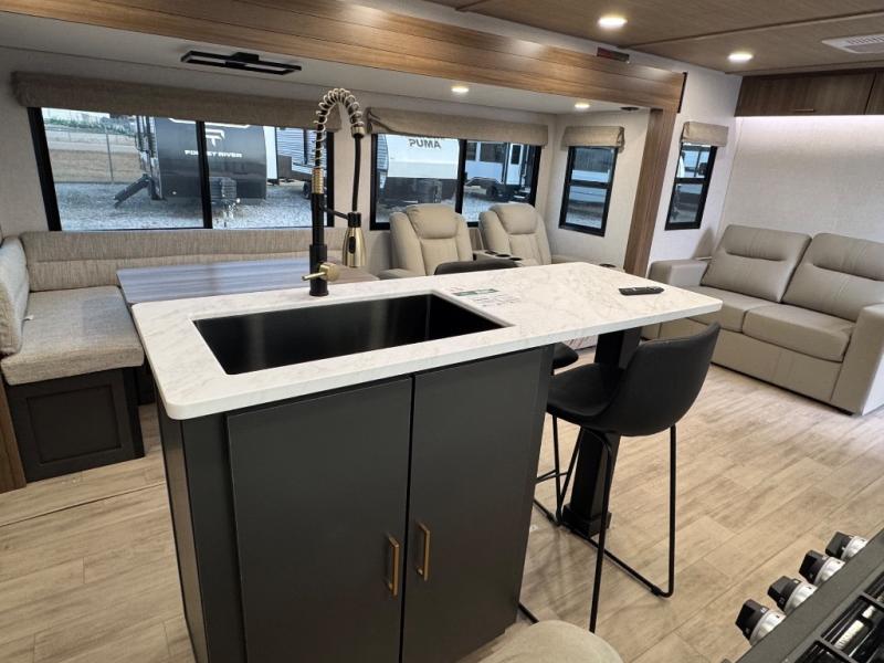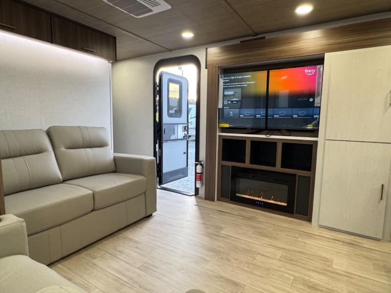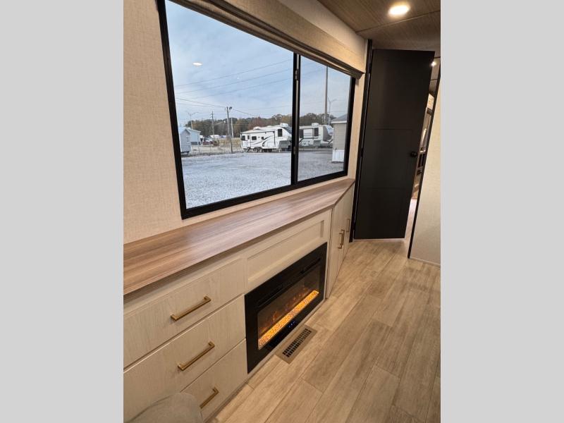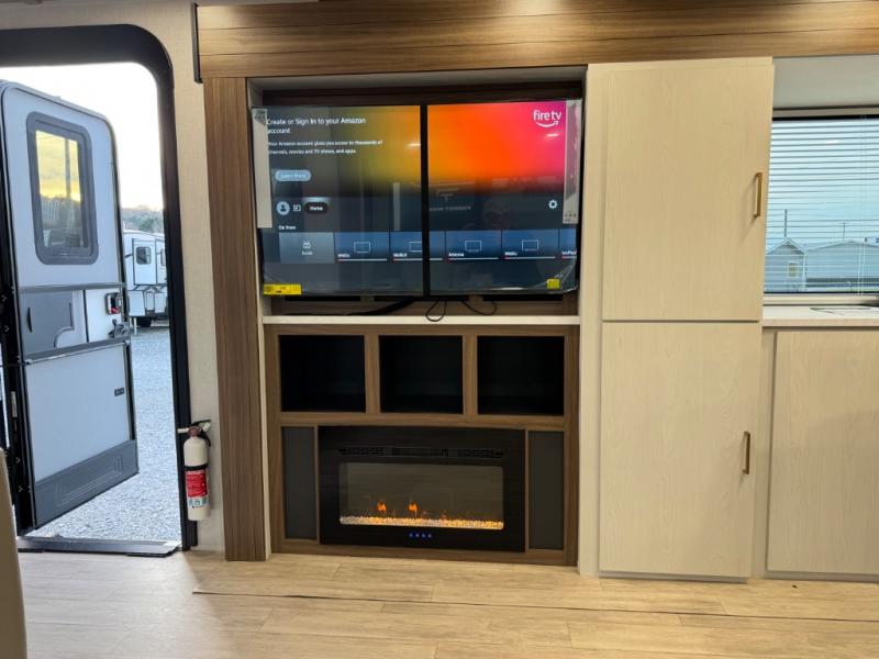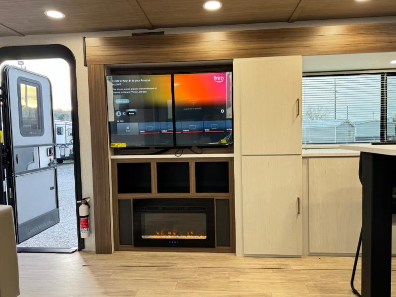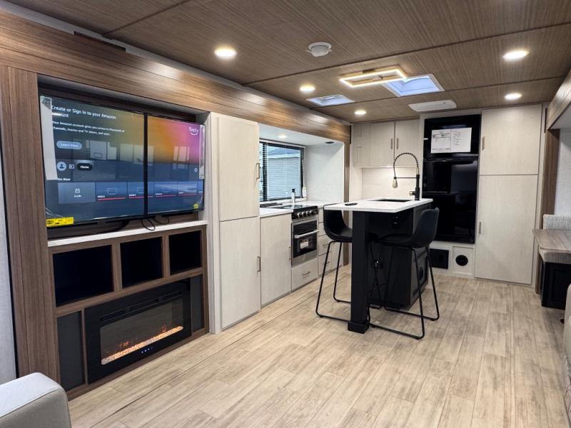 You won't believe all that this travel trailer has to offer! The rear kitchen includes a spacious pantry and a coffee bar/hutch for additional storage space. The kitchen island makes meal prepping easier, and the beverage cooler helps save space in your refrigerator for perishables. The kitchen skylight brings in natural lighting. Relax each night on either the tri-fold sofa or theater seating across from the entertainment center with a fireplace, or you can play some games at the 5-person dinette. As you enter the bathroom, you will notice the washer and dryer prep that will give you the ability to add these appliances. The front private bedroom has a custom king bed slide with nightstands on either side with power to charge your electronics while you recharge. The exterior not only has pass-through storage and a power awning, but also a 64" x 20" baggage door!