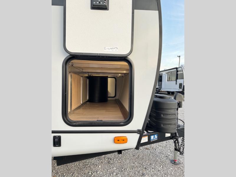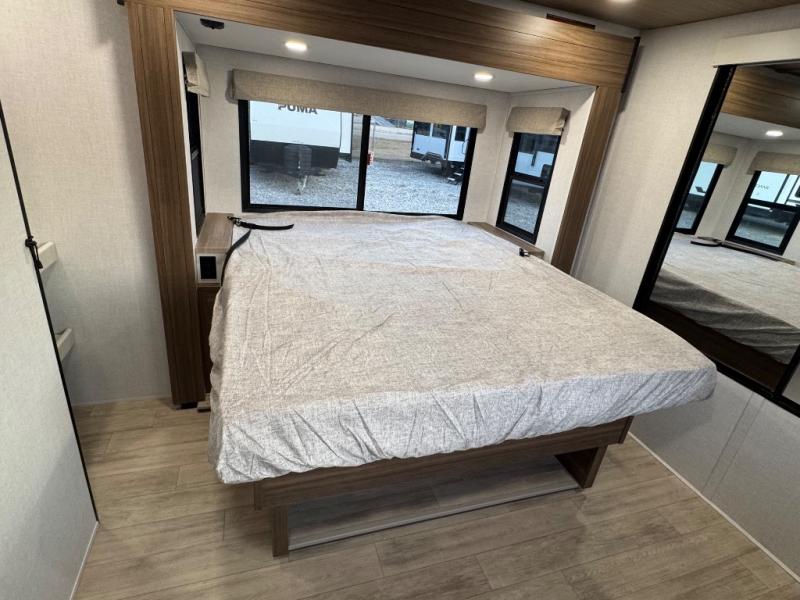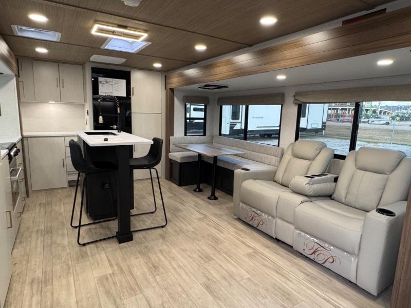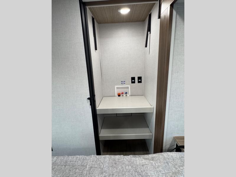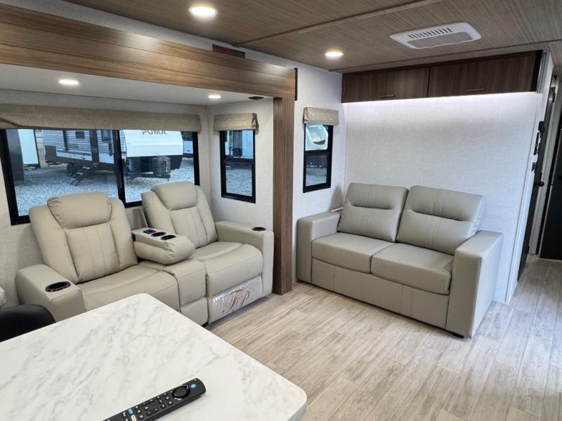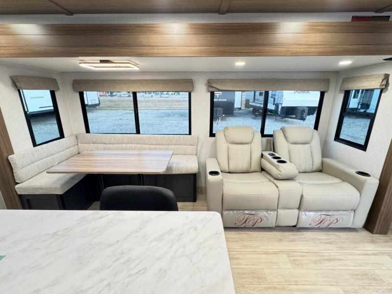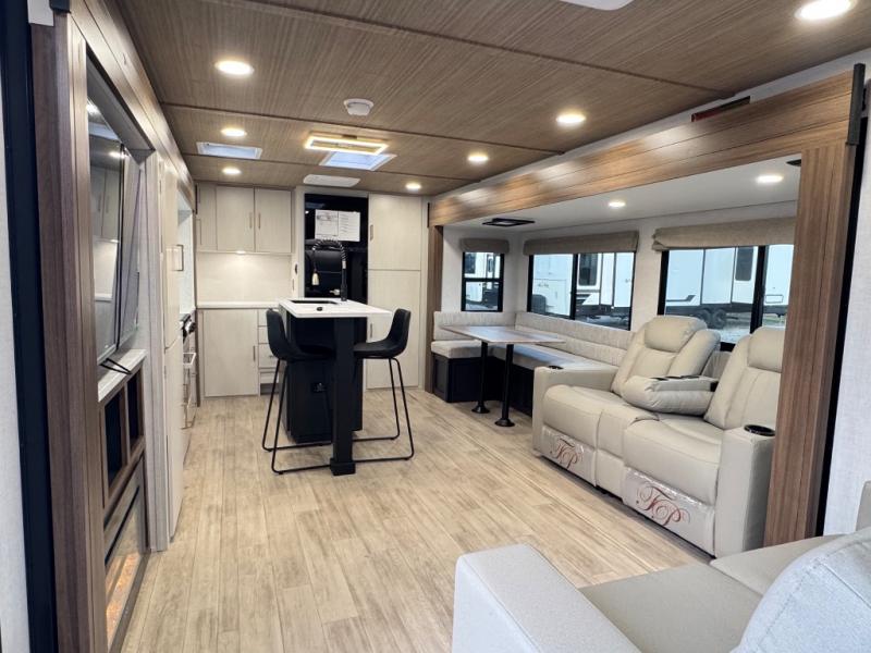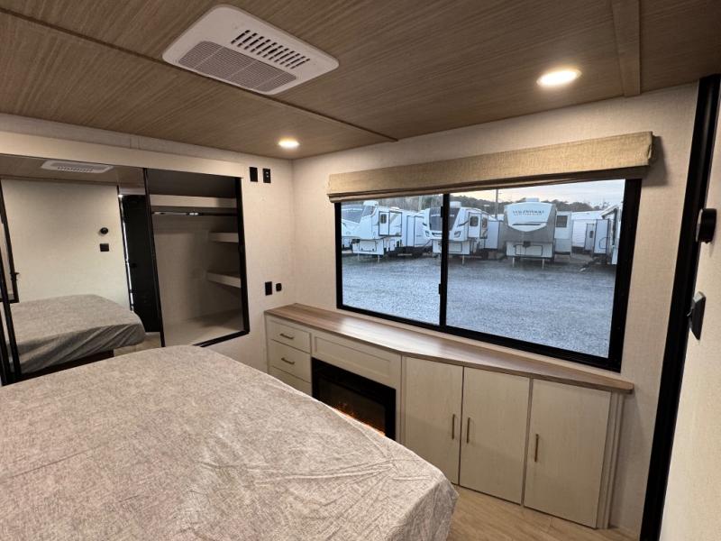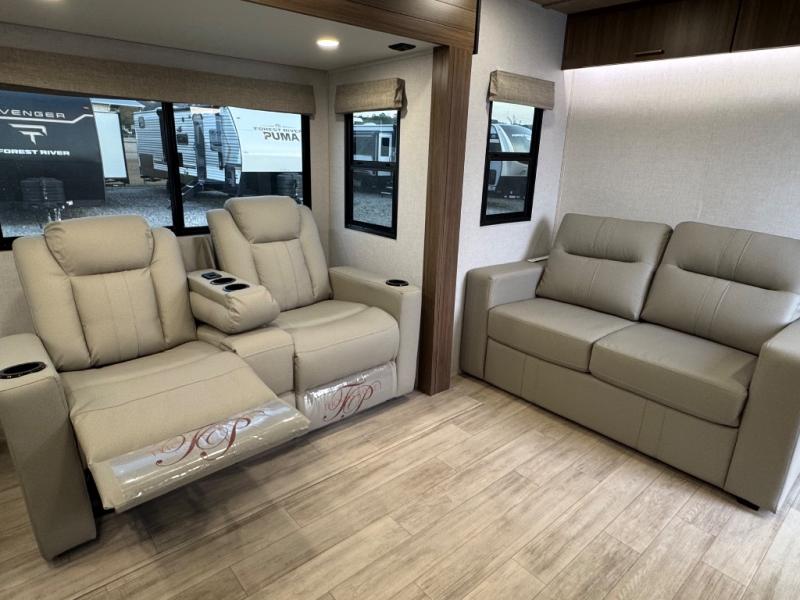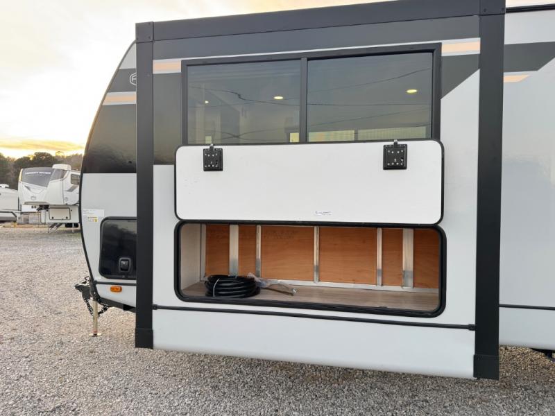 You won't believe all that this travel trailer has to offer! The rear kitchen includes a spacious pantry and a coffee bar/hutch for additional storage space. The kitchen island makes meal prepping easier, and the beverage cooler helps save space in your refrigerator for perishables. The kitchen skylight brings in natural lighting. Relax each night on either the tri-fold sofa or theater seating across from the entertainment center with a fireplace, or you can play some games at the 5-person dinette. As you enter the bathroom, you will notice the washer and dryer prep that will give you the ability to add these appliances. The front private bedroom has a custom king bed slide with nightstands on either side with power to charge your electronics while you recharge. The exterior not only has pass-through storage and a power awning, but also a 64" x 20" baggage door!