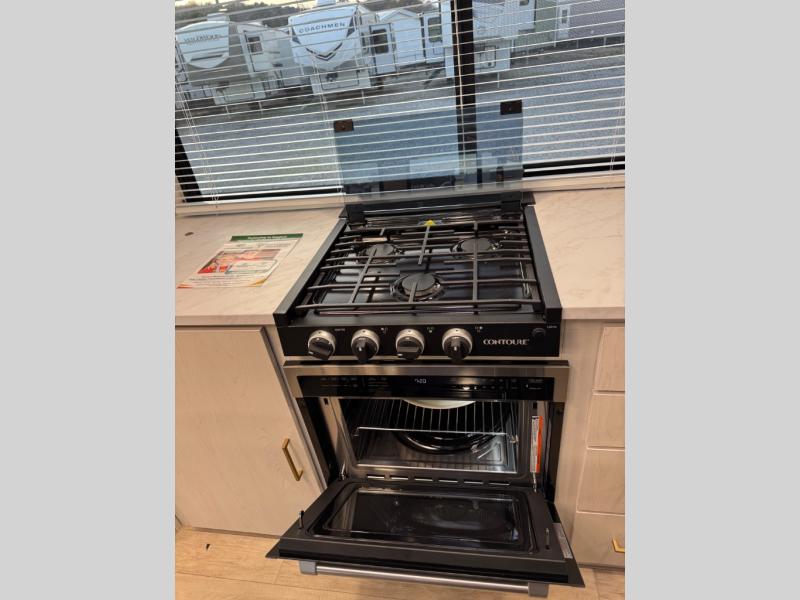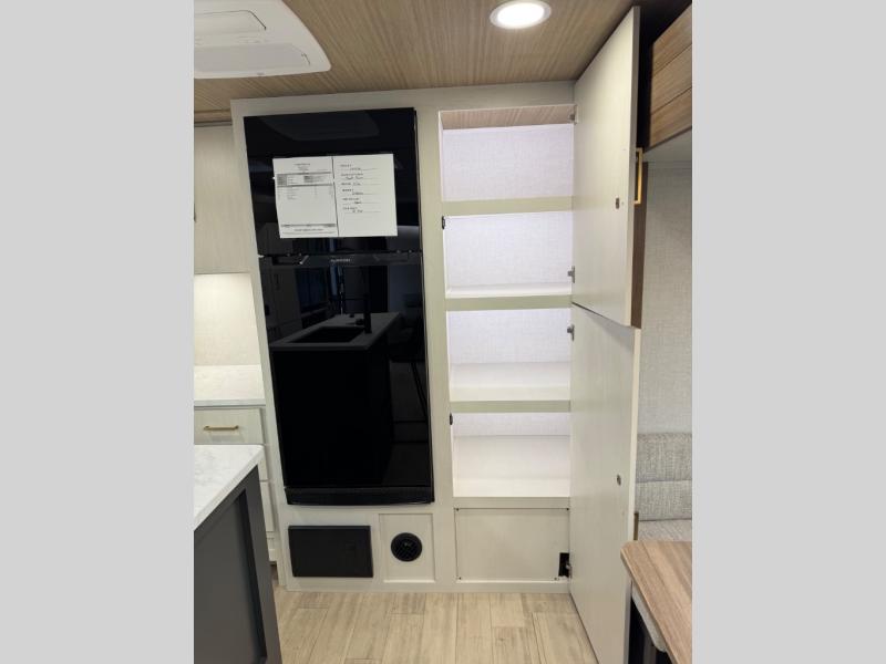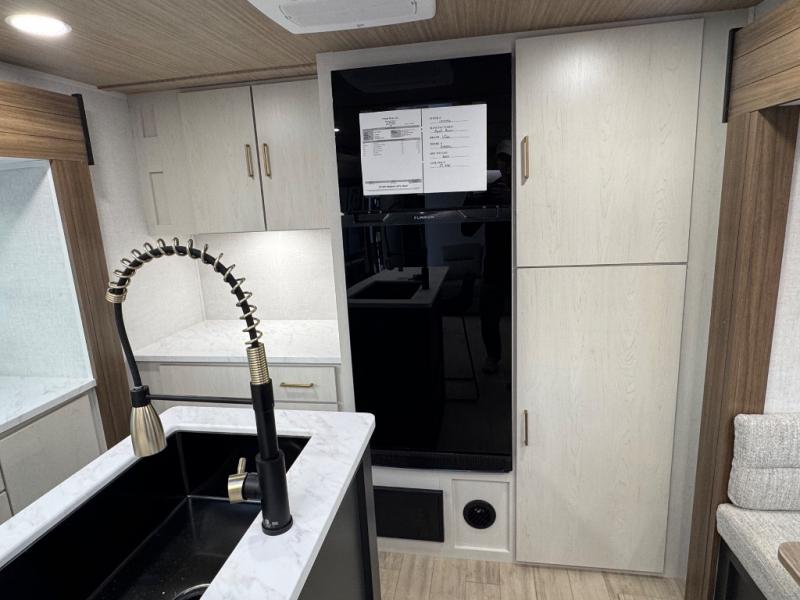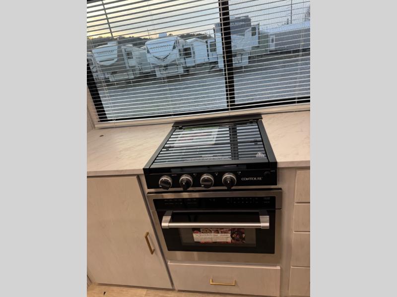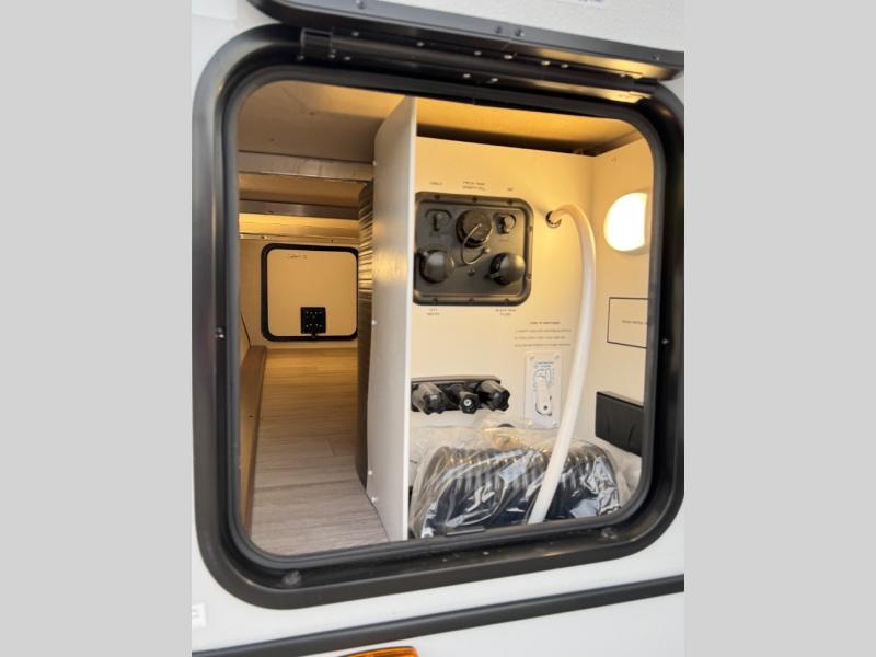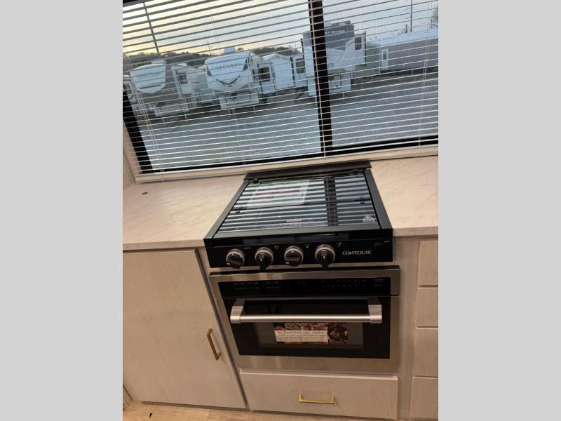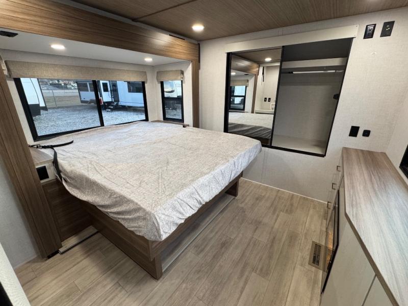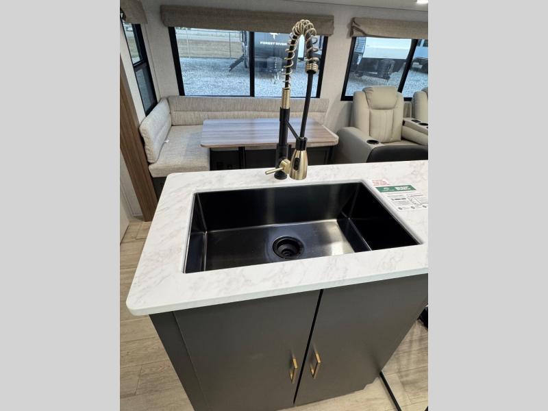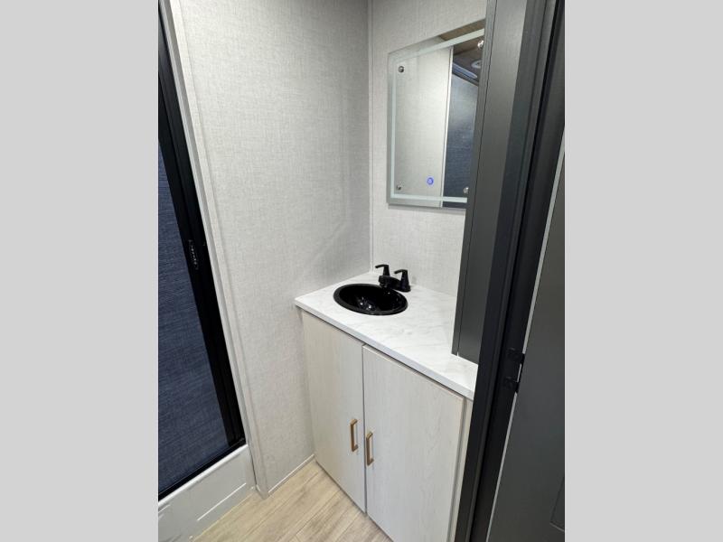 You won't believe all that this travel trailer has to offer! The rear kitchen includes a spacious pantry and a coffee bar/hutch for additional storage space. The kitchen island makes meal prepping easier, and the beverage cooler helps save space in your refrigerator for perishables. The kitchen skylight brings in natural lighting. Relax each night on either the tri-fold sofa or theater seating across from the entertainment center with a fireplace, or you can play some games at the 5-person dinette. As you enter the bathroom, you will notice the washer and dryer prep that will give you the ability to add these appliances. The front private bedroom has a custom king bed slide with nightstands on either side with power to charge your electronics while you recharge. The exterior not only has pass-through storage and a power awning, but also a 64" x 20" baggage door!