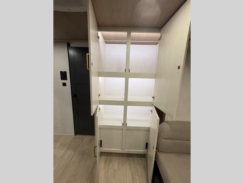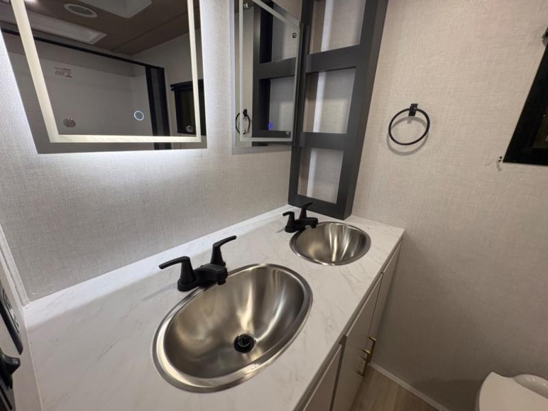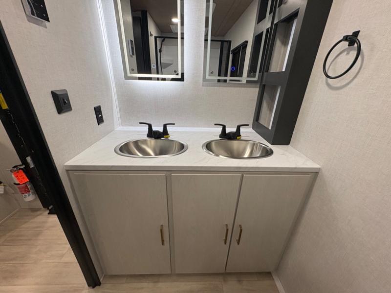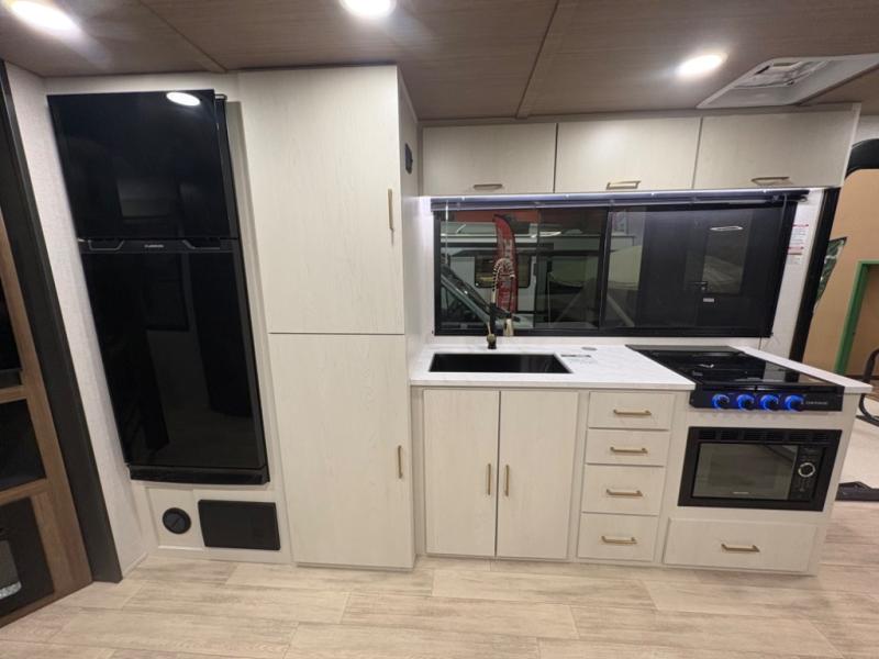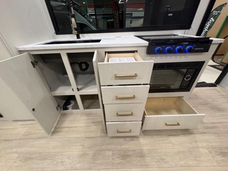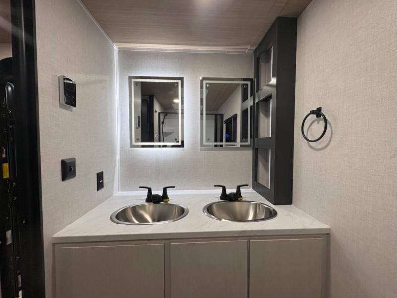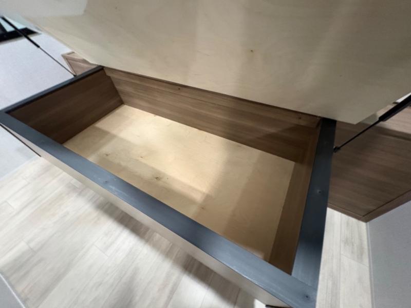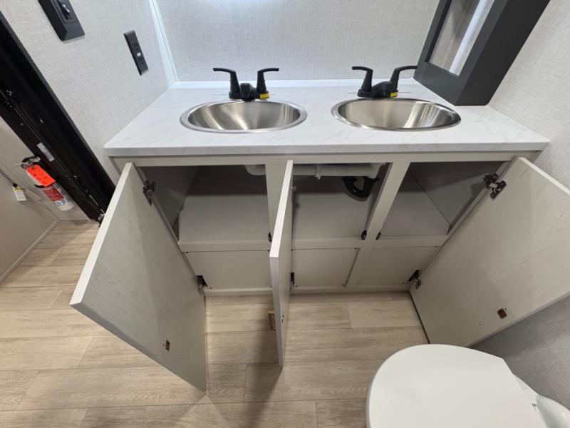 The sleeping areas are designed for both comfort and convenience. The main sleeping space offers a cozy retreat at the end of the day, while convertible lounge and dinette areas allow for flexible sleeping arrangements when guests join the adventure. Thoughtful storage solutions throughout the trailer keep gear, clothing, and personal essentials organized, so you can focus on exploring rather than unpacking.