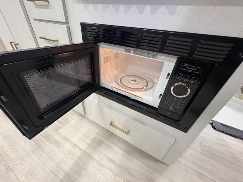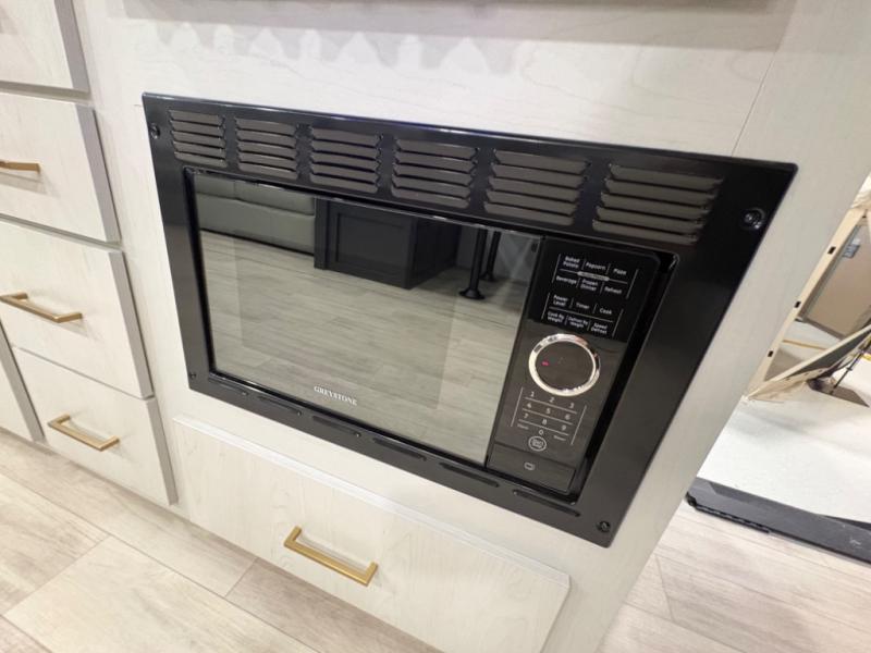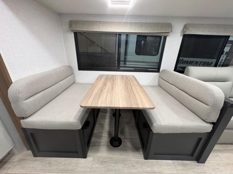 The fully equipped kitchen makes meal preparation easy and enjoyable. A refrigerator, three-burner stovetop, microwave, and generous counter space allow you to cook up everything from quick breakfasts before hitting the trail to hearty dinners after a day of exploration. The adjacent dinette provides a comfortable spot for meals, planning your next destination, or playing games with friends and family.
