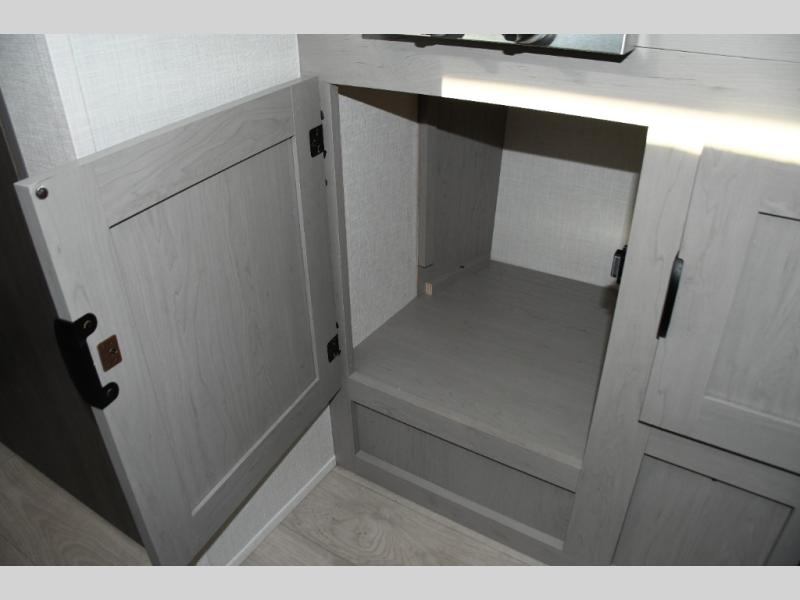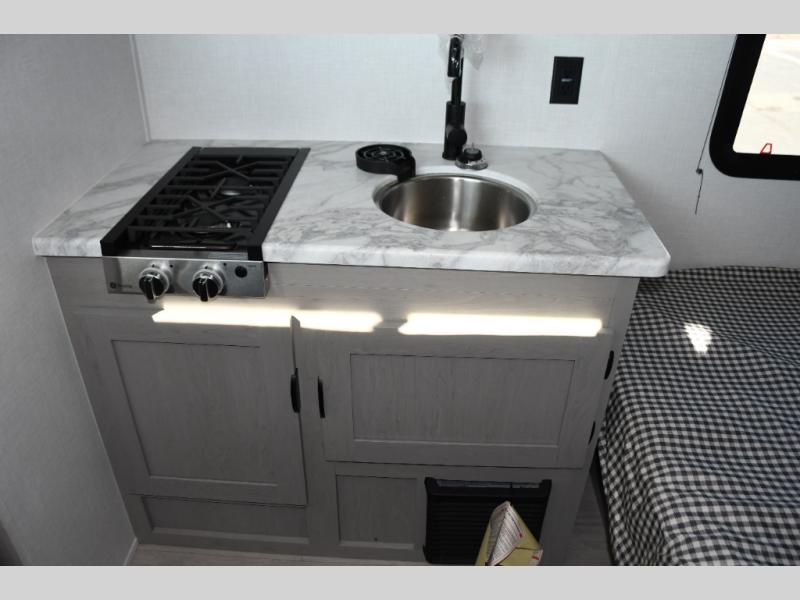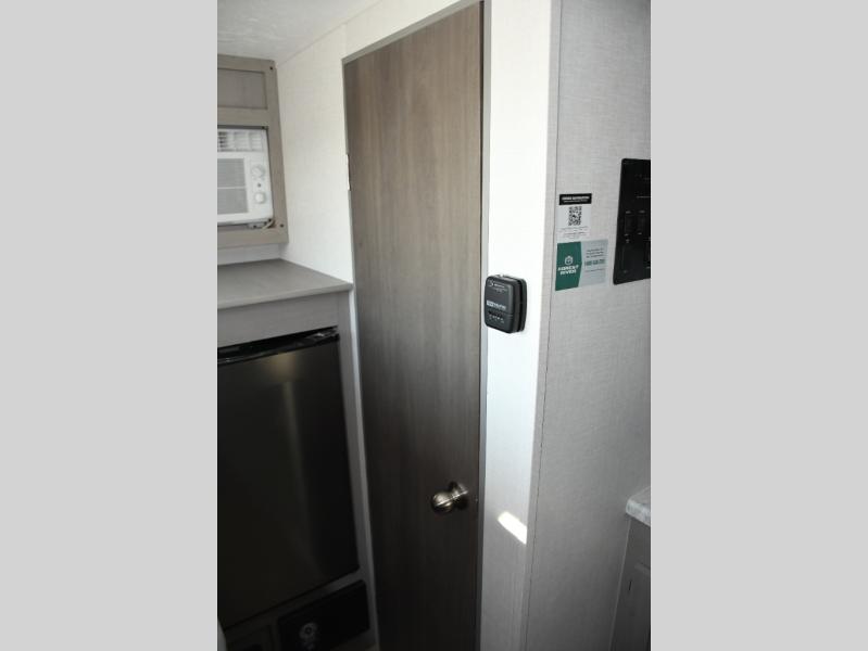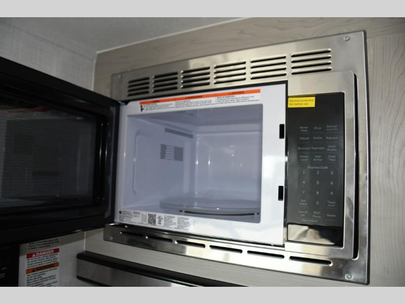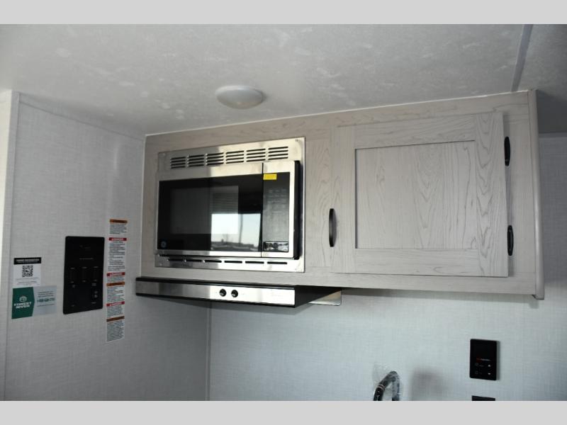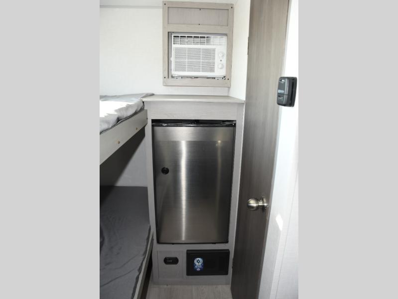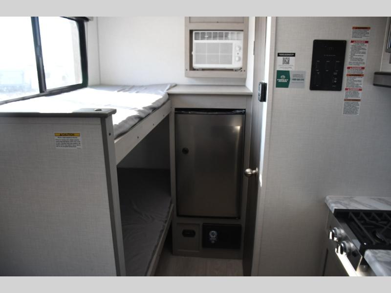 Inside, the Viking 12BH is designed to maximize every inch. A comfortable front queen bed provides a cozy place to rest after a day of exploring, while rear bunk beds offer a great sleeping area for kids or guests. The efficient kitchen includes a two-burner cooktop, microwave, refrigerator, and functional countertop space, allowing you to prepare meals wherever your journey takes you.