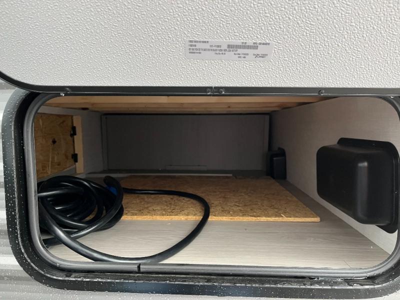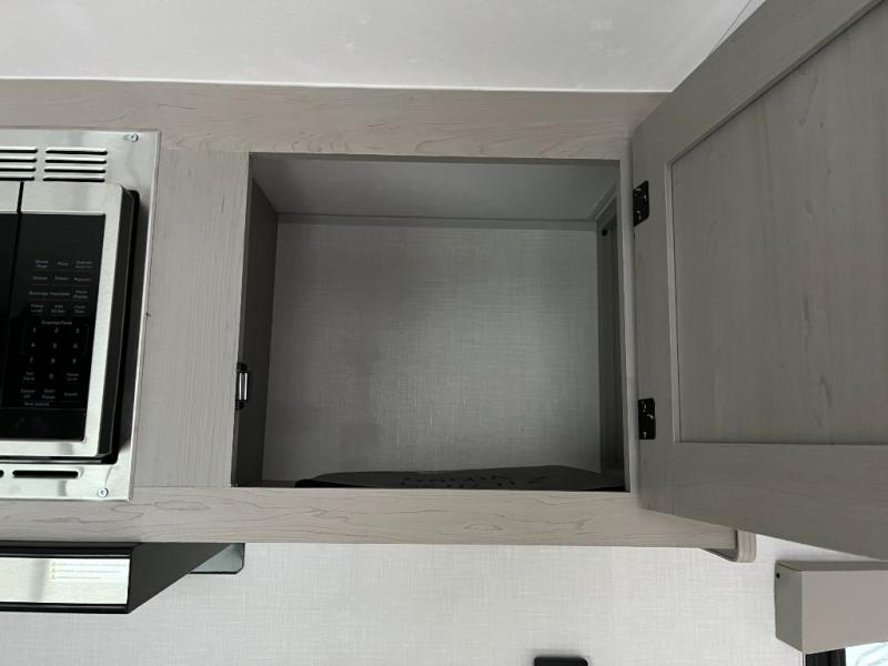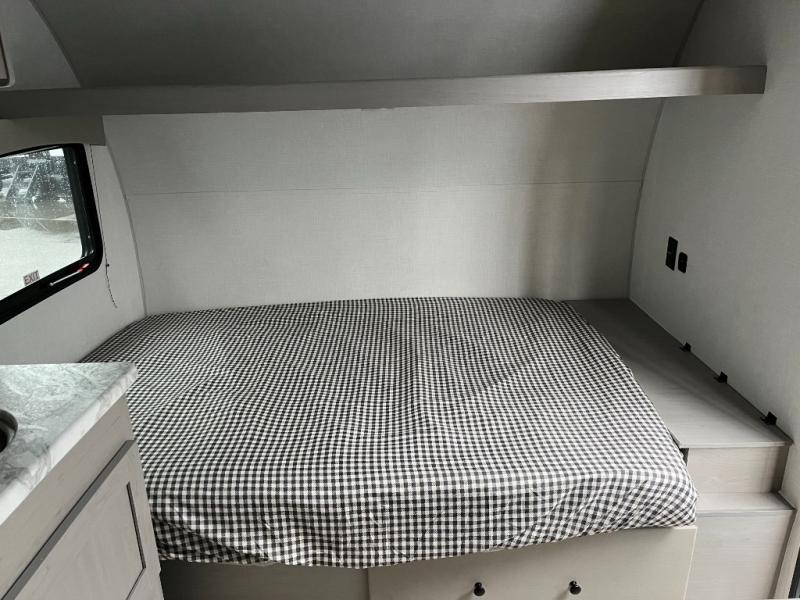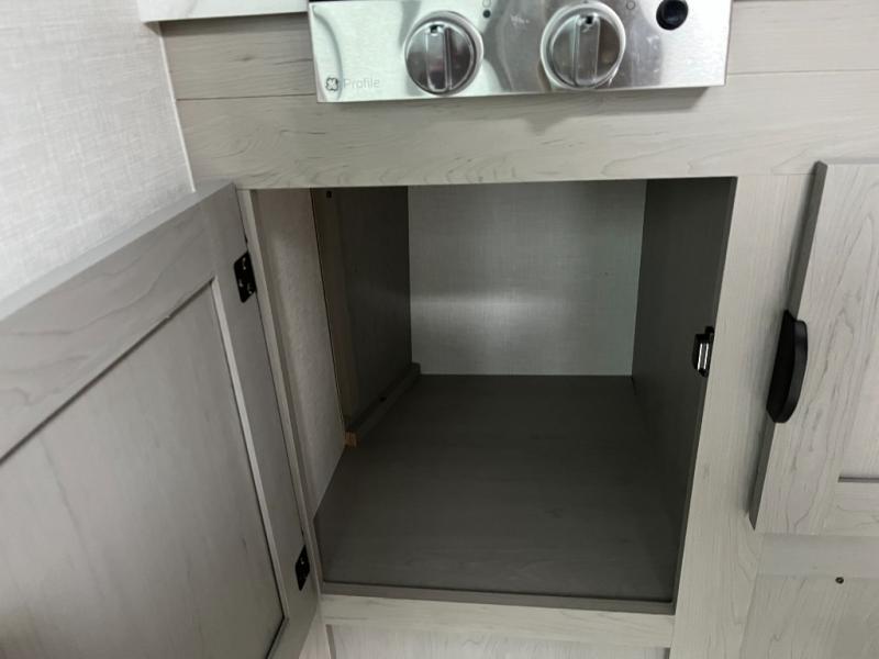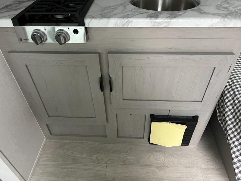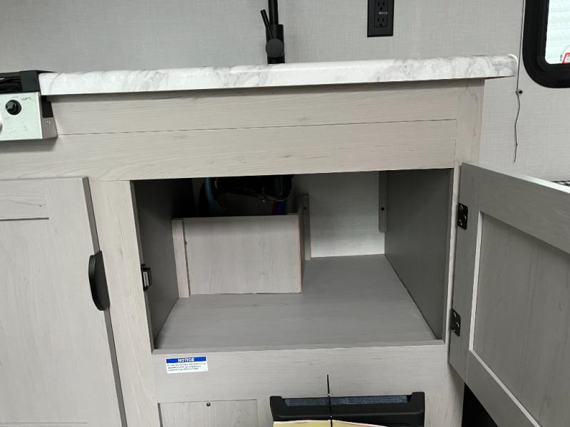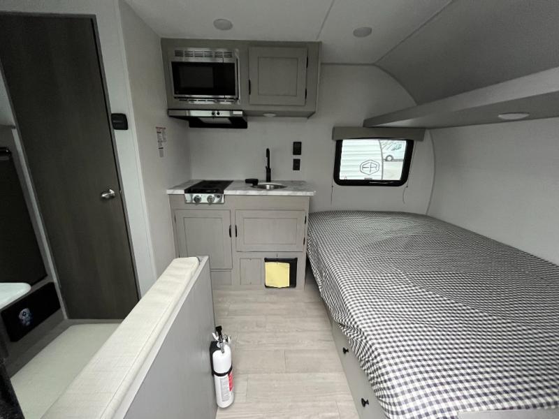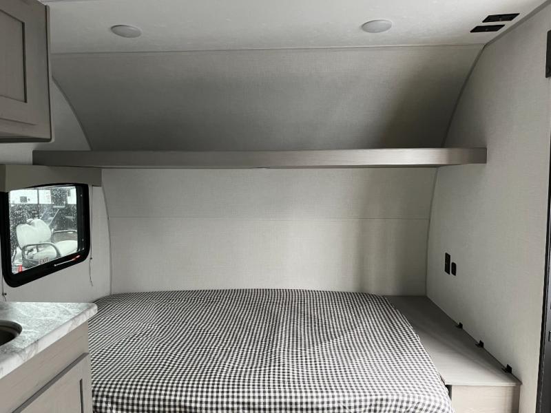 This RV features a comfortable queen bed and an overhead shelf for storing books, decorations, or personal items. Plus, the dinette provides a cozy spot to enjoy meals, play games, or extra sleeping space, perfect for relaxing and socializing. The kitchen is equipped with a 12V refrigerator and a two-burner cooktop, making meal prep a breeze. Overhead cabinets provide additional storage for cookware, dishes, and food. The 24" x 32" shower is a convenient and comfortable space for getting cleaned up after a long day of exploring.