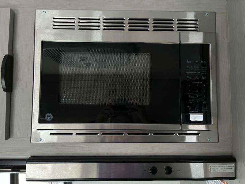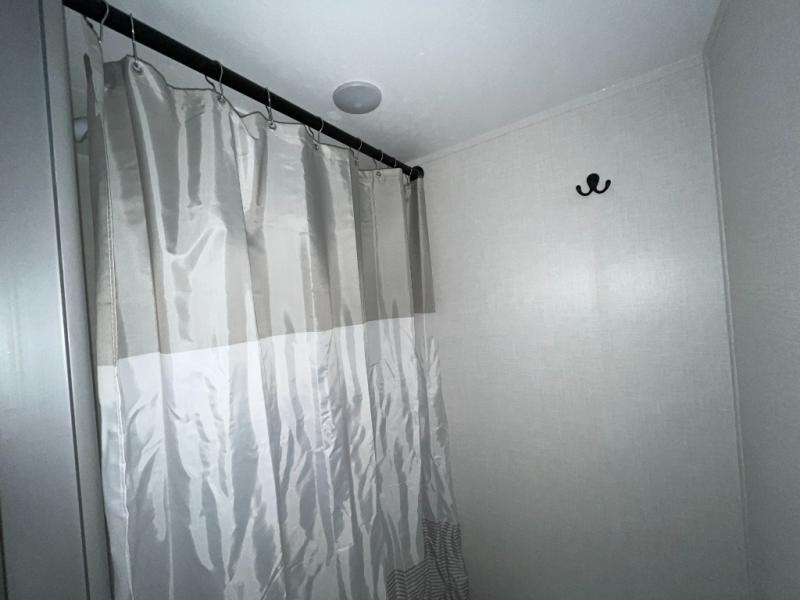 The full bathroom is conveniently located and outfitted with practical features for everyday use, including a shower, sink, and toilet. Designed with comfort in mind, this space brings convenience to your campsite so you can refresh and recharge with ease.