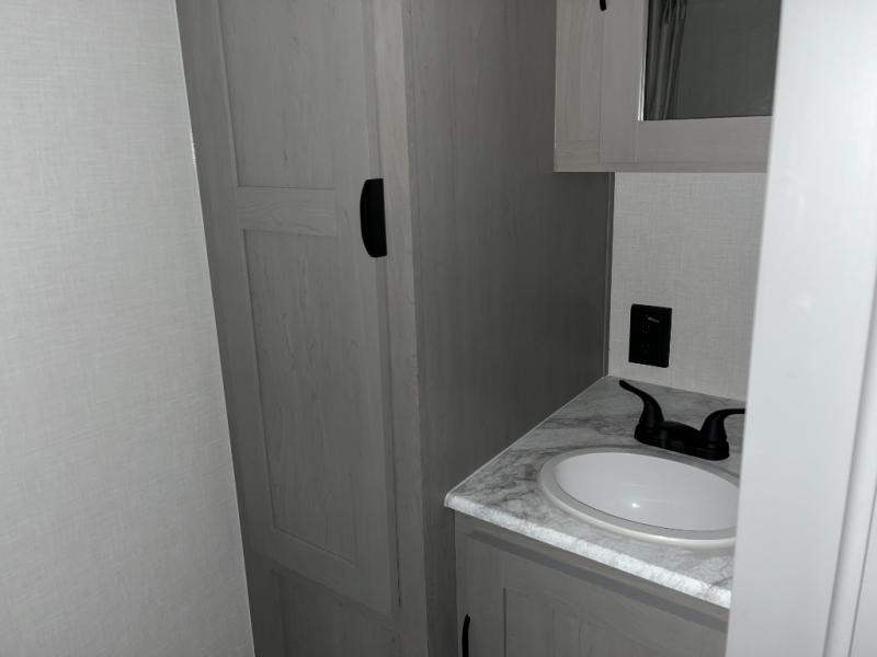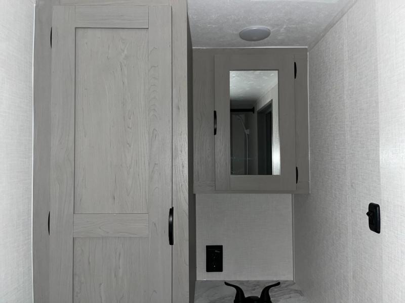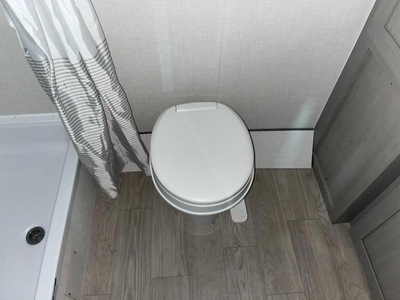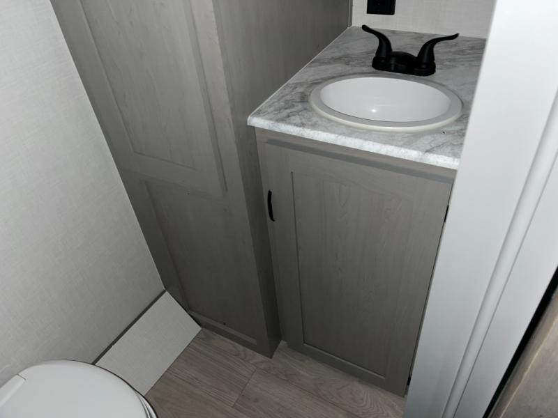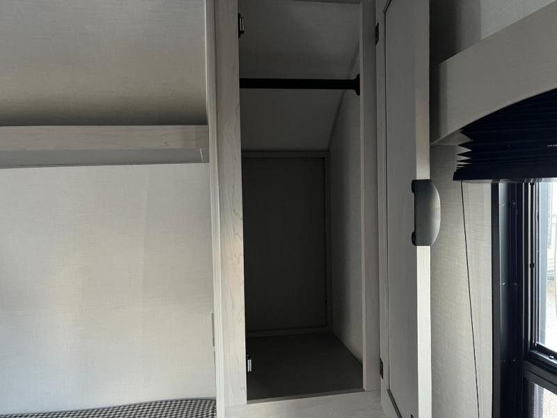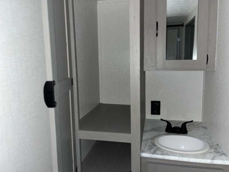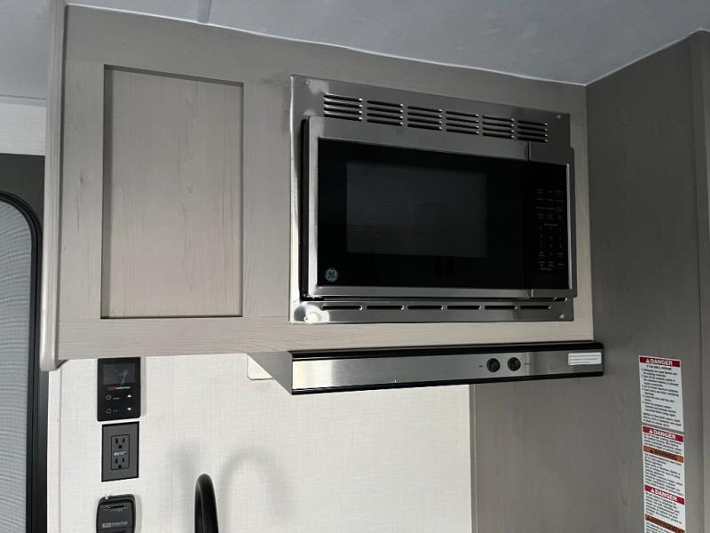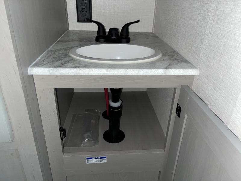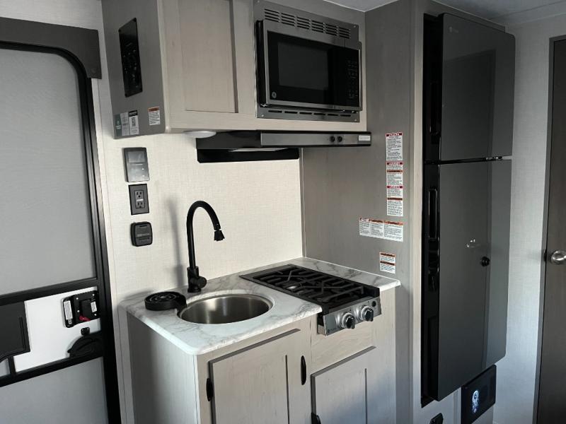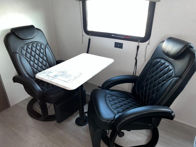 Take this versatile couple's travel trailer to your favorite destinations! It features a front jackknife sofa "Murphy Bed" for versatile seating and sleeping space. There are also two wardrobes with a private shelf on each end and an overhead shelf above for your things. There is additional seating with two recliner chairs including a table between opposite the kitchen area. This space also features overhead storage. The full rear bath offers a 24" x 36" shower, a sink with medicine cabinet and linen storage as well. You can easily cook simple camp meals using the two burner cooktop or the microwave. On the exterior, a front pass-through storage compartment is available for all of your outdoor gear!