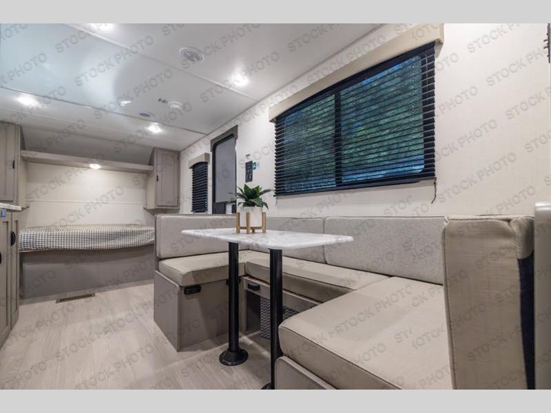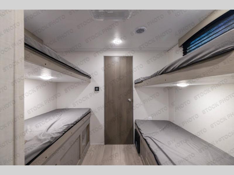 Your guests will love camping with you in this travel trailer! The bunkhouse suite includes four bunks with storage underneath plus a full rear bath to easily clean up each day. The front RV queen bed will provide a great night's rest, and you can store your clothing and essentials in the wardrobe at each side, and you even have an overhead shelf for more space. You can make your best meals in the full kitchen with a three burner cooktop and microwave oven, and there is an 10 cu. ft. 12V refrigerator to keep your cold items fresh. The U-shaped dinette provides a place to dine, play games, and even let additional guests sleep over. This unit also features a closet with washer and dryer prep if you choose to add those appliances.