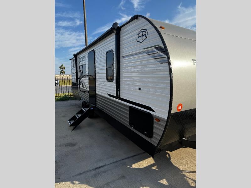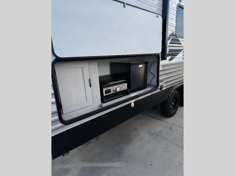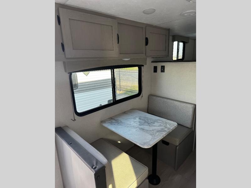 Bring the whole family with you in this travel trailer! The kiddos can sleep on the rear corner set of double-size bunks. The opposite rear corner features a full bath including a 24" x 36" shower, linen cabinet, toilet, and vanity. In the main living space, you will find plenty of seating with a booth dinette and jackknife sofa which can also transform into an extra sleeping space if needed. Everyone's bellies will stay full with the induction cooktop, 10 cu. ft. 12-volt refrigerator, and microwave which you can use to pop a bag of popcorn for movie night. You will enjoy the front bedroom for a bit of privacy including a queen bed and large overhead shelf for your things. On the outside, a large front pass-through for lawn chairs and camp gear. There is more storage beneath the bunks in back and a nice 15' awning to provide protection from the elements when outdoors.