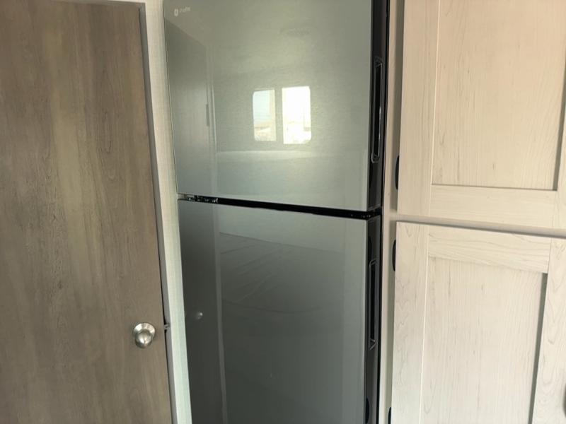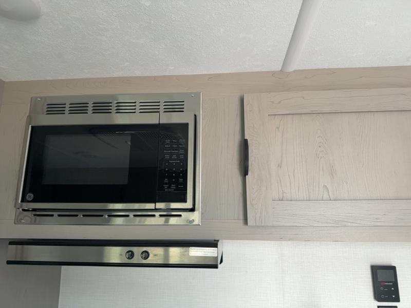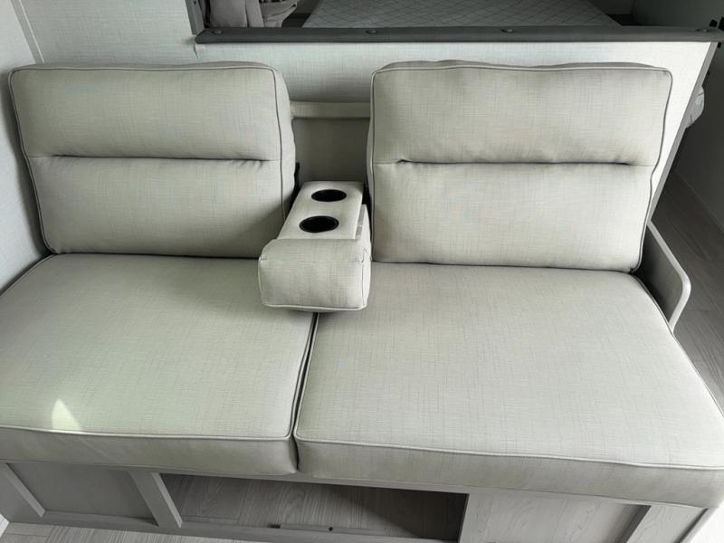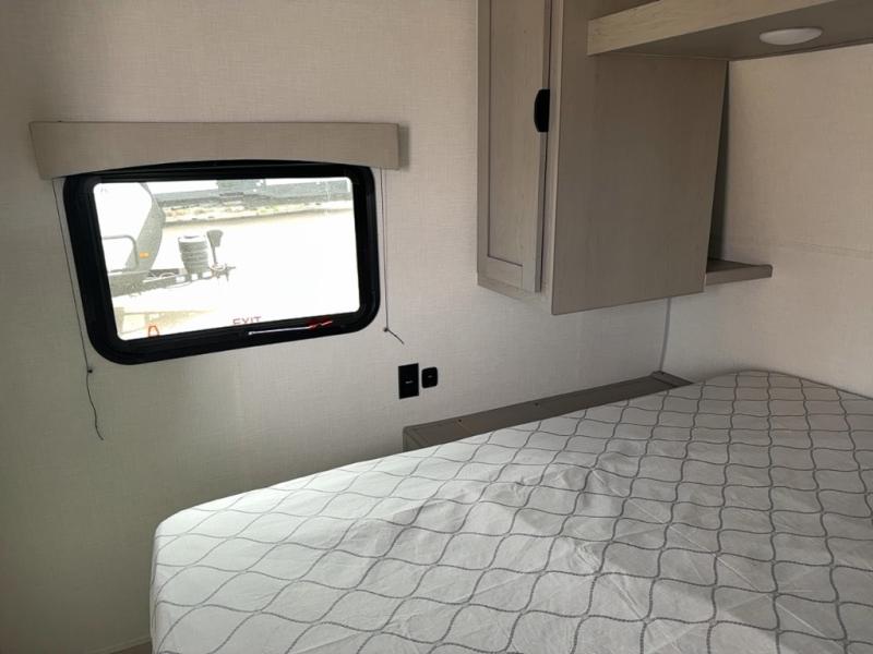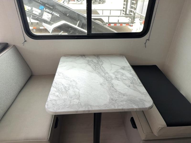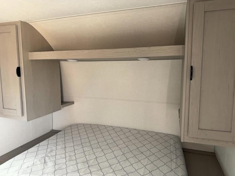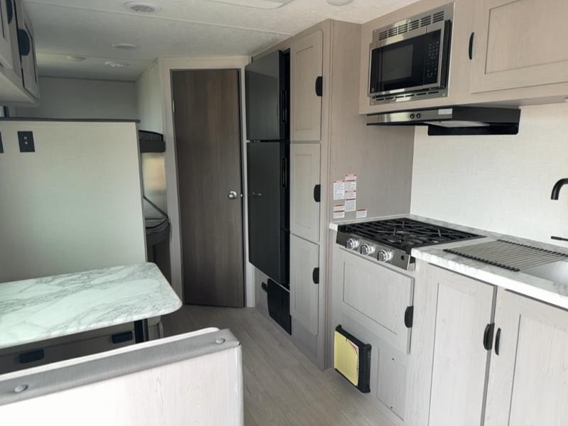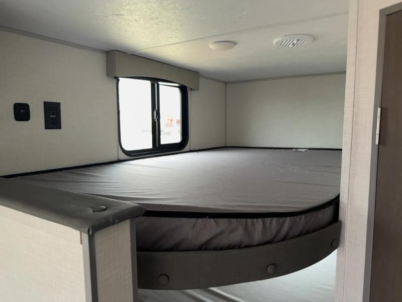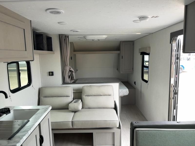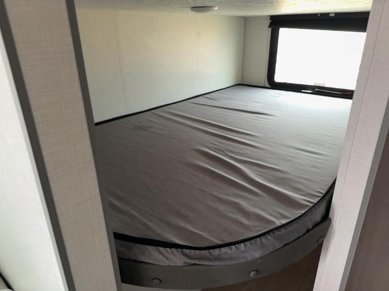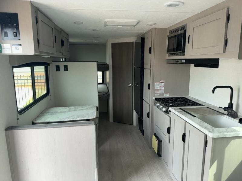 Bring the whole family with you in this travel trailer! The kiddos can sleep on the rear corner set of double-size bunks. The opposite rear corner features a full bath including a 24" x 36" shower, linen cabinet, toilet, and vanity. In the main living space, you will find plenty of seating with a booth dinette and jackknife sofa which can also transform into an extra sleeping space if needed. Everyone's bellies will stay full with the induction cooktop, 10 cu. ft. 12-volt refrigerator, and microwave which you can use to pop a bag of popcorn for movie night. You will enjoy the front bedroom for a bit of privacy including a queen bed and large overhead shelf for your things. On the outside, a large front pass-through for lawn chairs and camp gear. There is more storage beneath the bunks in back and a nice 15' awning to provide protection from the elements when outdoors.