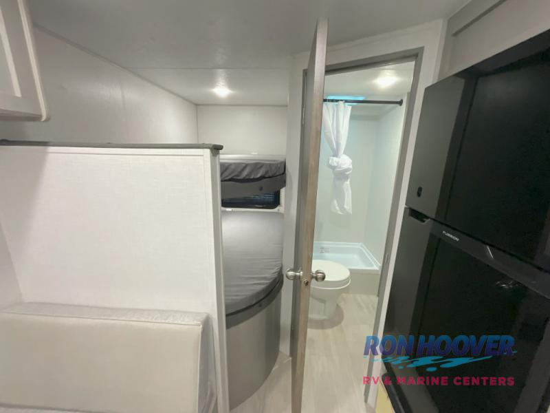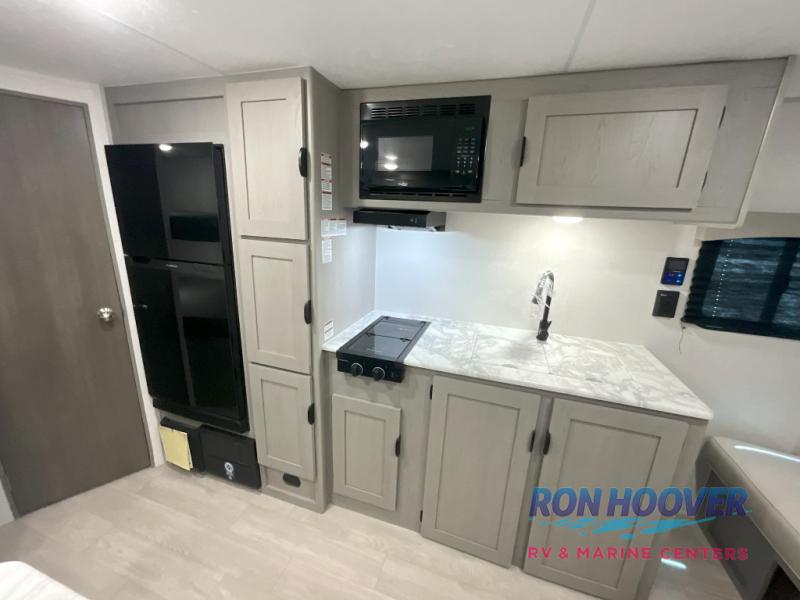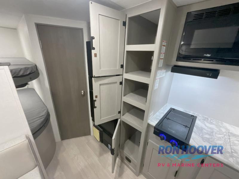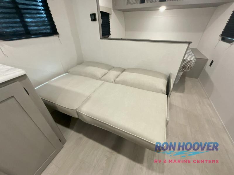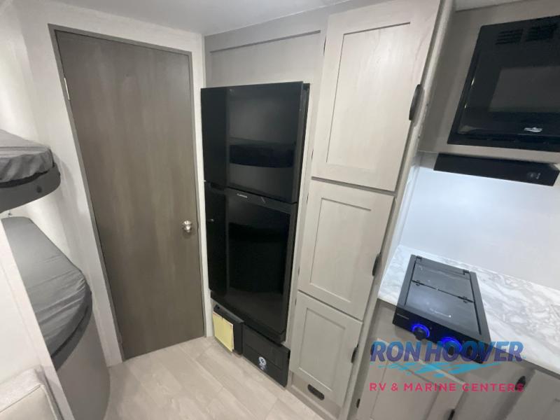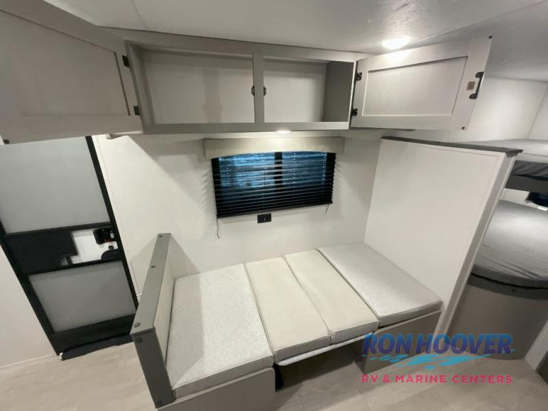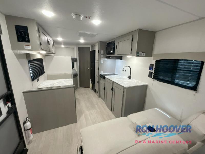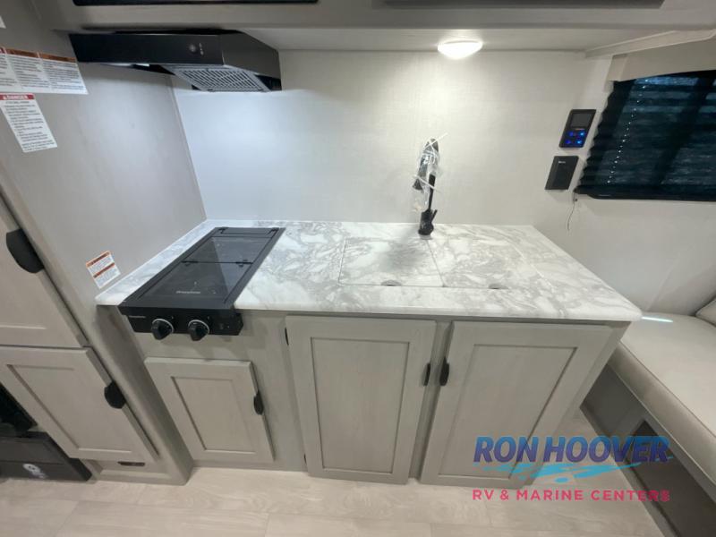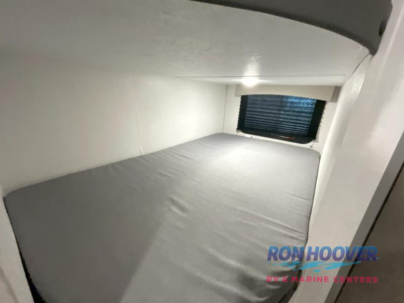 Bring the whole family with you in this travel trailer! The kiddos can sleep on the rear corner set of double-size bunks. The opposite rear corner features a full bath including a 24" x 36" shower, linen cabinet, toilet, and vanity. In the main living space, you will find plenty of seating with a booth dinette and jackknife sofa which can also transform into an extra sleeping space if needed. Everyone's bellies will stay full with the induction cooktop, 10 cu. ft. 12-volt refrigerator, and microwave which you can use to pop a bag of popcorn for movie night. You will enjoy the front bedroom for a bit of privacy including a queen bed and large overhead shelf for your things. On the outside, a large front pass-through for lawn chairs and camp gear. There is more storage beneath the bunks in back and a nice 15' awning to provide protection from the elements when outdoors.