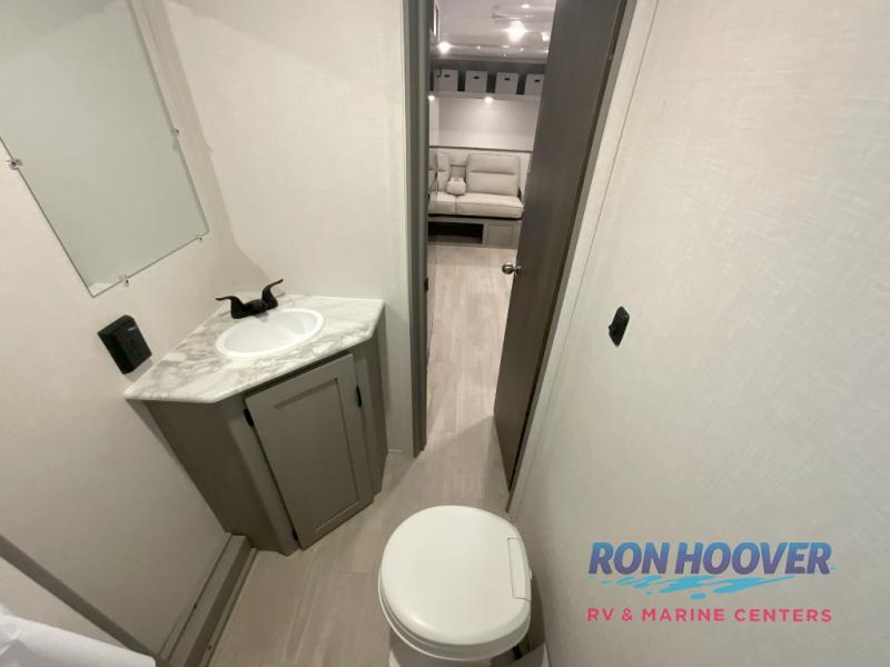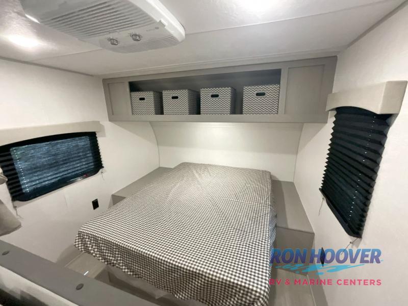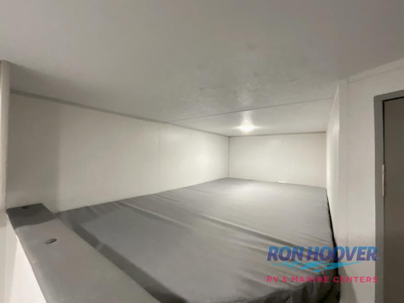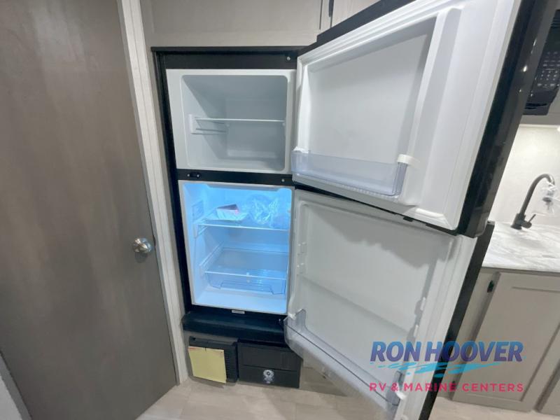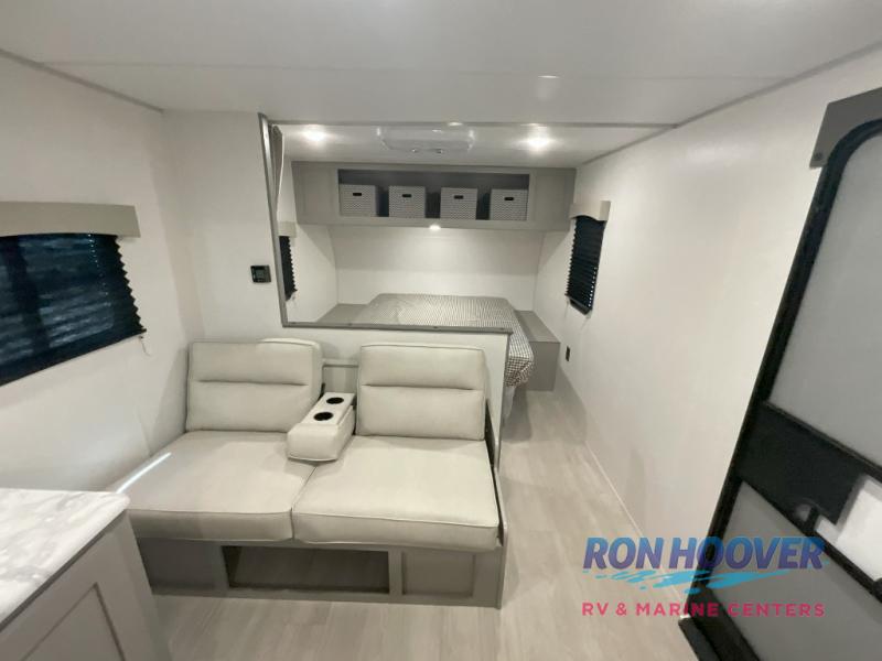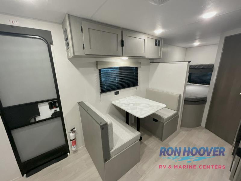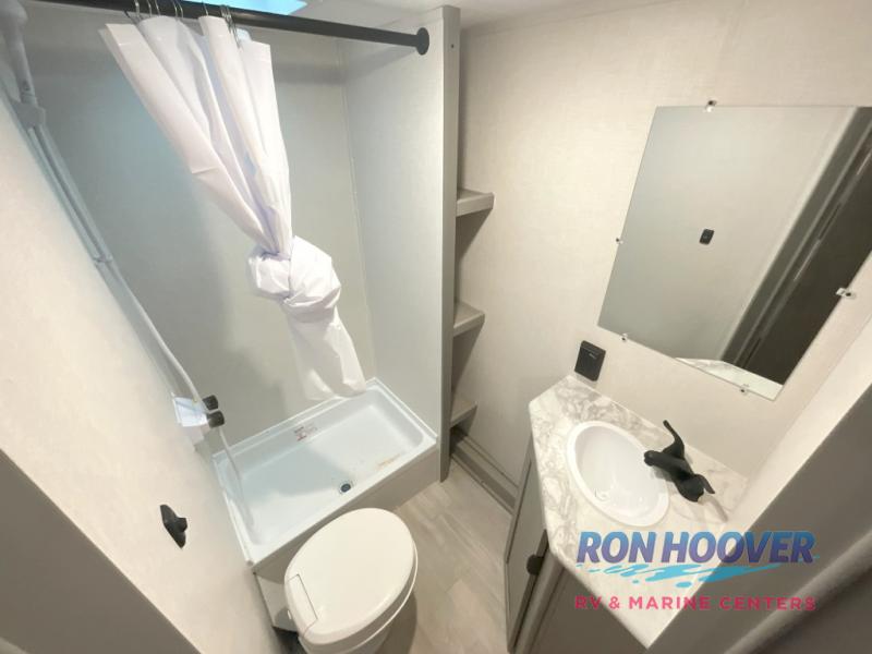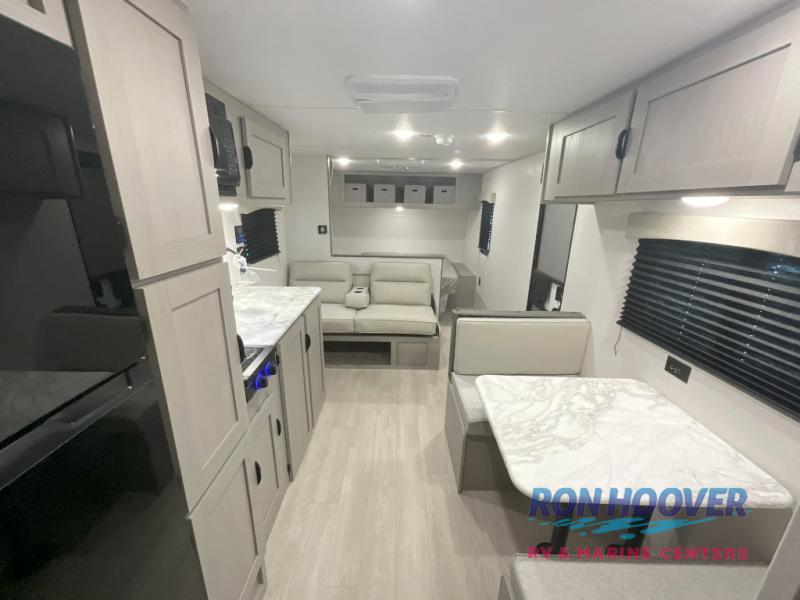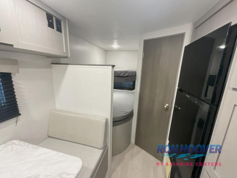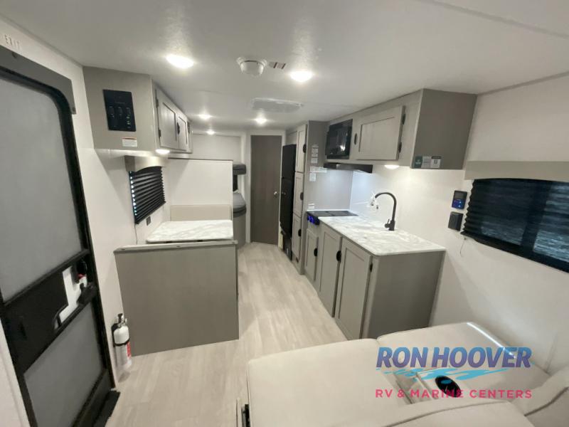 Bring the whole family with you in this travel trailer! The kiddos can sleep on the rear corner set of double-size bunks. The opposite rear corner features a full bath including a 24" x 36" shower, linen cabinet, toilet, and vanity. In the main living space, you will find plenty of seating with a booth dinette and jackknife sofa which can also transform into an extra sleeping space if needed. Everyone's bellies will stay full with the induction cooktop, 10 cu. ft. 12-volt refrigerator, and microwave which you can use to pop a bag of popcorn for movie night. You will enjoy the front bedroom for a bit of privacy including a queen bed and large overhead shelf for your things. On the outside, a large front pass-through for lawn chairs and camp gear. There is more storage beneath the bunks in back and a nice 15' awning to provide protection from the elements when outdoors.