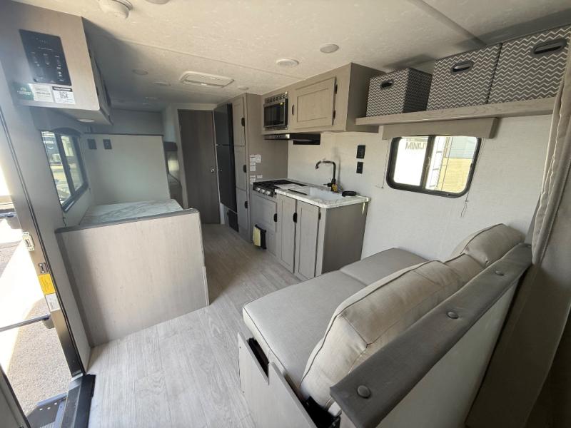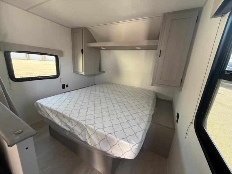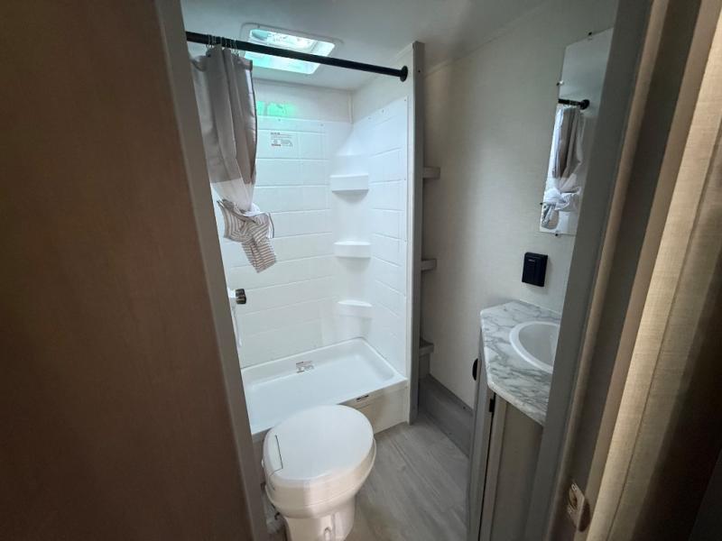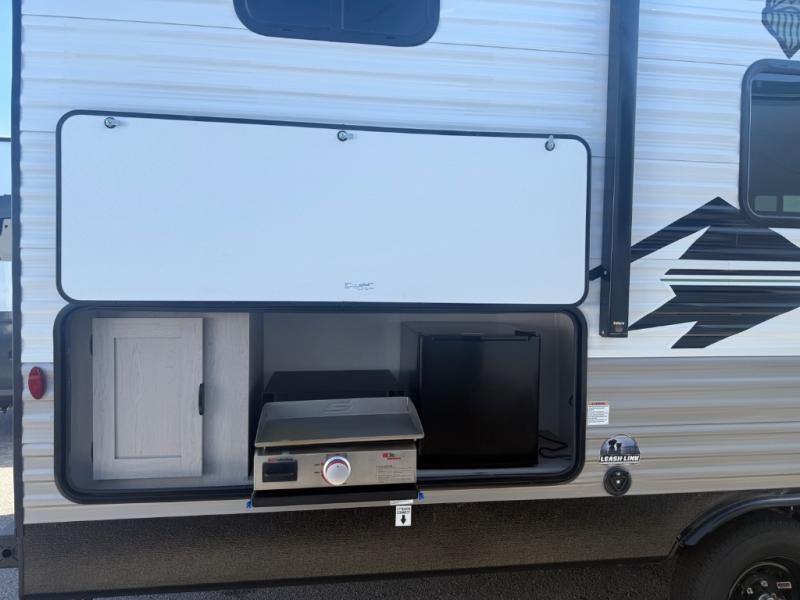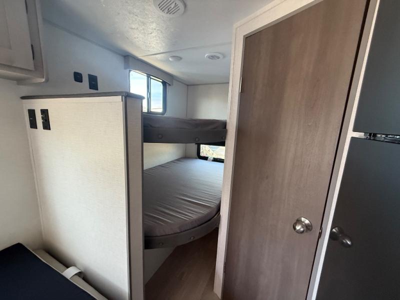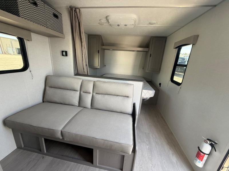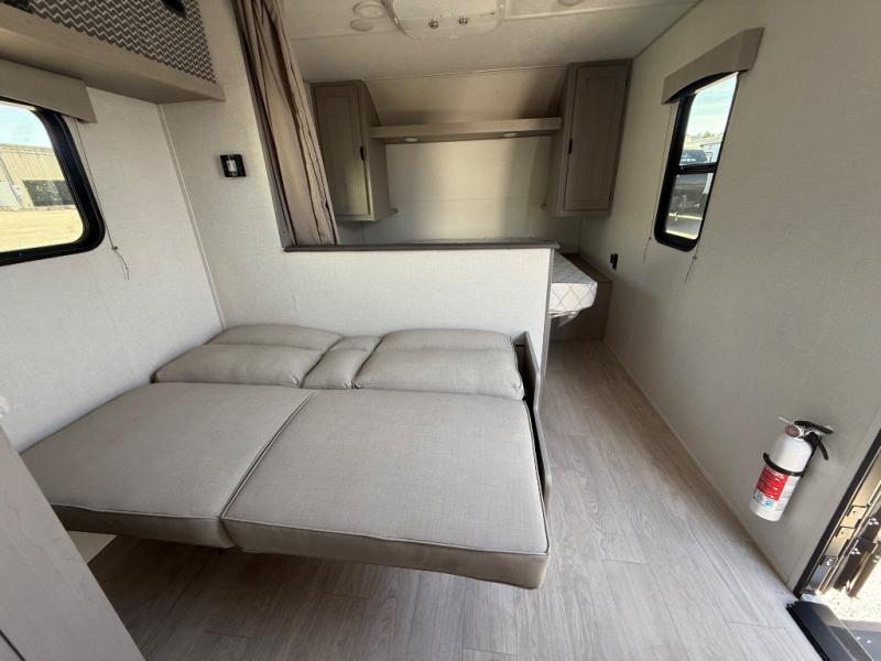 Bring the whole family with you in this travel trailer! The kiddos can sleep on the rear corner set of double-size bunks. The opposite rear corner features a full bath including a 24" x 36" shower, linen cabinet, toilet, and vanity. In the main living space, you will find plenty of seating with a booth dinette and jackknife sofa which can also transform into an extra sleeping space if needed. Everyone's bellies will stay full with the induction cooktop, 10 cu. ft. 12-volt refrigerator, and microwave which you can use to pop a bag of popcorn for movie night. You will enjoy the front bedroom for a bit of privacy including a queen bed and large overhead shelf for your things. On the outside, a large front pass-through for lawn chairs and camp gear. There is more storage beneath the bunks in back and a nice 15' awning to provide protection from the elements when outdoors.