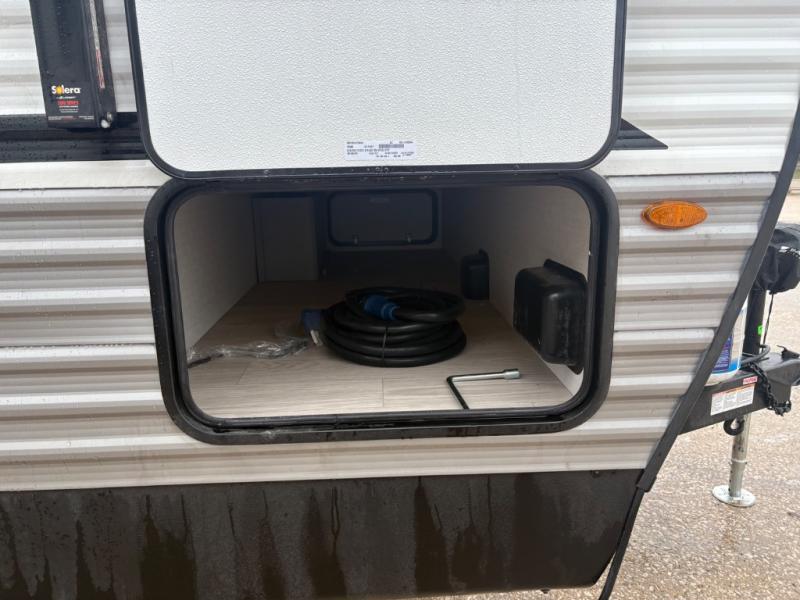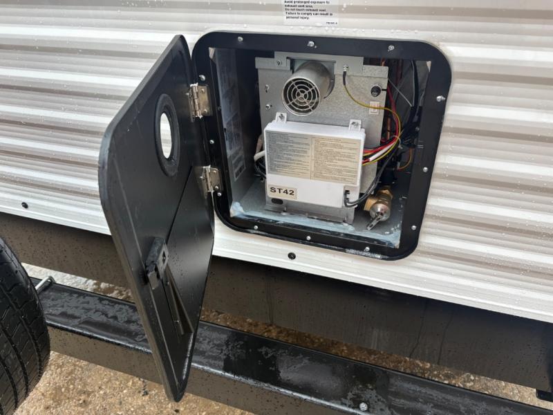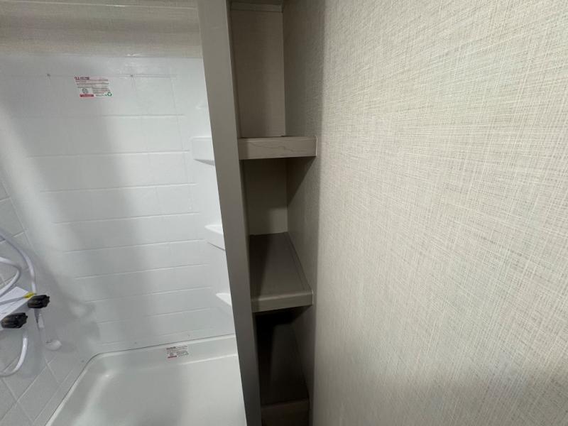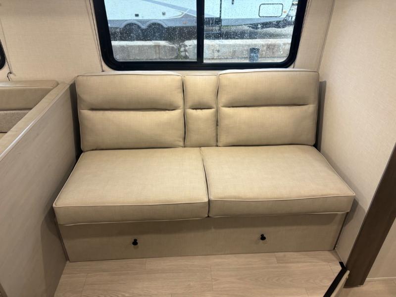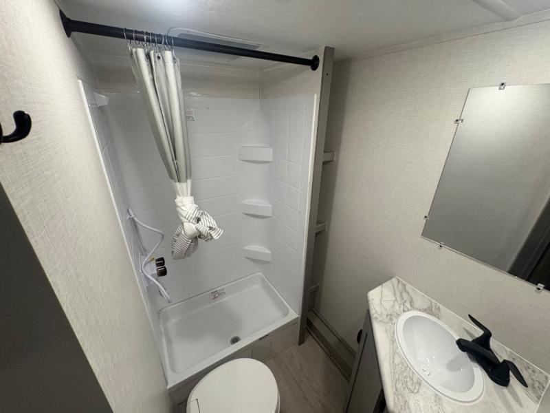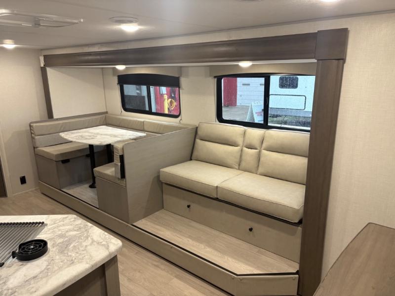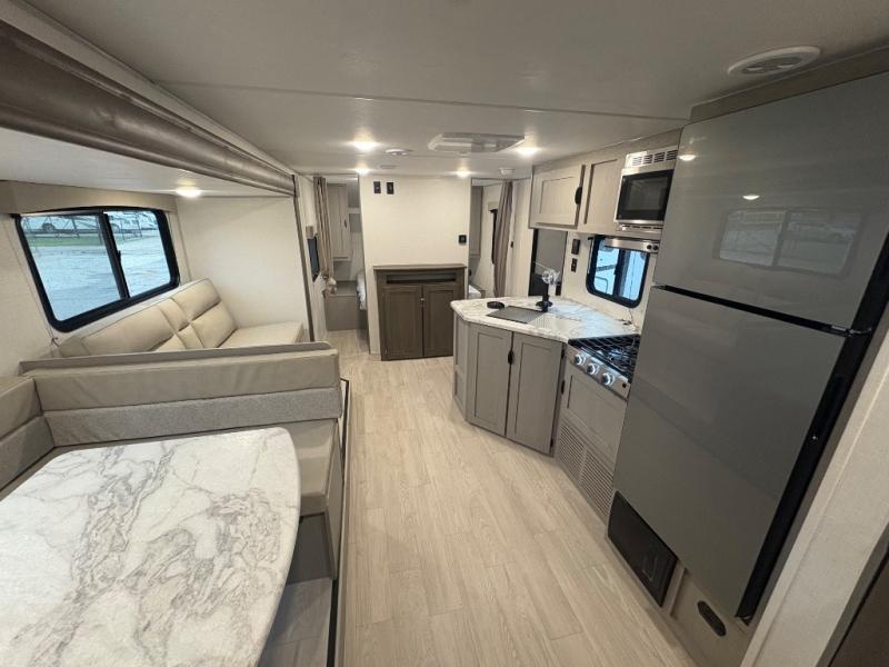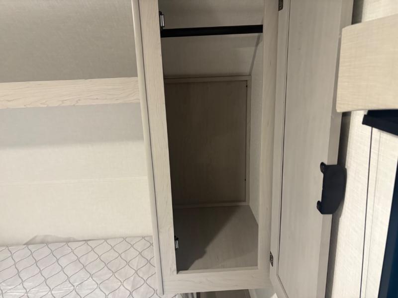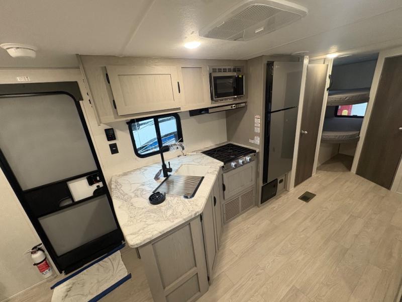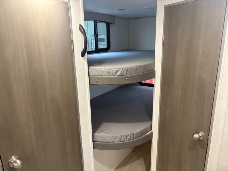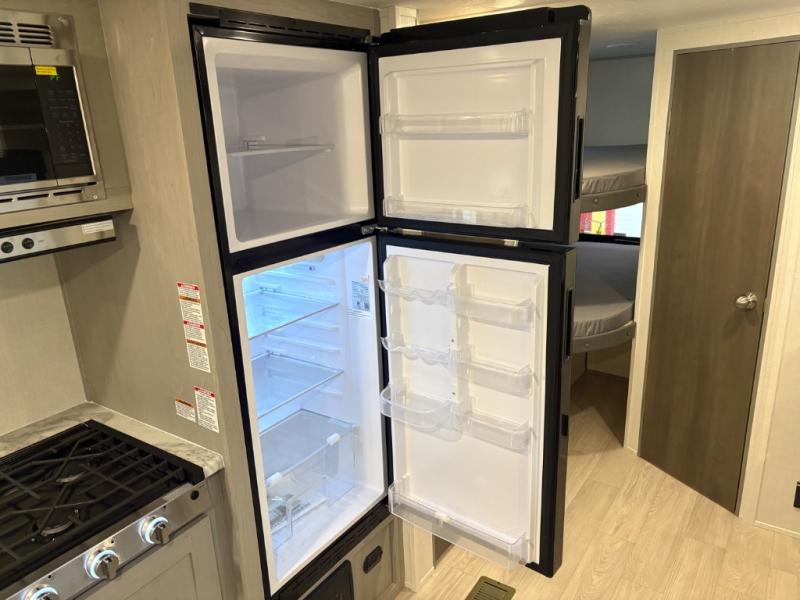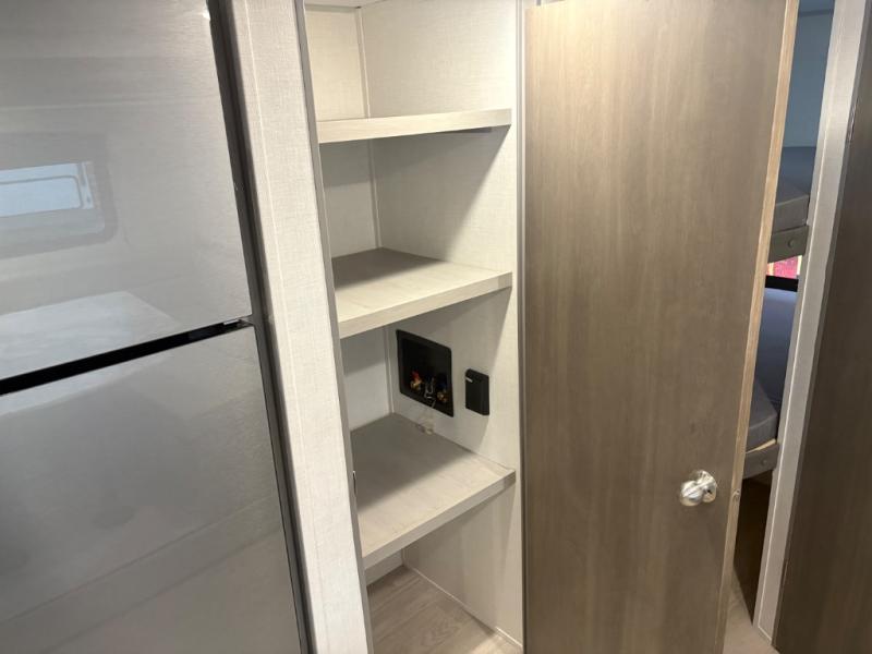 Pack your bags and head to the campground in this spacious travel trailer for the whole gang! The owners will love having their own space in the front private bedroom, complete with an RV queen bed and dual wardrobes and shelves. There are double-size bunks in the rear corner, with the full bath in the other rear corner for easy nighttime use. Everyone can meet in the combined living area and kitchen while the cook makes breakfast. There is a sofa and dinette within the large slide out and an entertainment center with an optional fireplace if you want to make this space more cozy. This unit also includes a large pantry with washer and dryer prep, giving you the option to add these appliances, and an optional camp kitchen can be added for the cook who loves being outdoors!