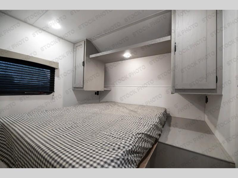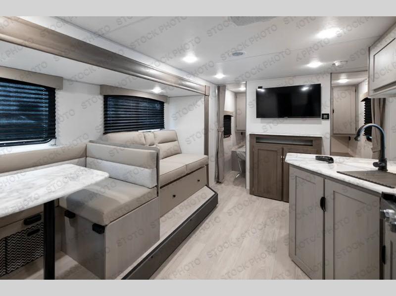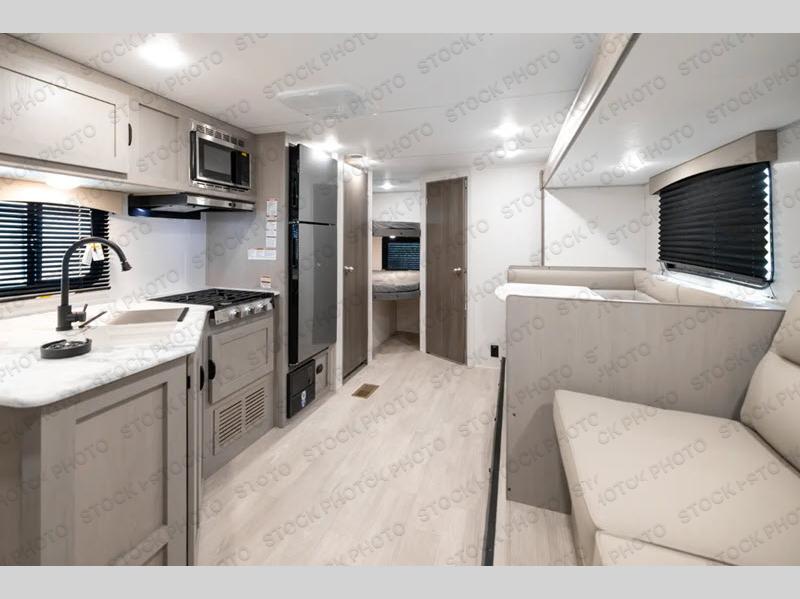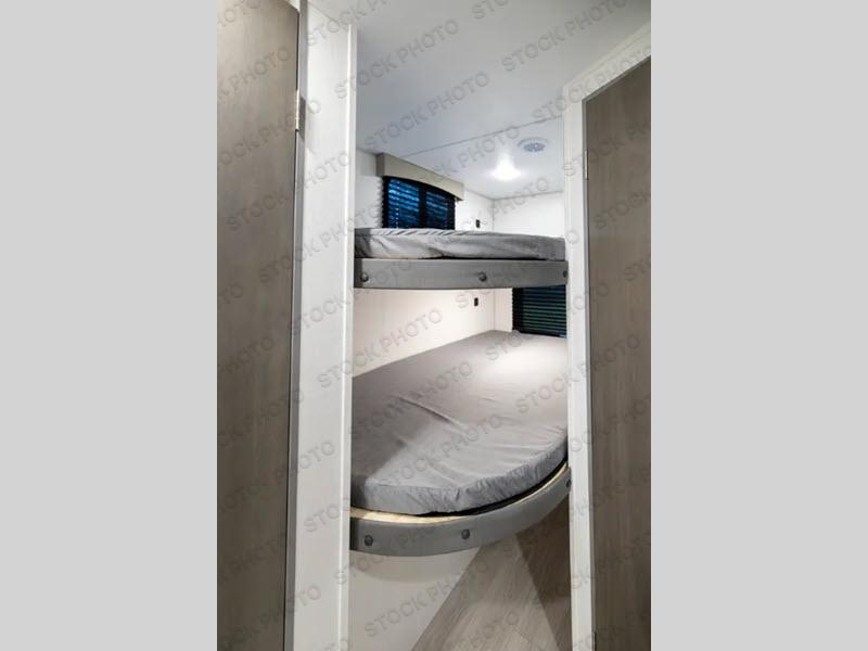 Pack your bags and head to the campground in this spacious travel trailer for the whole gang! The owners will love having their own space in the front private bedroom, complete with an RV queen bed and dual wardrobes and shelves. There are double-size bunks in the rear corner, with the full bath in the other rear corner for easy nighttime use. Everyone can meet in the combined living area and kitchen while the cook makes breakfast. There is a sofa and dinette within the large slide out and an entertainment center with an optional fireplace if you want to make this space more cozy. This unit also includes a large pantry with washer and dryer prep, giving you the option to add these appliances, and an optional camp kitchen can be added for the cook who loves being outdoors!