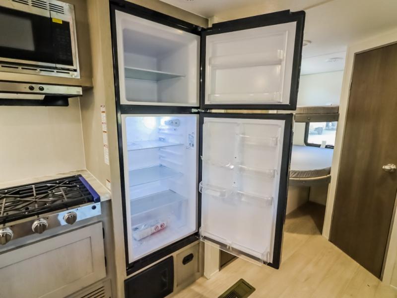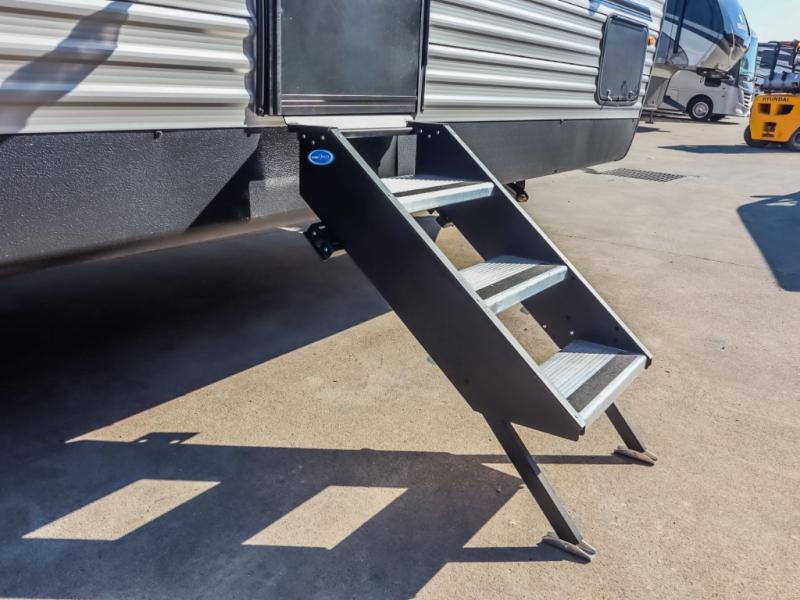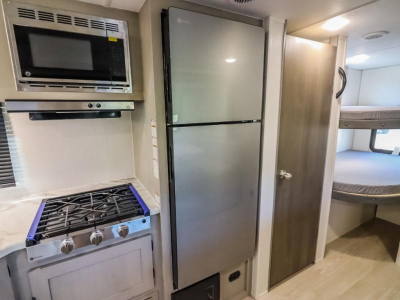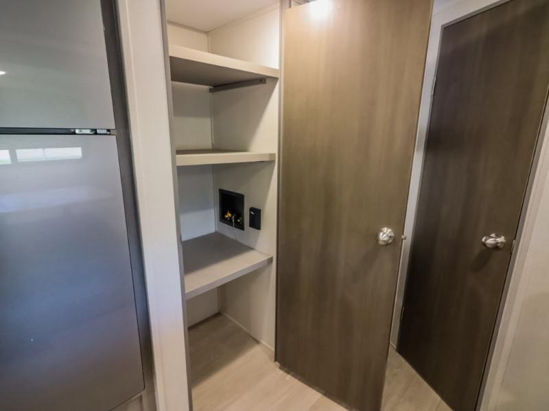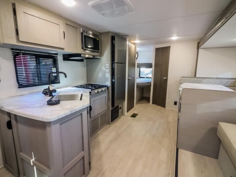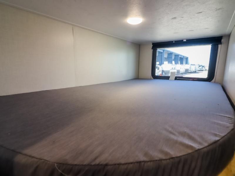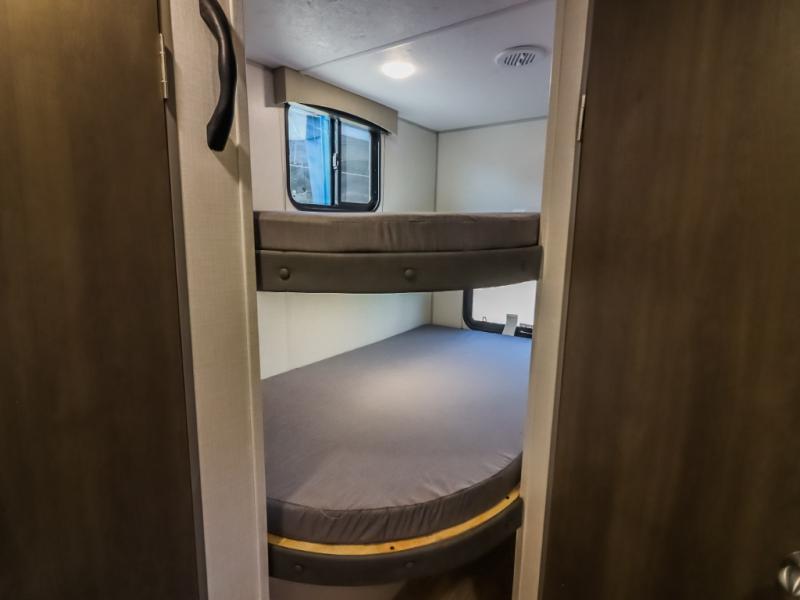Pack your bags and head to the campground in this spacious travel trailer for the whole gang! The owners will love having their own space in the front private bedroom, complete with an RV queen bed and dual wardrobes and shelves. There are double-size bunks in the rear corner, with the full bath in the other rear corner for easy nighttime use. Everyone can meet in the combined living area and kitchen while the cook makes breakfast. There is a sofa and dinette within the large slide out and an entertainment center with an optional fireplace if you want to make this space more cozy. This unit also includes a large pantry with washer and dryer prep, giving you the option to add these appliances, and an optional camp kitchen can be added for the cook who loves being outdoors!