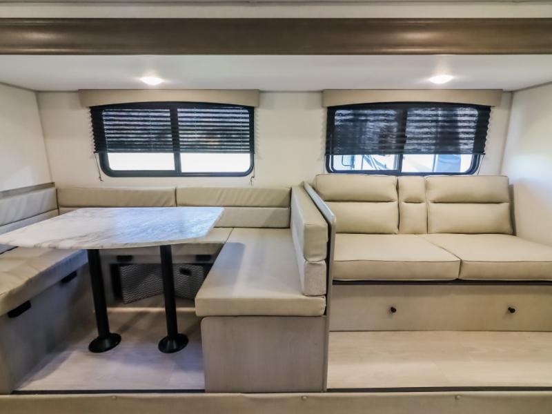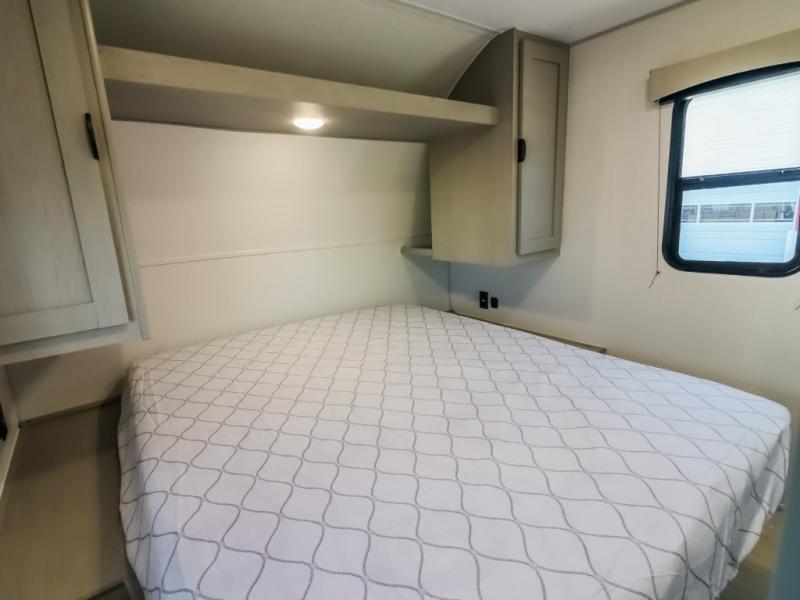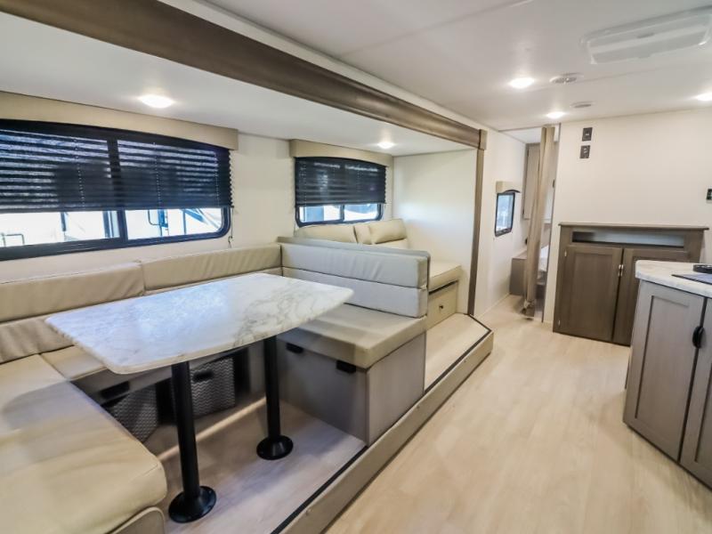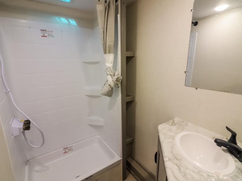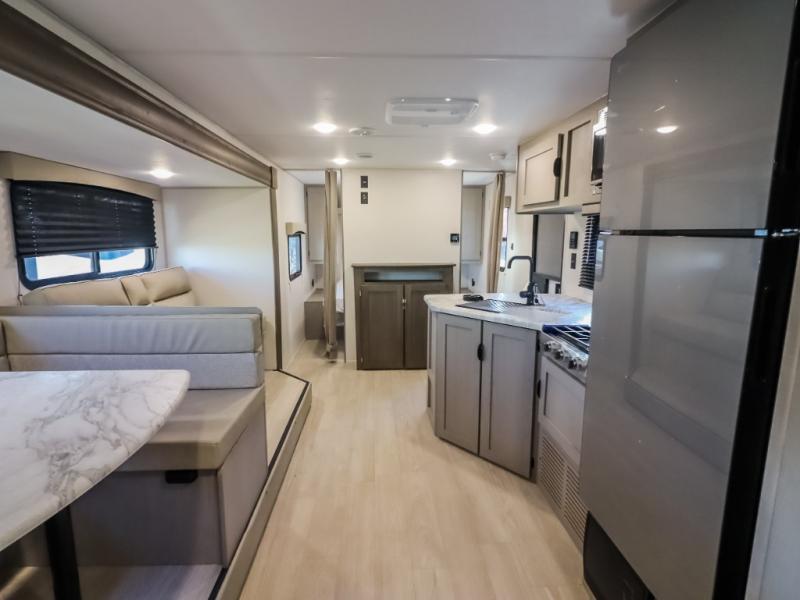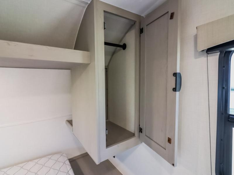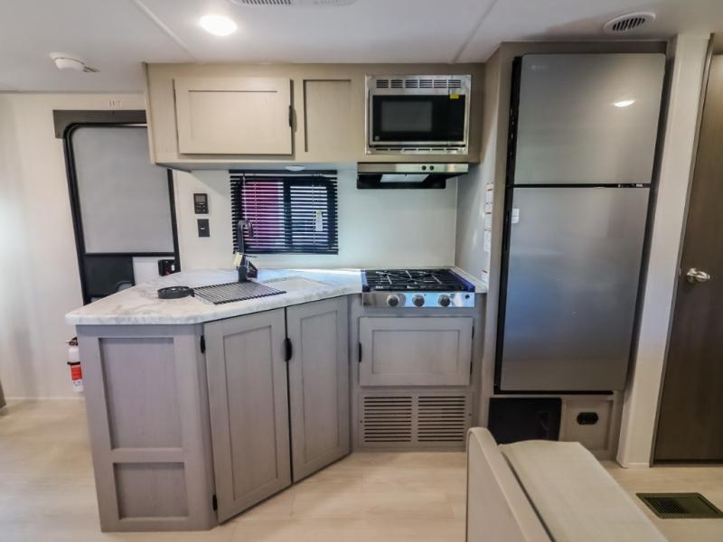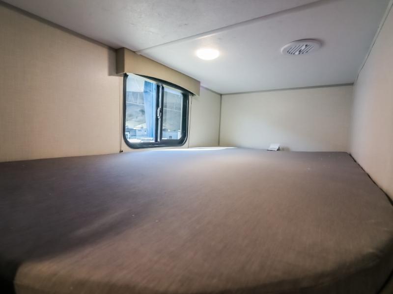 Pack your bags and head to the campground in this spacious travel trailer for the whole gang! The owners will love having their own space in the front private bedroom, complete with an RV queen bed and dual wardrobes and shelves. There are double-size bunks in the rear corner, with the full bath in the other rear corner for easy nighttime use. Everyone can meet in the combined living area and kitchen while the cook makes breakfast. There is a sofa and dinette within the large slide out and an entertainment center with an optional fireplace if you want to make this space more cozy. This unit also includes a large pantry with washer and dryer prep, giving you the option to add these appliances, and an optional camp kitchen can be added for the cook who loves being outdoors!
