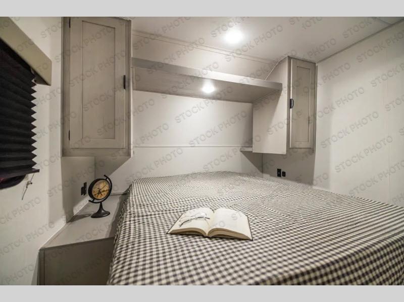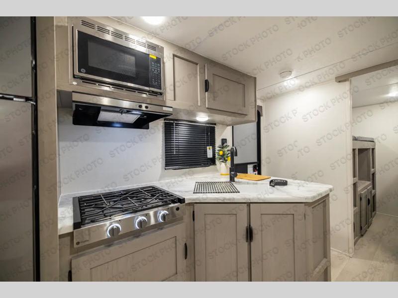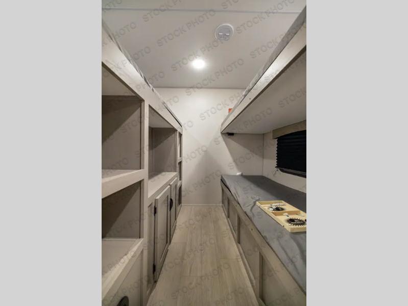 Everything you've been looking for in a travel trailer is found with this unit! The 21' power awning can be set up when you get to the campground, then you can unload the pass-thru storage and place some chairs under the awning. Once inside, you can put your things away in the front master bedroom that includes an RV queen bed and dual bedside wardrobes, plus you'll have a private entrance into the dual entry bath. The bath also includes one of the dual entry doors to the unit to make it easier to use when you're spending time outdoors. In the combined kitchen and living area you'll find a large slide out, a U-shaped dinette and sofa, plus a pantry with washer and dryer prep if you plan to go full-time. Another great feature on this travel trailer is the rear private bunkhouse! There are two 28" x 72" bunk beds on one side and across we have two 38" x 72" bunks, providing ample space for the whole gang to join the trip and have a place to rest.