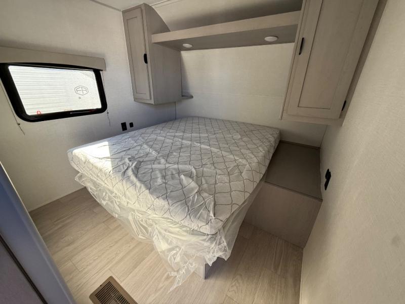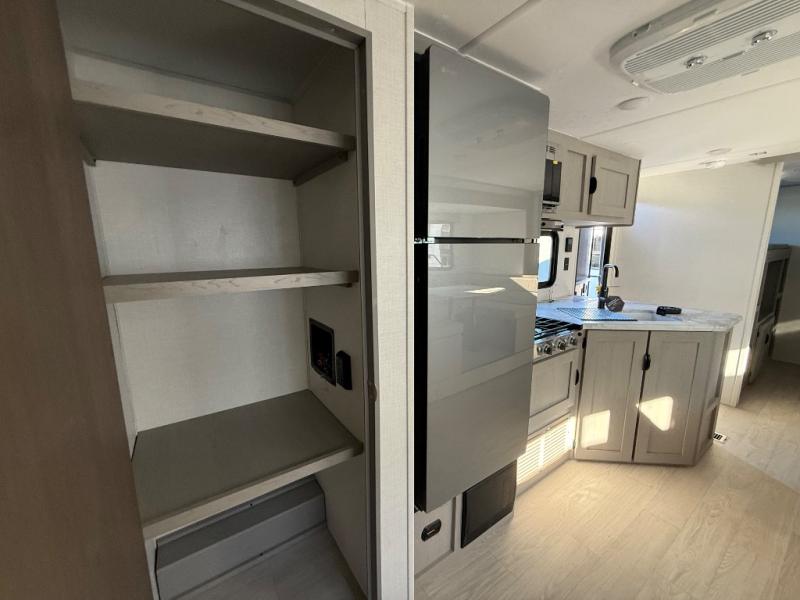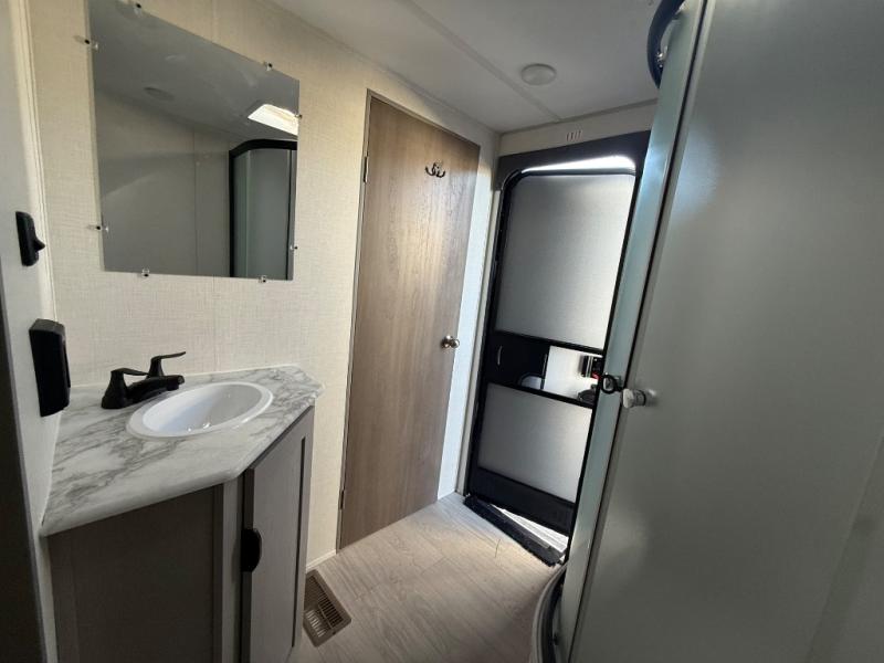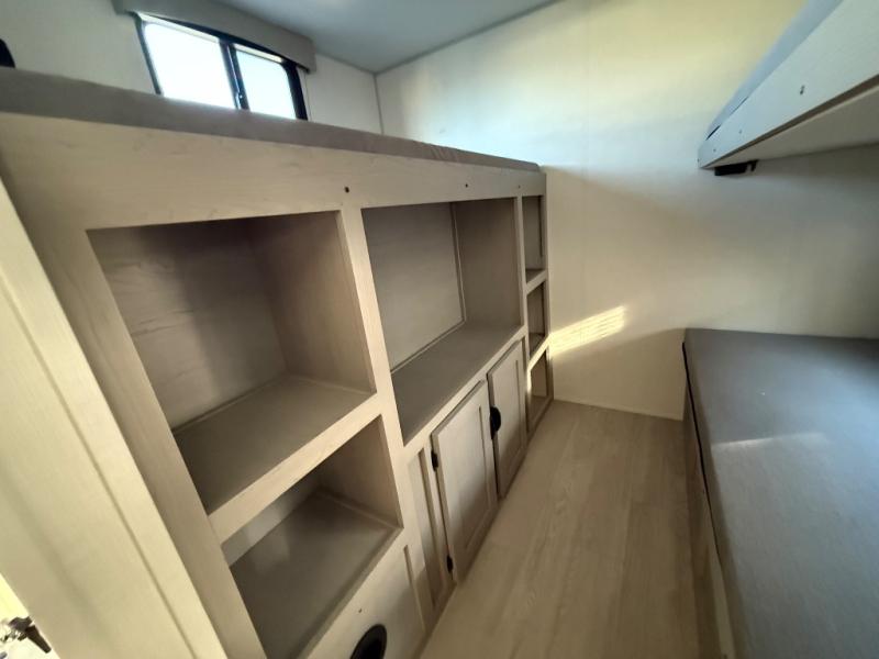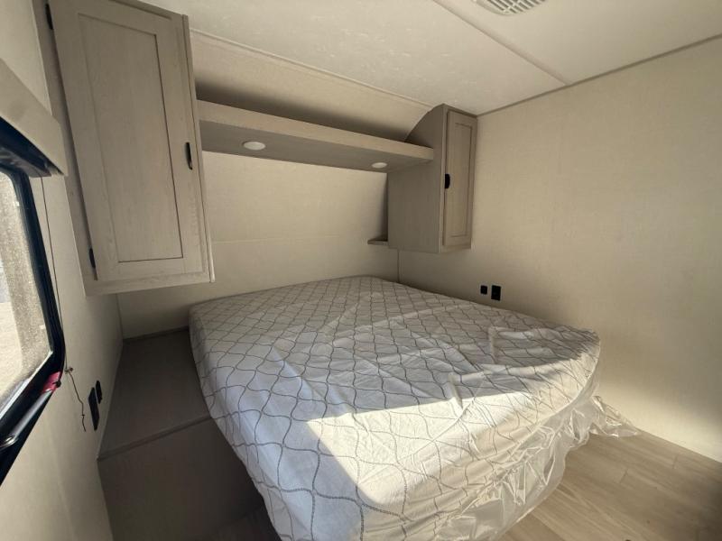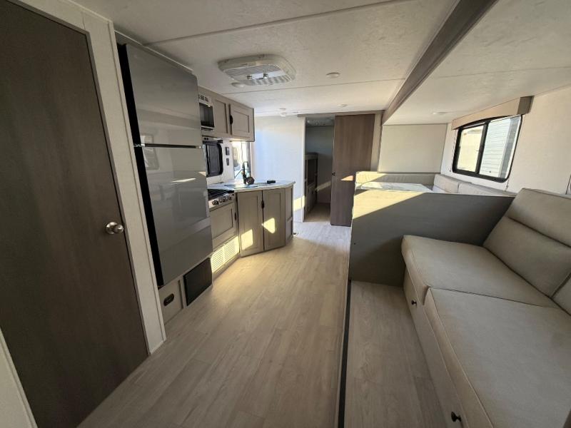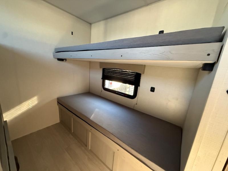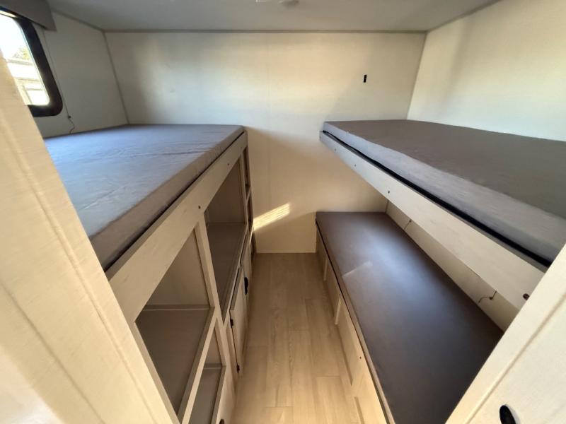 Everything you've been looking for in a travel trailer is found with this unit! The 21' power awning can be set up when you get to the campground, then you can unload the pass-thru storage and place some chairs under the awning. Once inside, you can put your things away in the front master bedroom that includes an RV queen bed and dual bedside wardrobes, plus you'll have a private entrance into the dual entry bath. The bath also includes one of the dual entry doors to the unit to make it easier to use when you're spending time outdoors. In the combined kitchen and living area you'll find a large slide out, a U-shaped dinette and sofa, plus a pantry with washer and dryer prep if you plan to go full-time. Another great feature on this travel trailer is the rear private bunkhouse! There are two 28" x 72" bunk beds on one side and across we have two 38" x 72" bunks, providing ample space for the whole gang to join the trip and have a place to rest.
