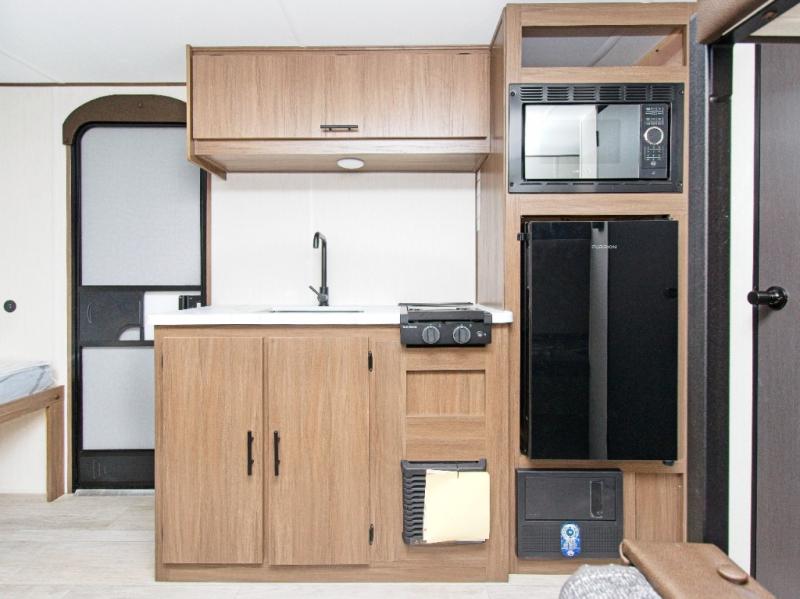- 12V refrigerator, flush-mount 2-burner range, and microwave
