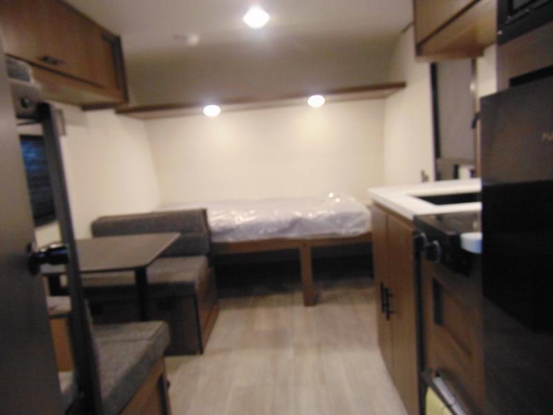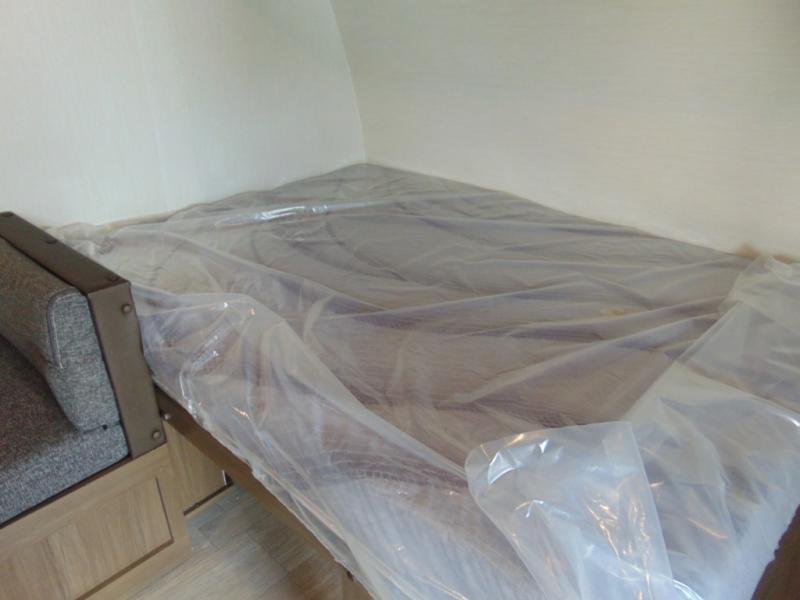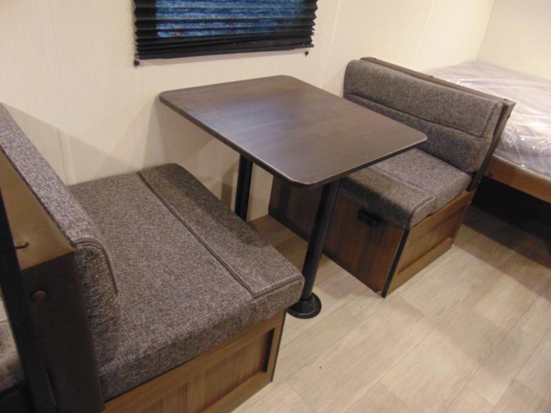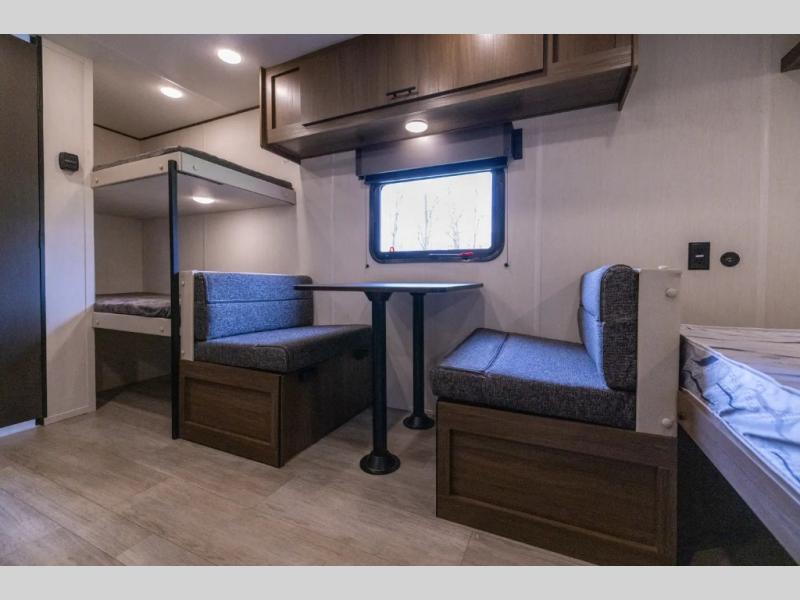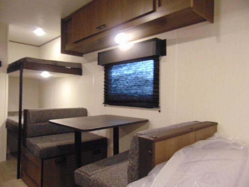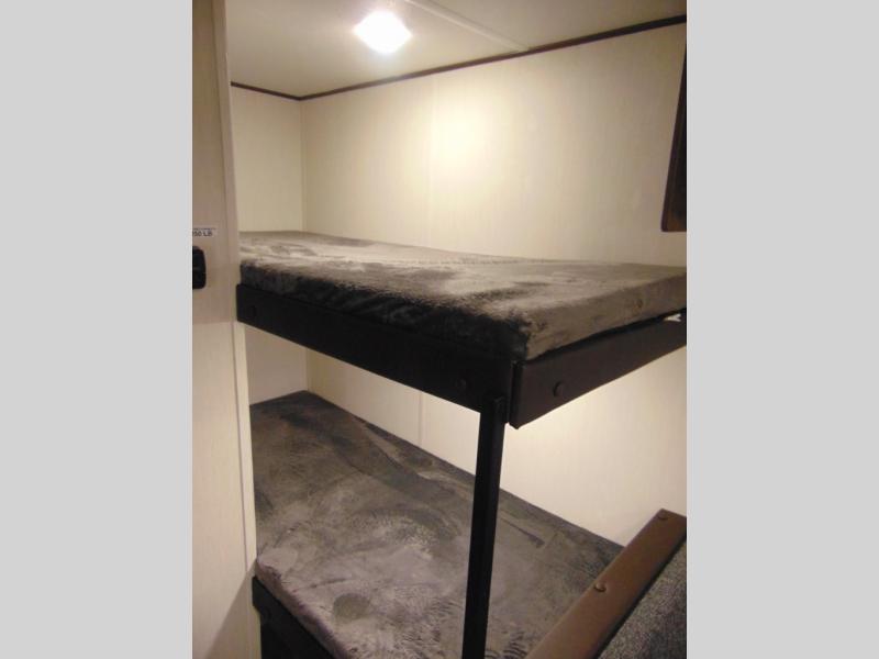 Pack your bags and head to your favorite camping spot with this cozy travel trailer. Once you've unloaded the outside storage and put out the 10' awning, you can head inside to make lunch on the two burner range or in the electric microwave oven. There is also a 12V refrigerator and overhead cabinets to store your food and essentials, and the booth dinette will provide a place to dine together. Whether you have littles ones or guests tagging along, the bunk beds in the rear corner will provide comfortable and compact sleeping spaces, while you take the front queen bed with a large overhead shelf. And the full bath onboard with a tub/shower and a toilet means you won't have to leave your camper in the middle of the night!