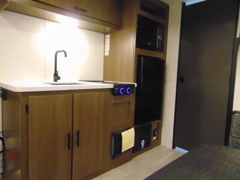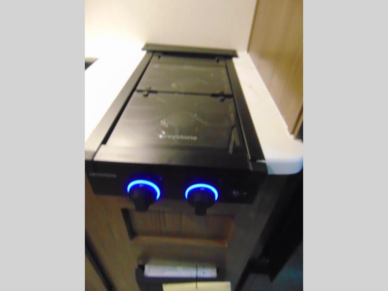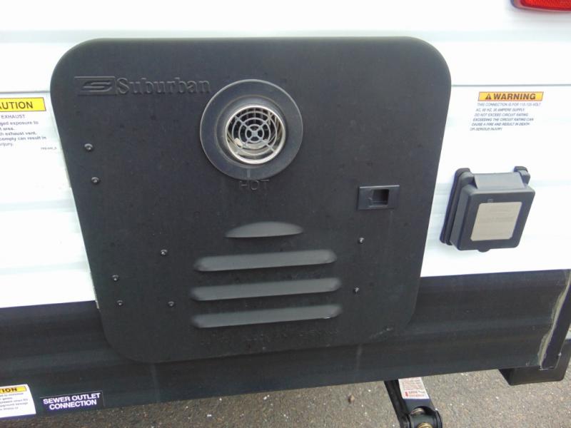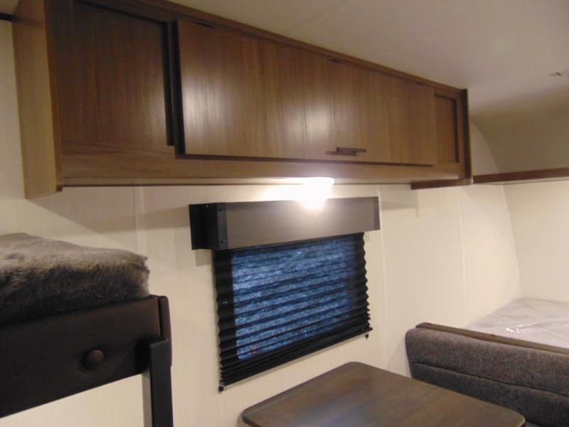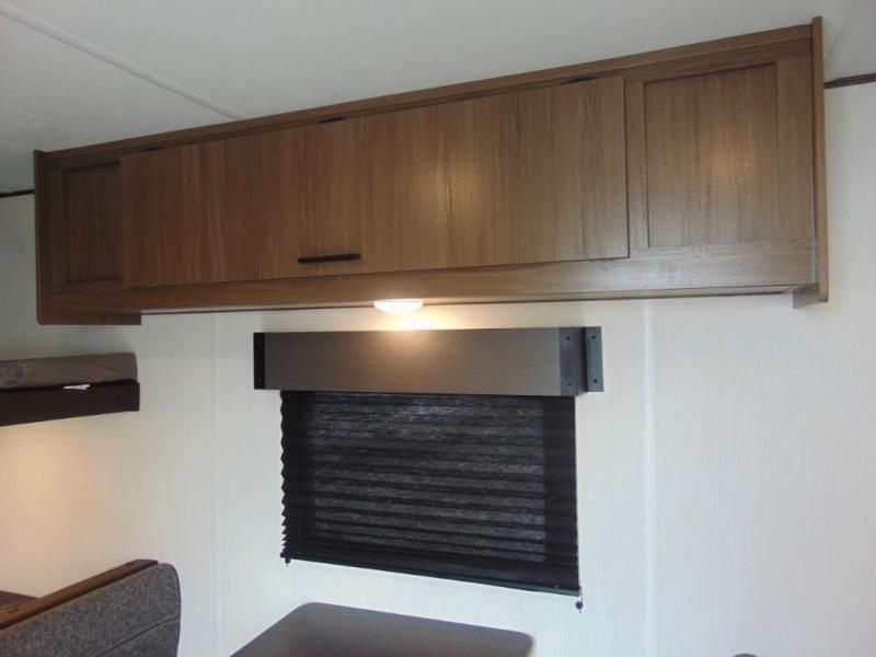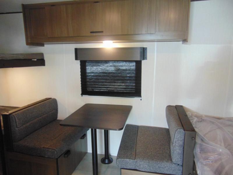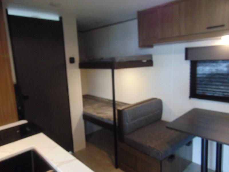 Pack your bags and head to your favorite camping spot with this cozy travel trailer. Once you've unloaded the outside storage and put out the 10' awning, you can head inside to make lunch on the two burner range or in the electric microwave oven. There is also a 12V refrigerator and overhead cabinets to store your food and essentials, and the booth dinette will provide a place to dine together. Whether you have littles ones or guests tagging along, the bunk beds in the rear corner will provide comfortable and compact sleeping spaces, while you take the front queen bed with a large overhead shelf. And the full bath onboard with a tub/shower and a toilet means you won't have to leave your camper in the middle of the night!