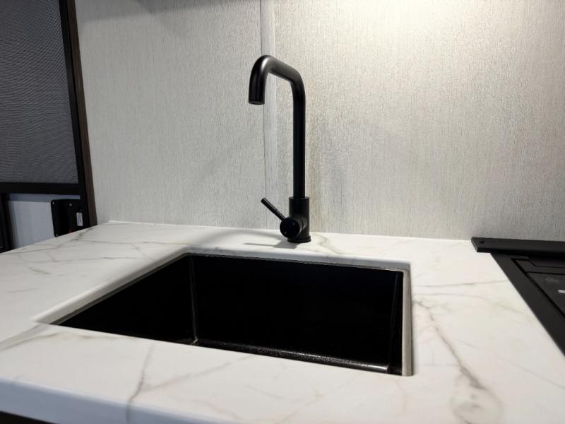 - Flush-mount stainless steel sink with TuffCoat and high-rise faucet