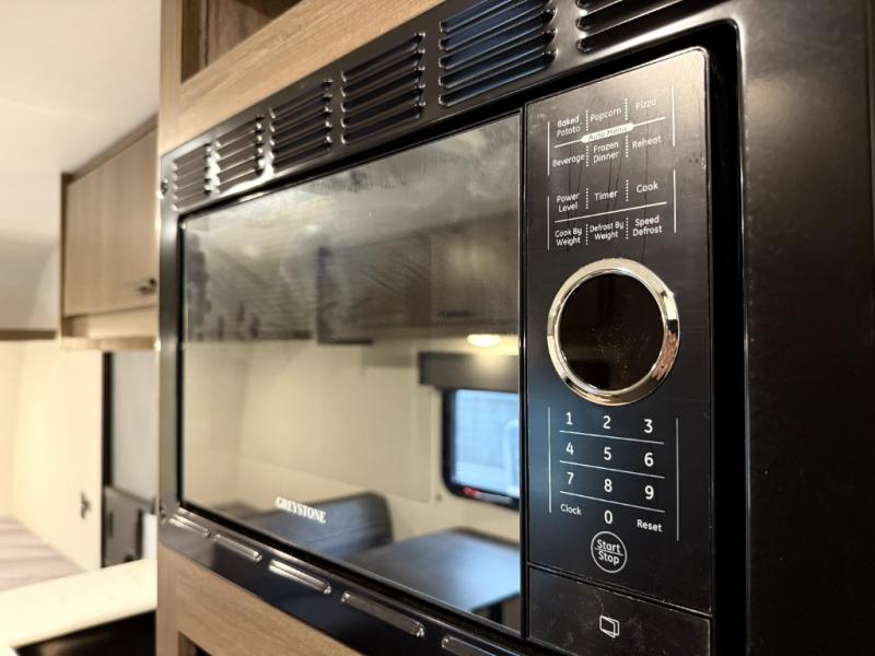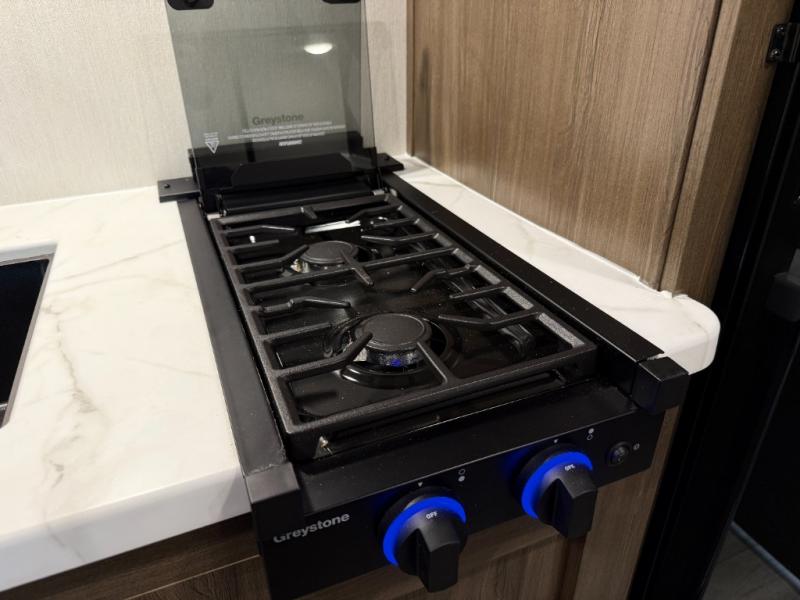 - 12V refrigerator, flush-mount 2-burner range, and microwave