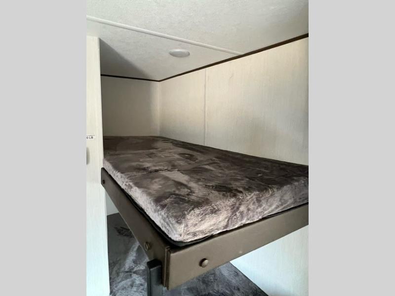 Pack your bags and head to your favorite camping spot with this cozy travel trailer. Once you've unloaded the outside storage and put out the 10' awning, you can head inside to make lunch on the two burner range or in the electric microwave oven. There is also a 12V refrigerator and overhead cabinets to store your food and essentials, and the booth dinette will provide a place to dine together. Whether you have littles ones or guests tagging along, the bunk beds in the rear corner will provide comfortable and compact sleeping spaces, while you take the front queen bed with a large overhead shelf. And the full bath onboard with a tub/shower and a toilet means you won't have to leave your camper in the middle of the night!