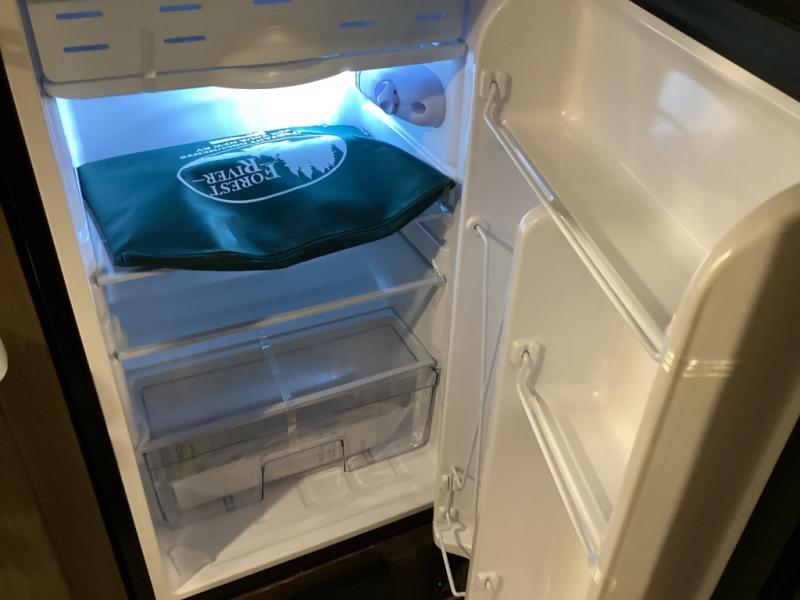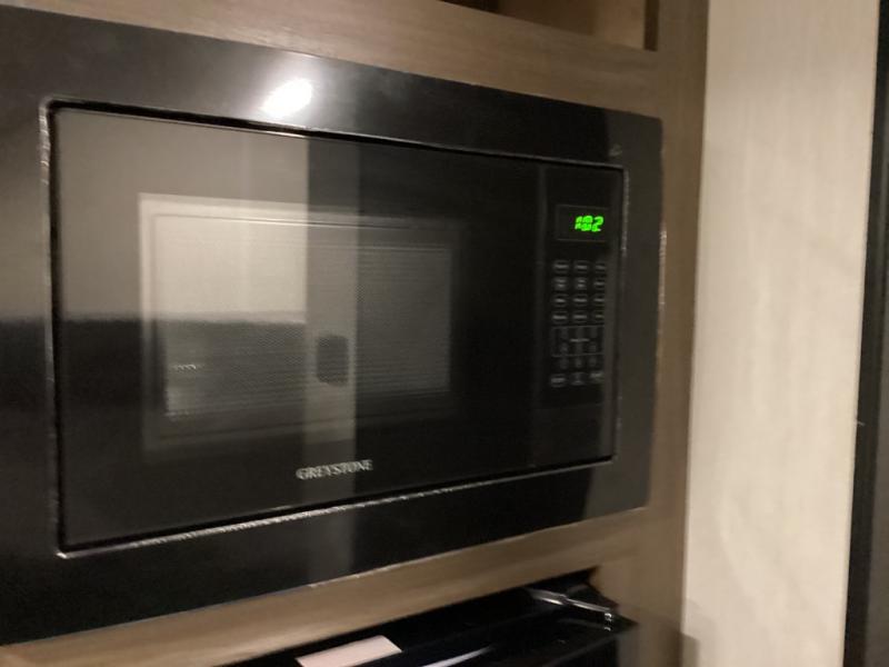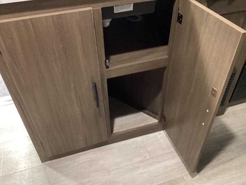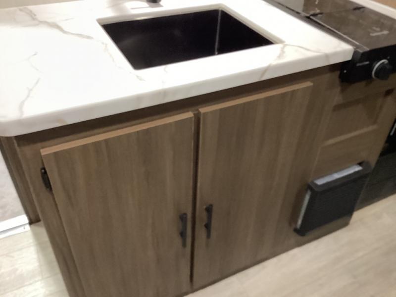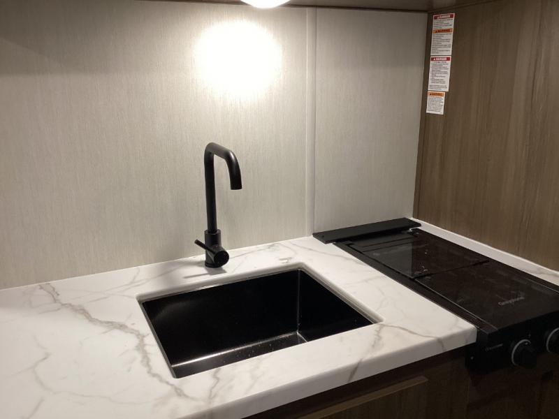 Includes a flush-mount two-burner range, stainless-steel sink, microwave, 12V fridge, and a convenient tankless water heater control for endless hot water -