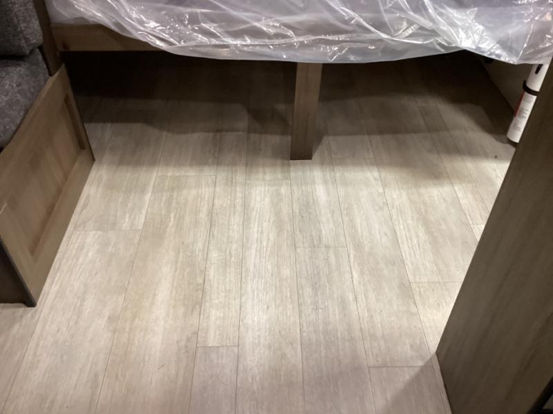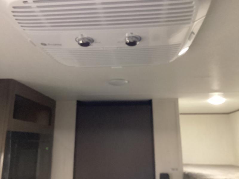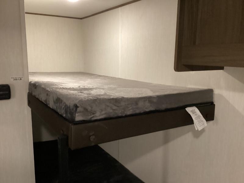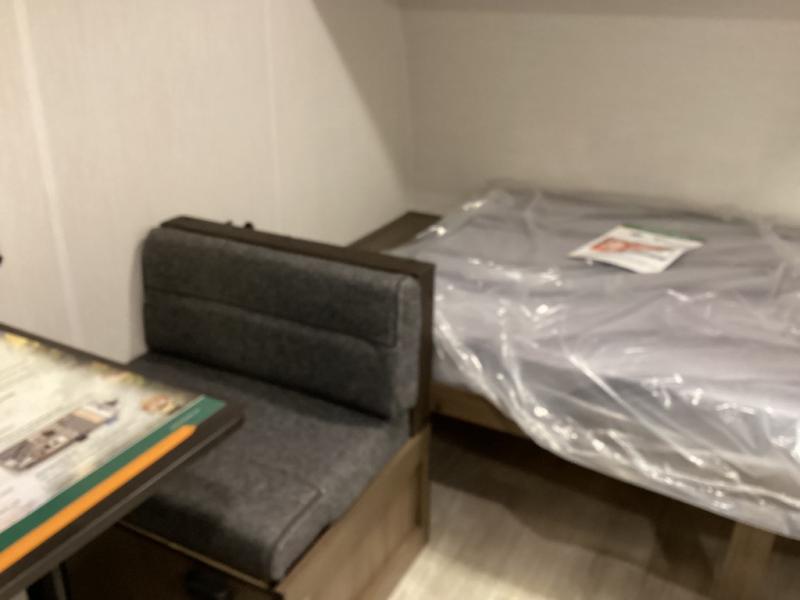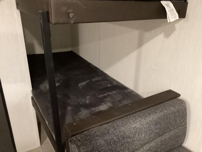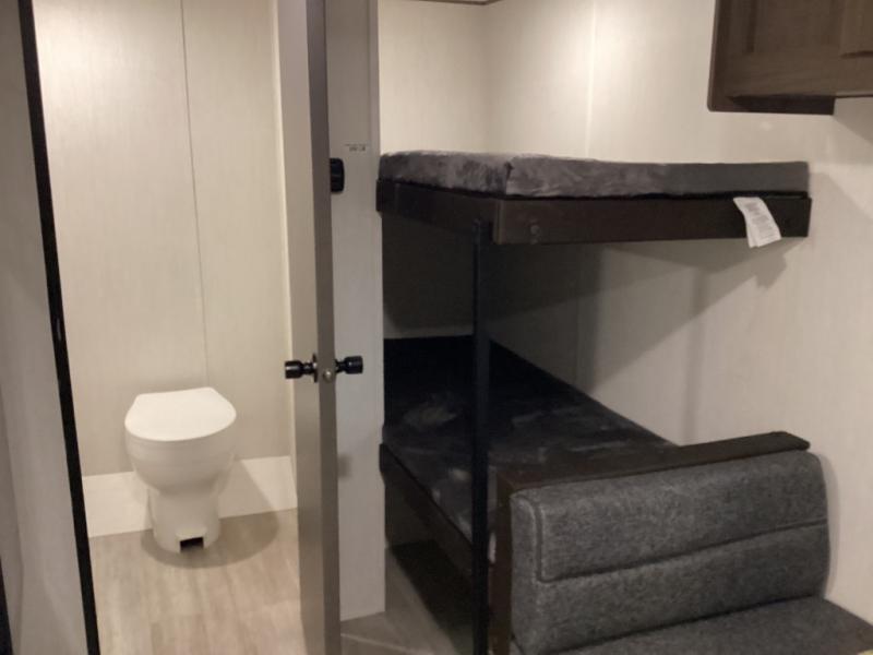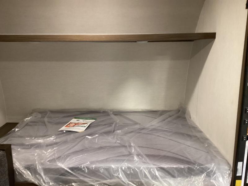 Cozy front queen bed paired with rear bunk beds makes room for up to five travelers. Central dinette folds into an extra sleep spot. Plush flooring, LED lights, and USB-C ports add comfort and convenience -