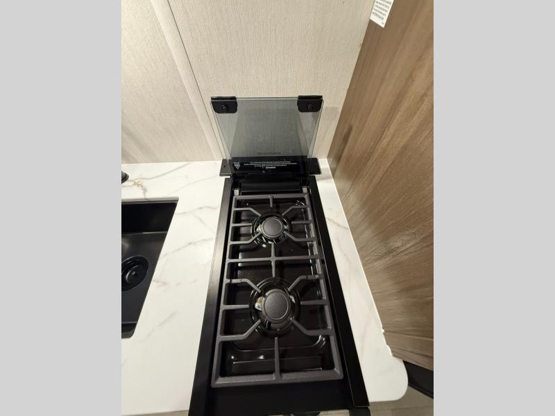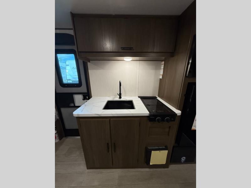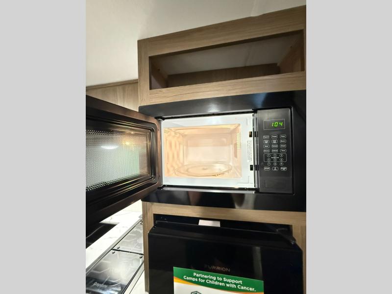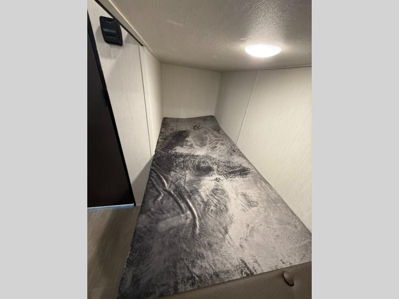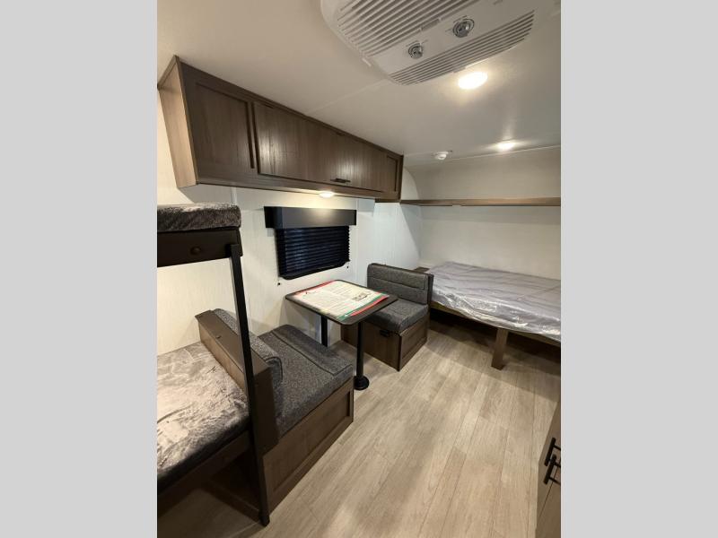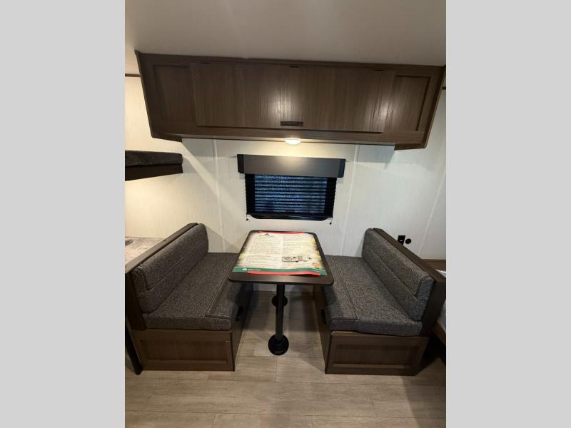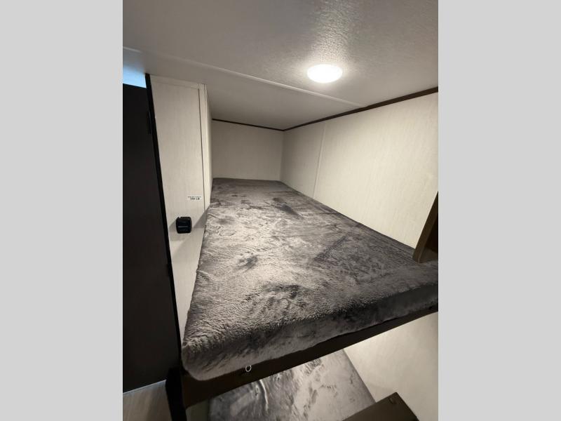 Pack your bags and head to your favorite camping spot with this cozy travel trailer. Once you've unloaded the outside storage and put out the 10' awning, you can head inside to make lunch on the two burner range or in the electric microwave oven. There is also a 12V refrigerator and overhead cabinets to store your food and essentials, and the booth dinette will provide a place to dine together. Whether you have littles ones or guests tagging along, the bunk beds in the rear corner will provide comfortable and compact sleeping spaces, while you take the front queen bed with a large overhead shelf. And the full bath onboard with a tub/shower and a toilet means you won't have to leave your camper in the middle of the night!
