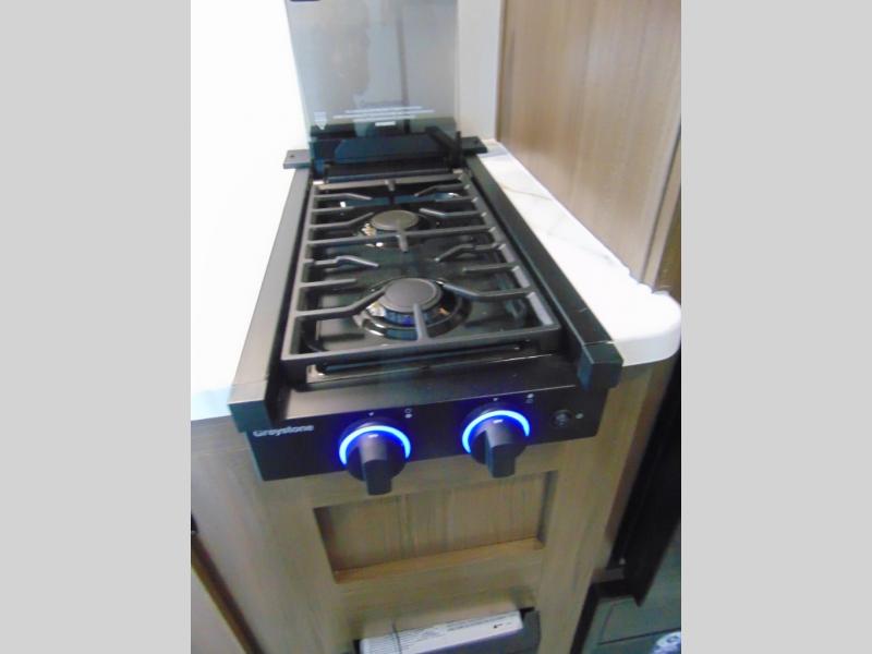- Kitchen with two-burner range, microwave oven, 12V refrigerator, and overhead cabinets