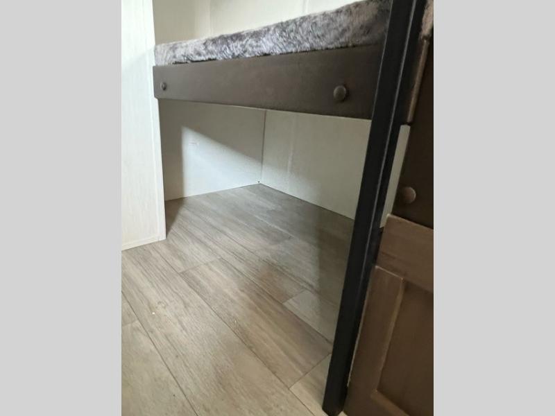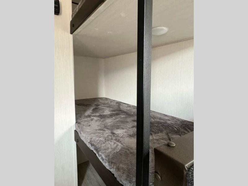 Pack your bags and head to your favorite camping spot with this cozy travel trailer. Once you've unloaded the outside storage and put out the 10' awning, you can head inside to make lunch on the two burner range or in the electric microwave oven. There is also a 12V refrigerator and overhead cabinets to store your food and essentials, and the booth dinette will provide a place to dine together. Whether you have littles ones or guests tagging along, the bunk beds in the rear corner will provide comfortable and compact sleeping spaces, while you take the front queen bed with a large overhead shelf. And the full bath onboard with a tub/shower and a toilet means you won't have to leave your camper in the middle of the night!