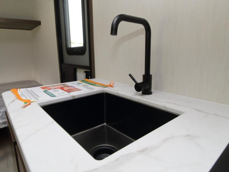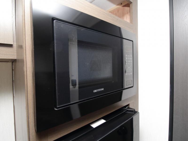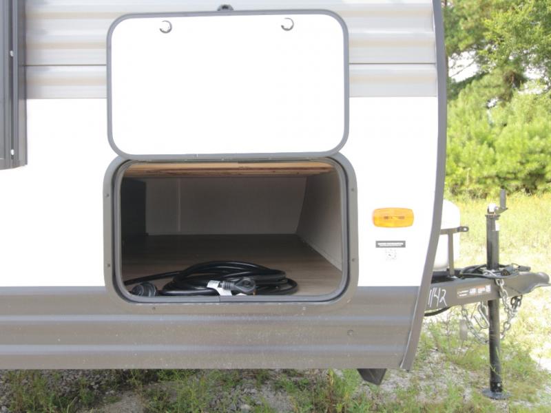 Cook simple meals on the two-burner range, electric microwave, and 12V refrigerator, then enjoy them together at the booth dinette. At night, you’ll appreciate having a full bathroom with a tub/shower and toilet, so you never need to leave your RV. Outside, the 10-foot power awning with LED lights extends your living space, while the pass-through storage keeps gear organized.