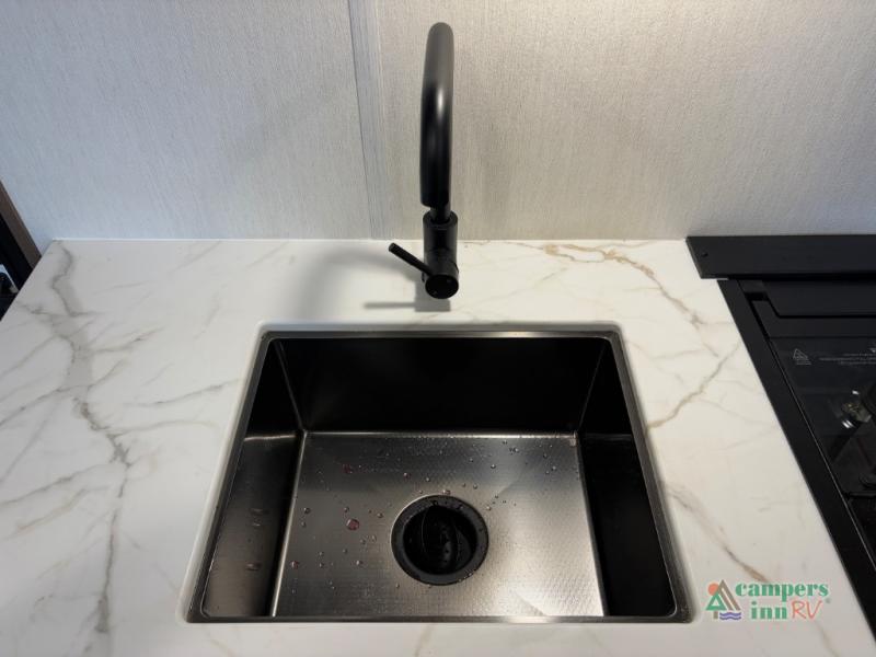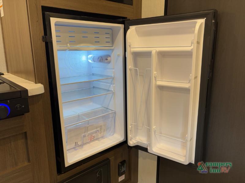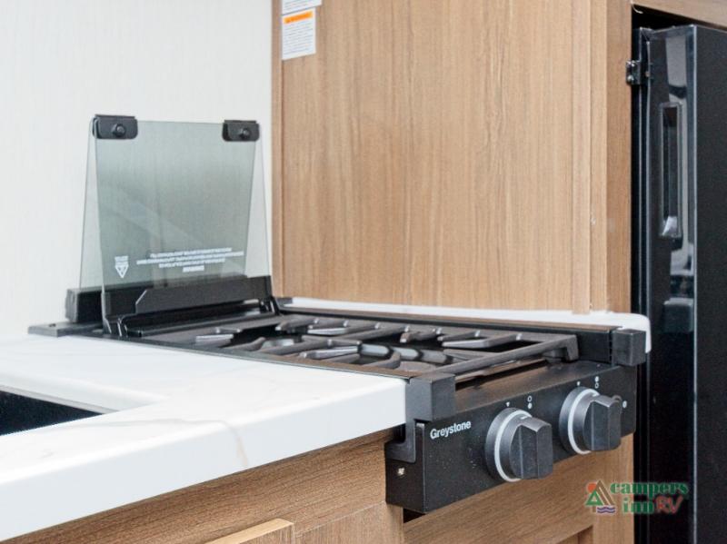 This rear-entry layout maximizes the interior space. Up front, you’ll find a cozy dinette that converts to a sleeping area, along with large panoramic windows that let in tons of natural light. Mid-coach is a functional galley kitchen complete with a two-burner cooktop, microwave, refrigerator, and overhead storage cabinets — perfect for making meals on the go.
