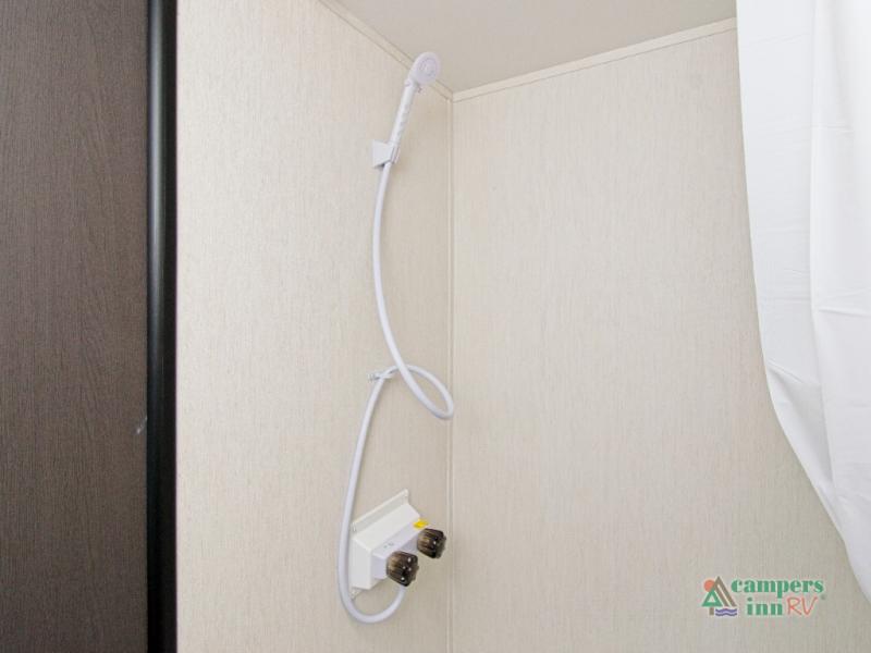 The highlight of the 16CC is its private corner bath — a rare find in a trailer this size. It includes a full shower, foot-flush toilet, and a vanity with storage. You’ll also find thoughtful touches like LED lighting, a Bluetooth stereo system, USB charging ports, and a multi-speed roof vent to keep things fresh and comfortable.