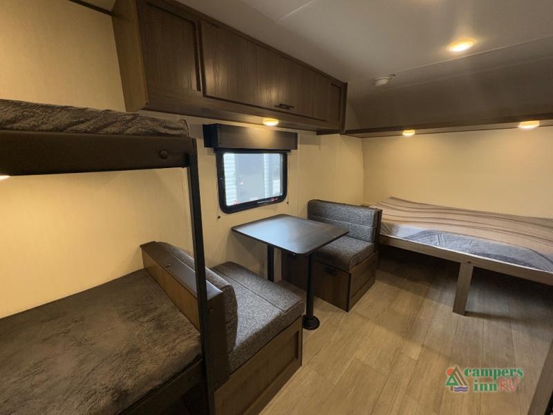 Pack your bags and head to your favorite camping spot with this cozy travel trailer. Once you've unloaded the outside storage and put out the 10' awning, you can head inside to make lunch on the two burner range or in the electric microwave oven. There is also a 12V refrigerator and overhead cabinets to store your food and essentials, and the booth dinette will provide a place to dine together. Whether you have littles ones or guests tagging along, the bunk beds in the rear corner will provide comfortable and compact sleeping spaces, while you take the front queen bed with a large overhead shelf. And the full bath onboard with a tub/shower and a toilet means you won't have to leave your camper in the middle of the night!